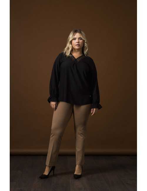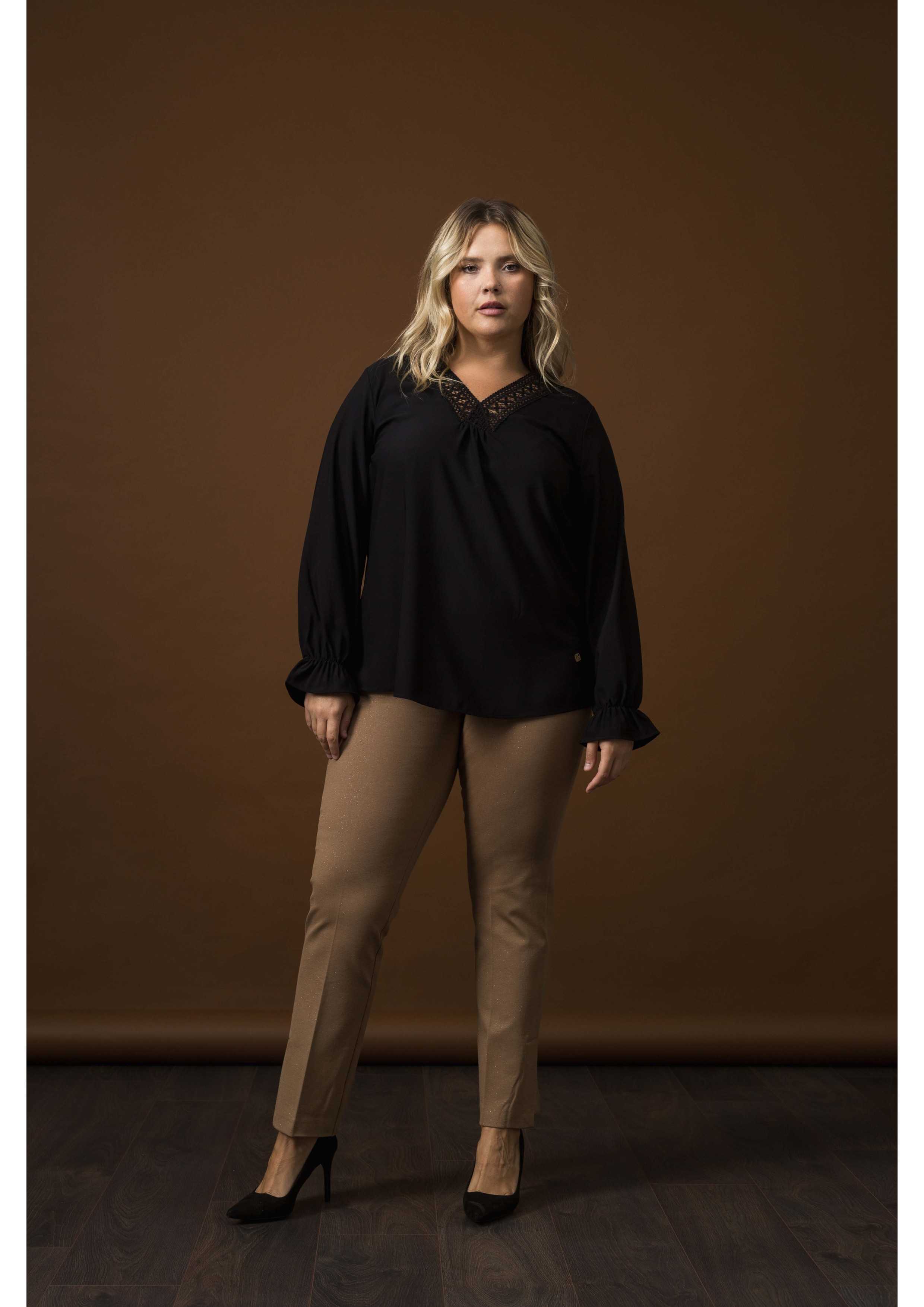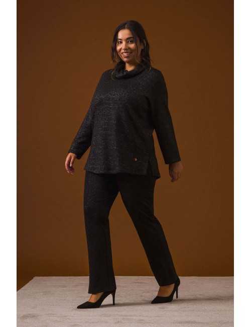 Roma knit pants, with lurex yarn, folded elastic at the waist, high slits with studs on the sides. Creased piece. Collection: Autumn Winter Available in Plus Sizes Own design and manufacturing product. We are a clothing manufacturing brand with over 50 years of experience Model: Height 1.63m wearing size 2XL, in black. Model: Height 1.70m wearing size 2XL, in camel. Composition: 64% Polyester 31% Viscose 5% Elastane