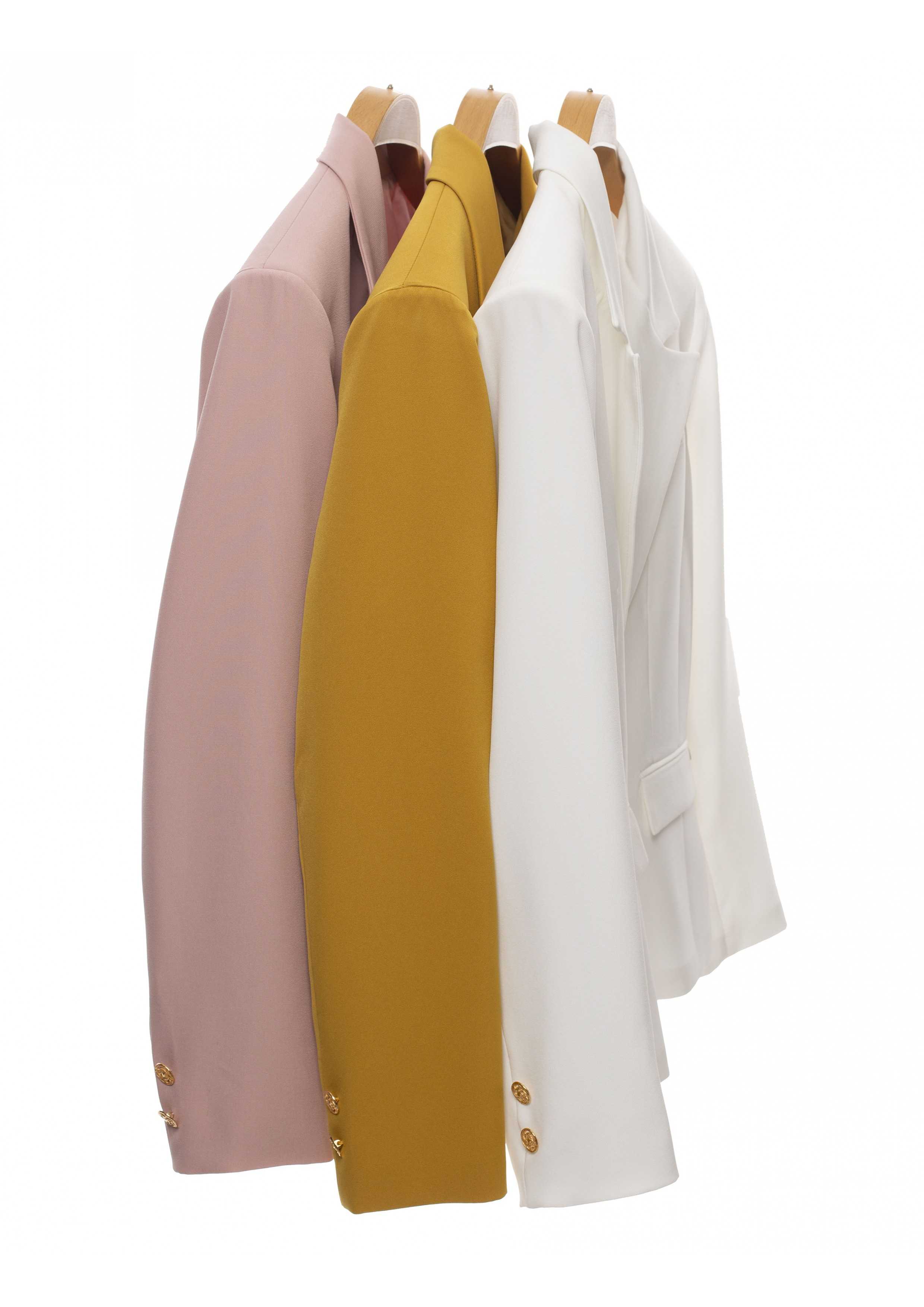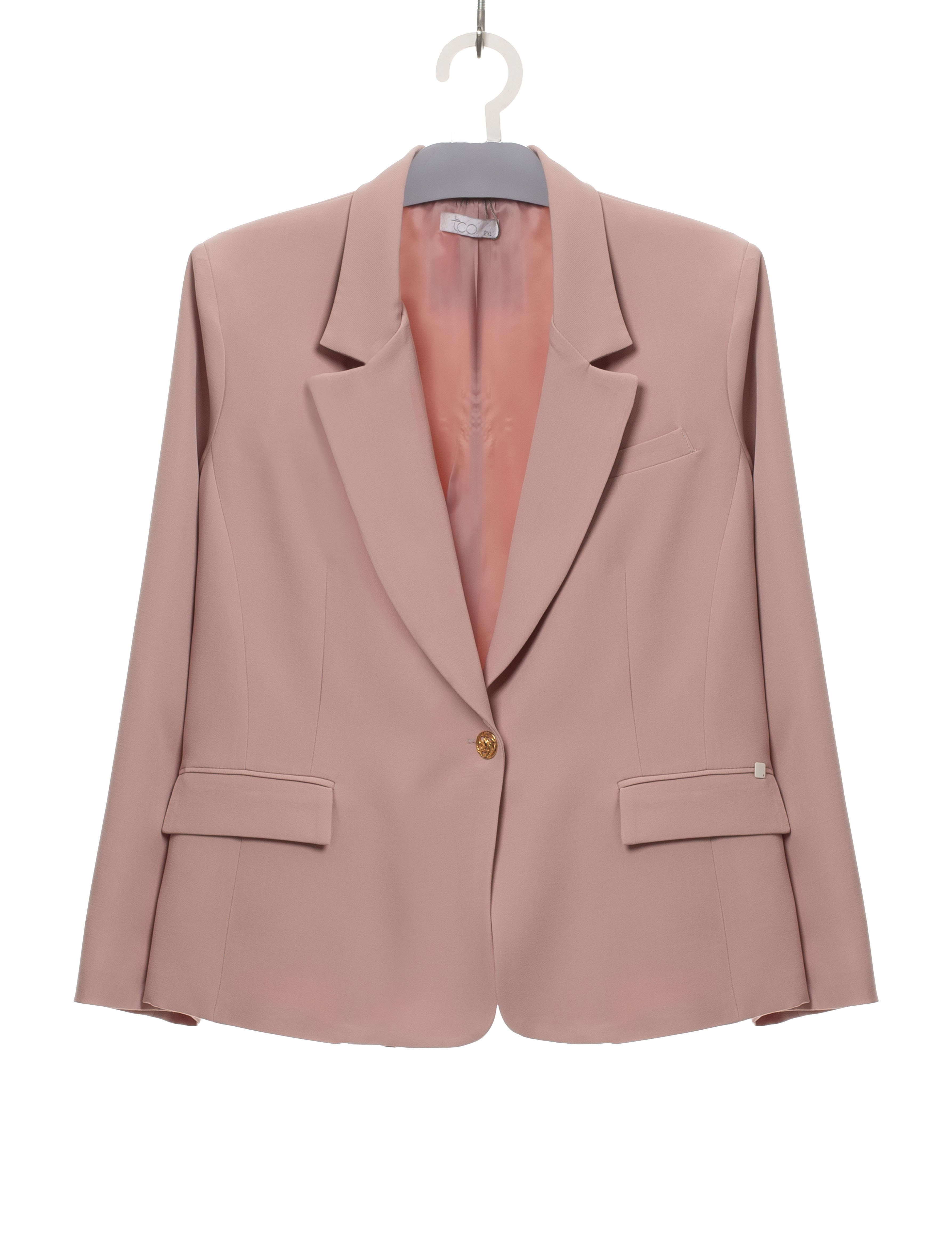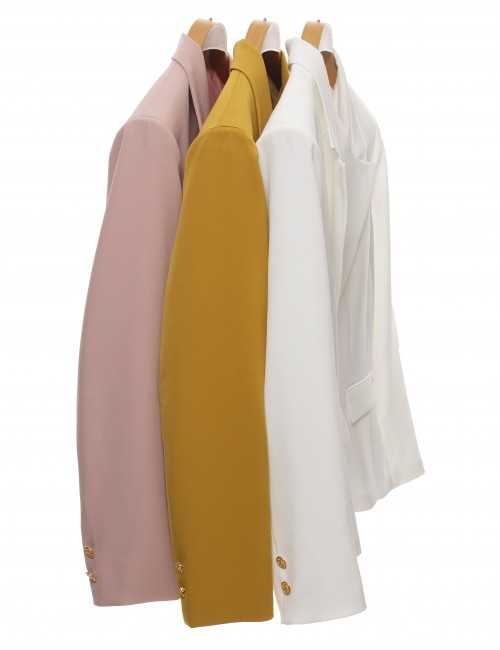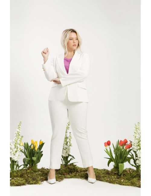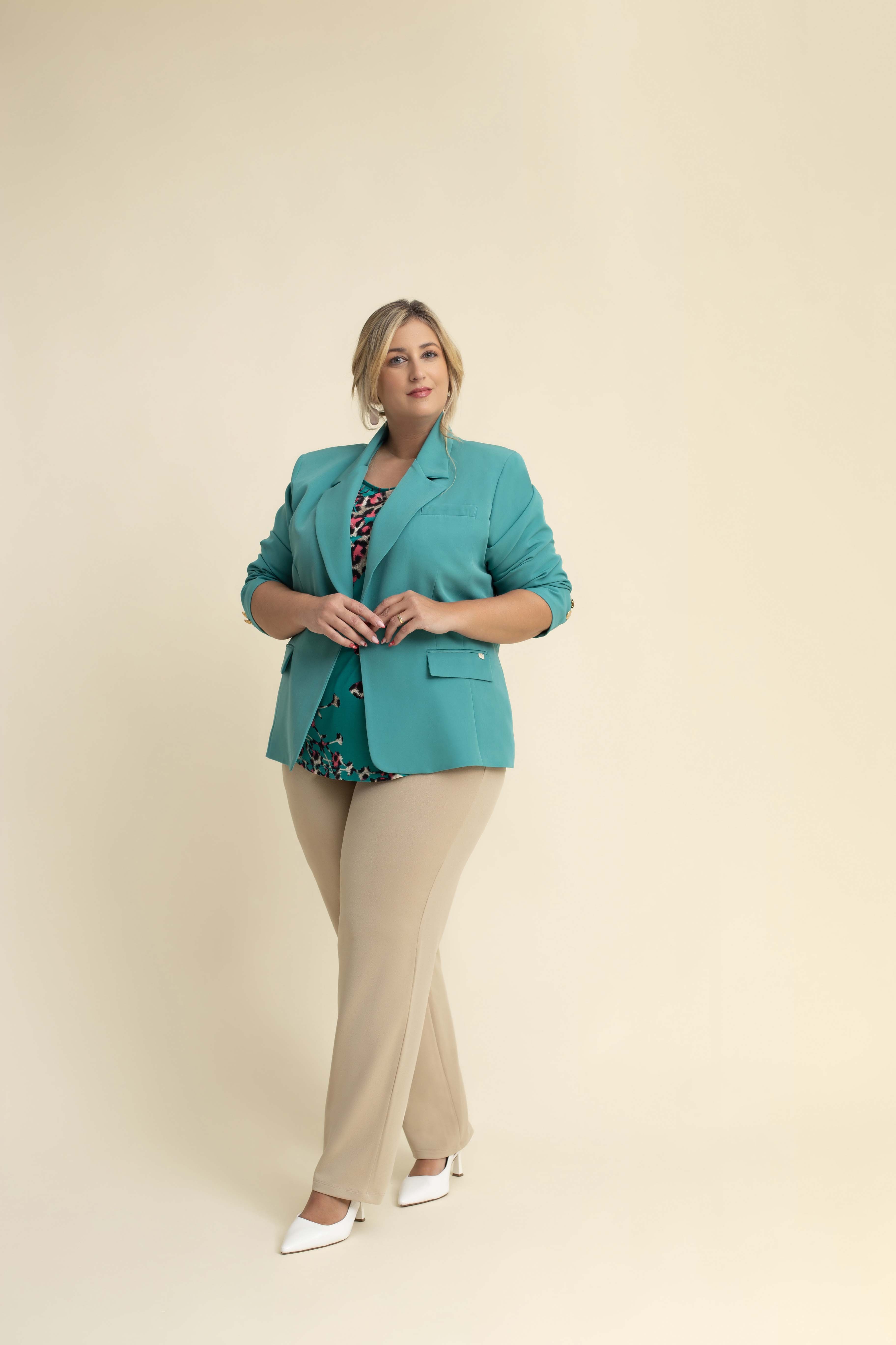 Plain fabric blazer, fitted cut, features buttons on the sleeves. Collection: Spring Summer Available in Plus Sizes Designed and manufactured by us. We are a clothing brand with over 50 years of experience. Model: Height 1.70m and wearing size 2XL. Composition: Outer: 95% Polyester 5% Elastane / Lining: 100% Polyester