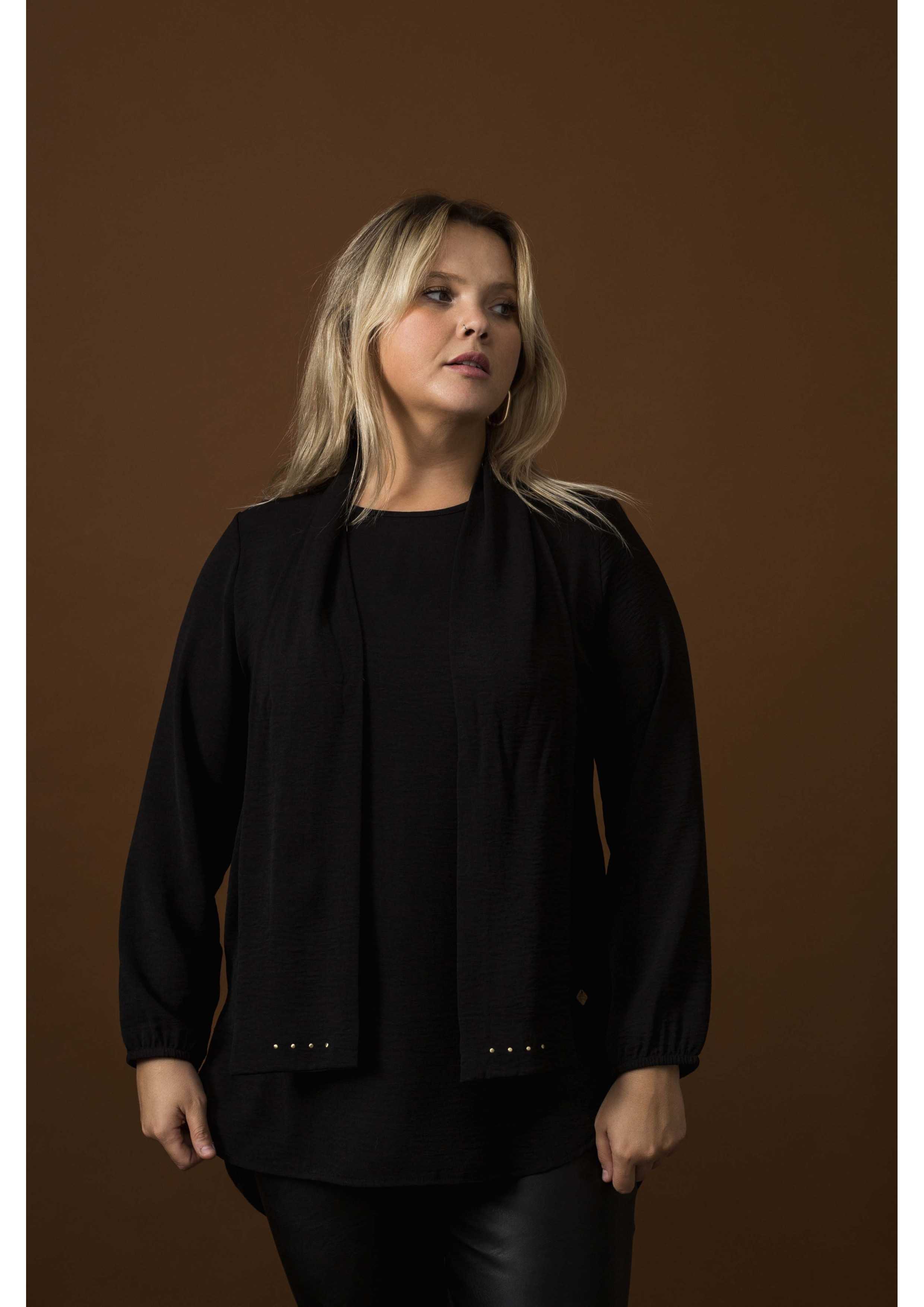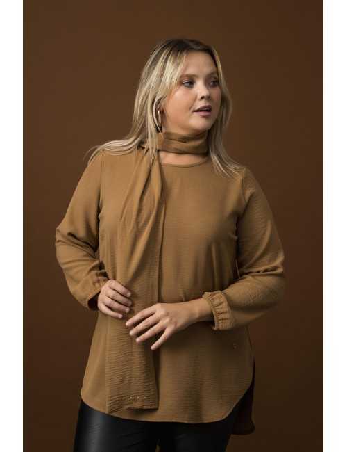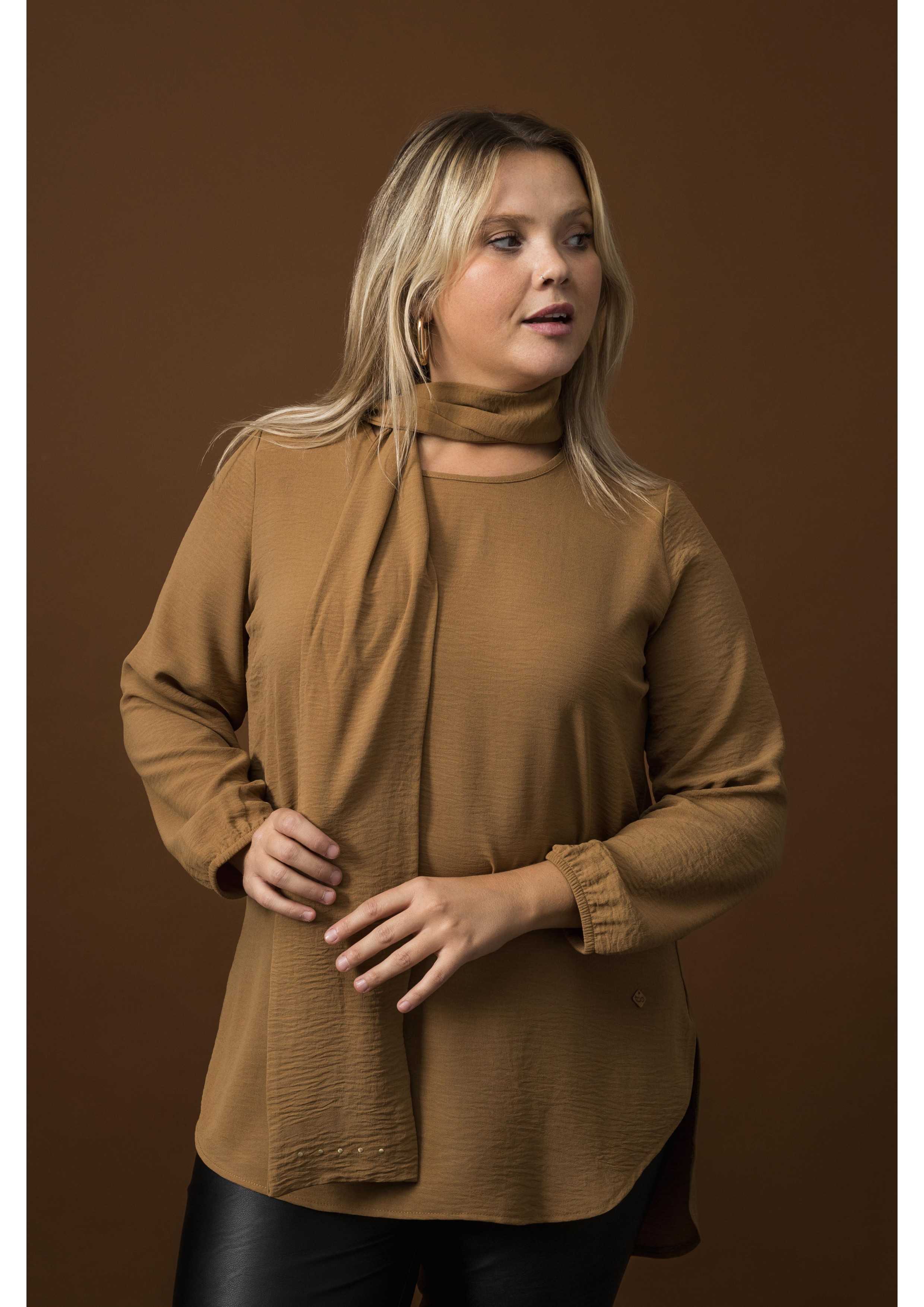 Tunic in plain fabric, round neckline, long sleeves with elastic, loose scarf with transfer application. Side slits. Collection: Autumn Winter Available in Plus Sizes Own design and manufacturing product. We are a clothing manufacturing brand with over 50 years of experience Model: Height 1.70m and wearing size 2XL. Composition: 100% Polyester