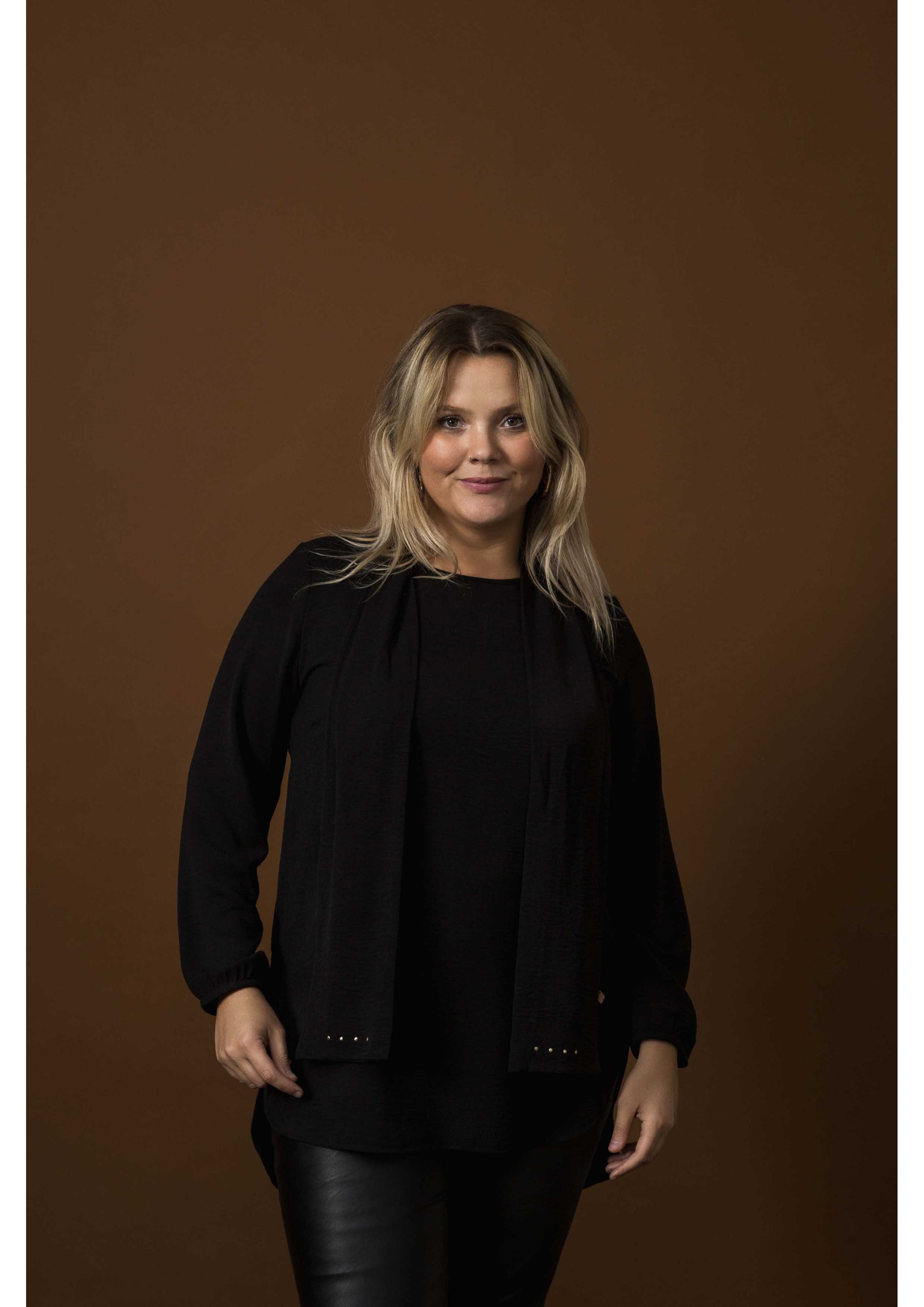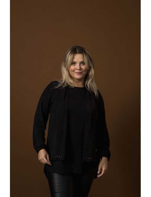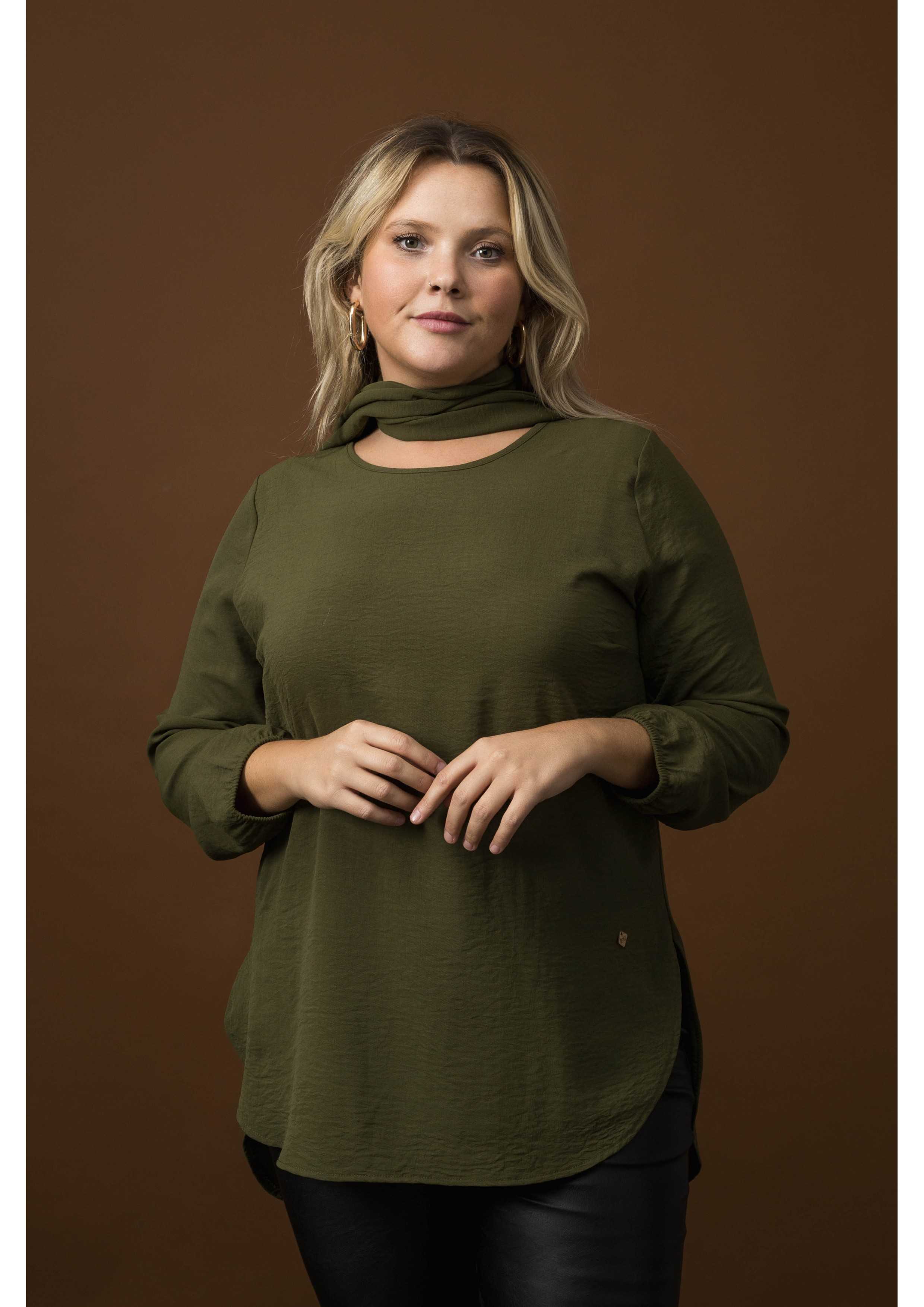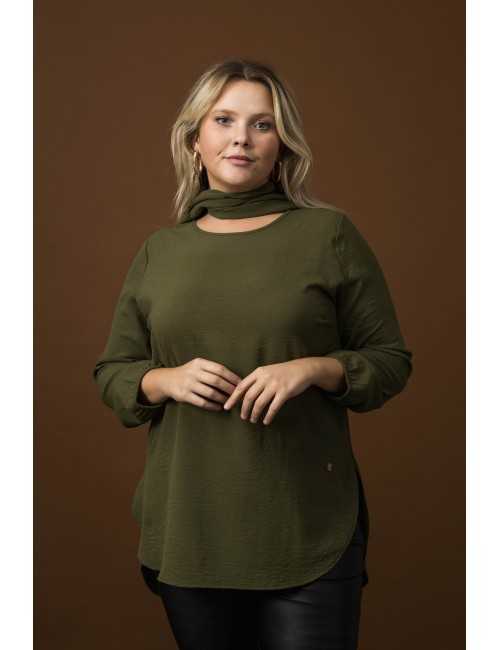 Tunic in plain fabric, round neckline, long sleeves with elastic, loose scarf with transfer application. Side slits. Collection: Autumn Winter Model: Height 1.70m and wearing size 2XL.