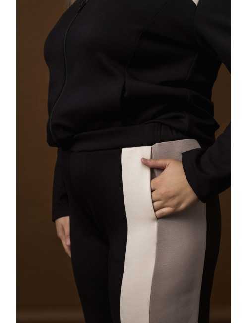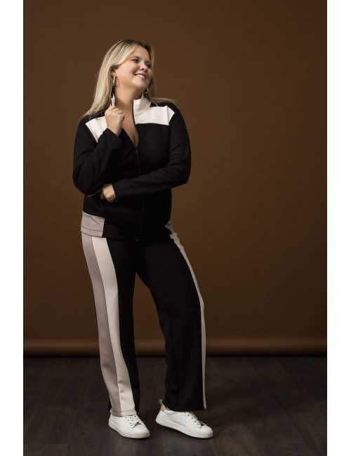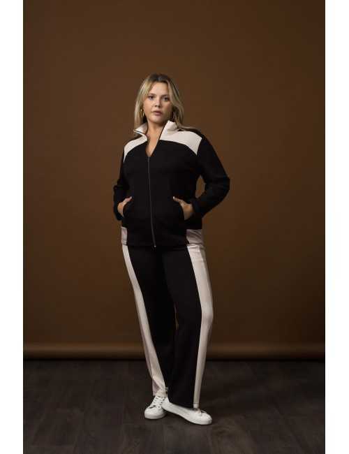 Plain knit tracksuit, jacket with contrasting inserts and hidden pockets, zip closure at the front. Pants with an elastic waist, 2 side inserts and pockets. Collection: Autumn Winter Available in Plus Sizes Own design and manufacturing product. We are a clothing manufacturing brand with over 50 years of experience Model: Height 1.70m and is wearing size 2XL. Composition: 50% polyester 45% viscose 5% elastane