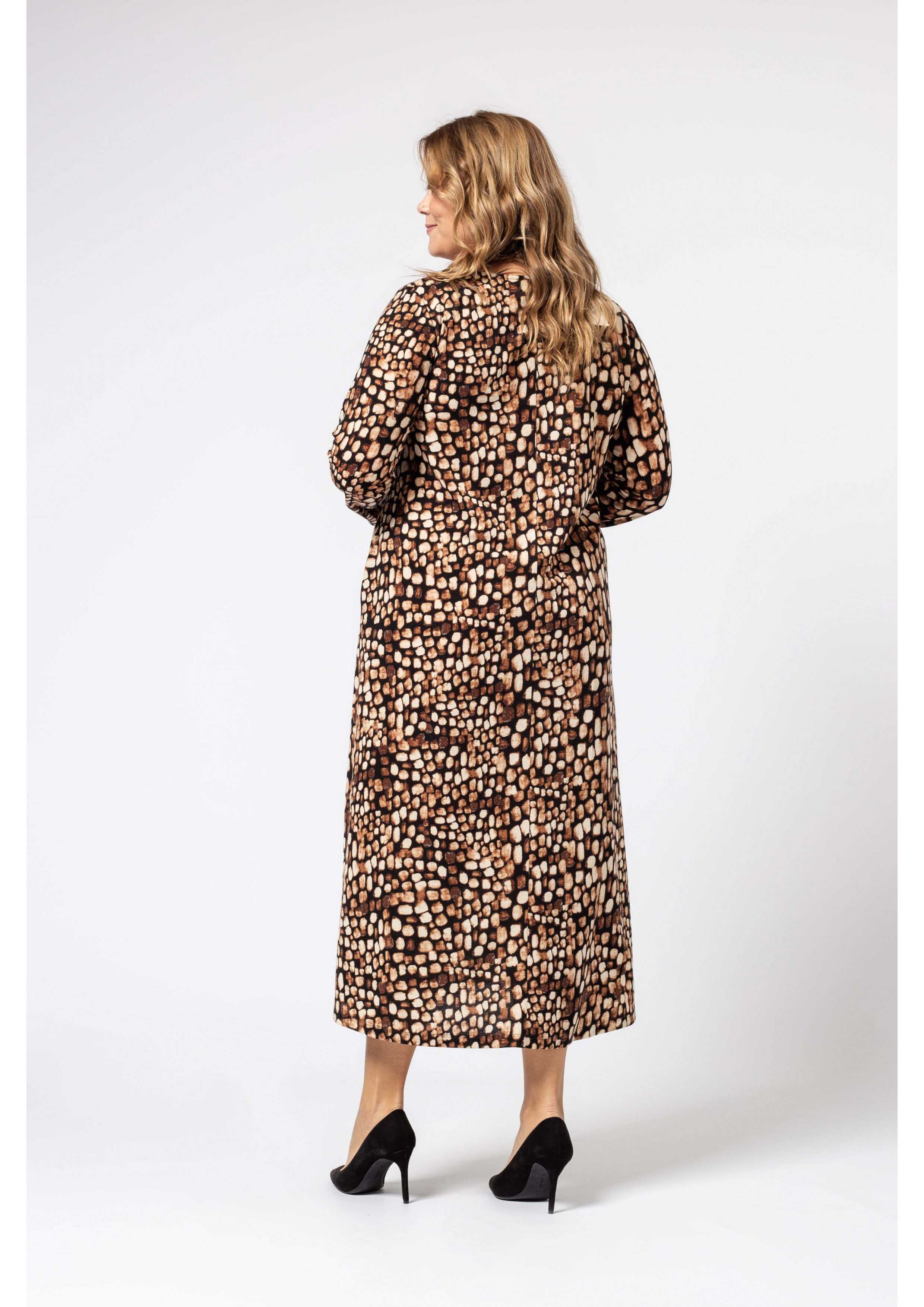 Brown printed knit dress, long sleeves, V-neck, cut at the back and front, side pockets. Two bows applied at the center front. Collection: Autumn Winter Available in Plus Sizes Own design and manufacturing product. We are a clothing manufacturing brand with over 50 years of experience Model: Height 1.70m and wearing size 2XL. Composition: 95% Polyester 5% Elastane