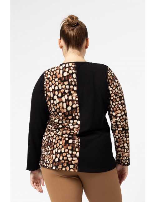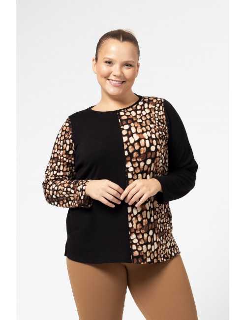 Knit sweater. Contrast half plain and printed, round neck and side slits. Collection: Autumn Winter Available in Plus Sizes Product designed and manufactured by us. We are a clothing manufacturing brand with over 50 years of experience Model: Height 1.70m and wearing size 2XL. Composition: PLAIN 67% Polyester 28% Rayon 5% Elastane|FLORAL 95% Polyester 5% Elastane