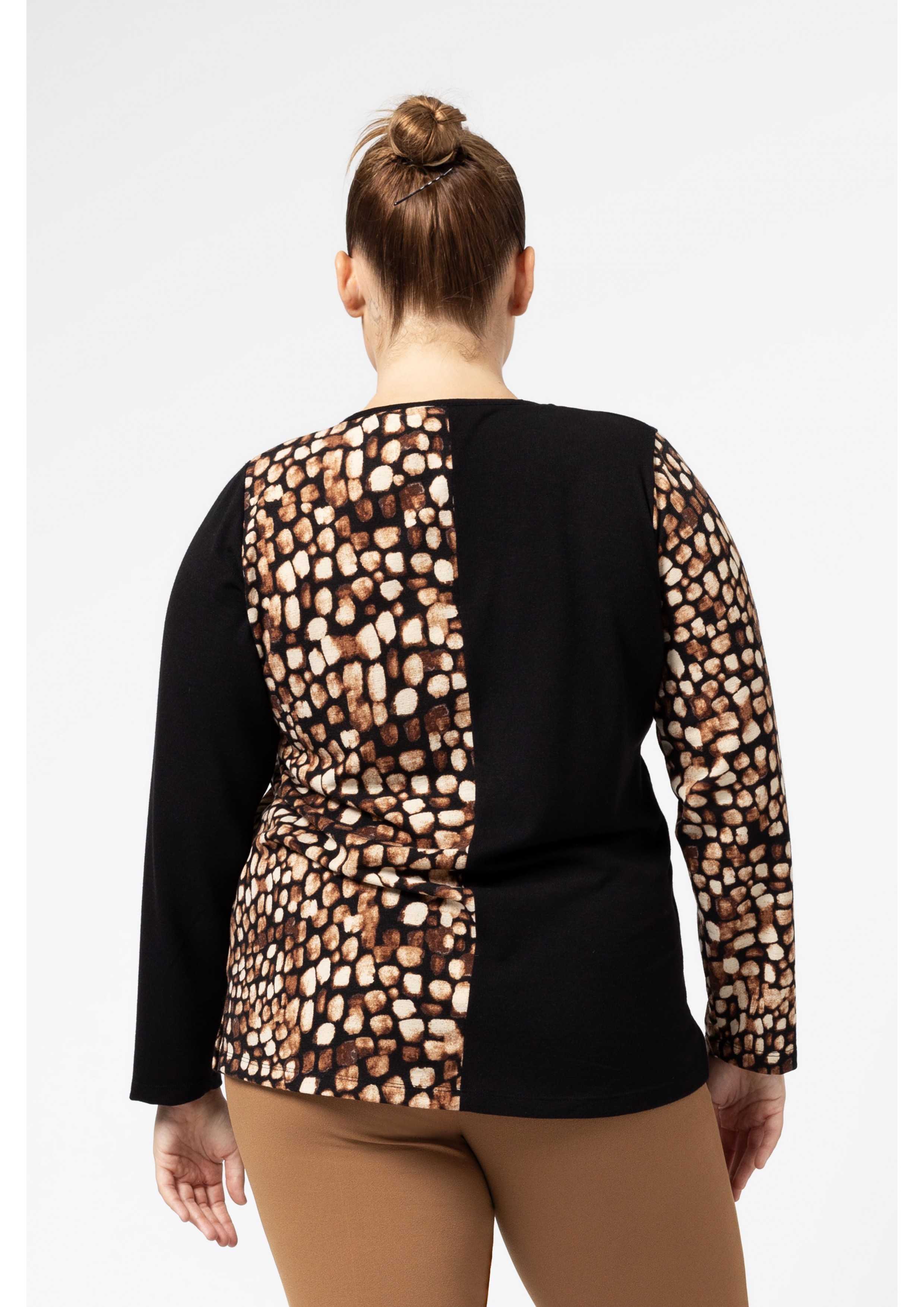 Knit sweater. Contrast half plain and printed, round neck and side slits. Collection: Autumn Winter Model: Height 1.70m and wearing size 2XL.