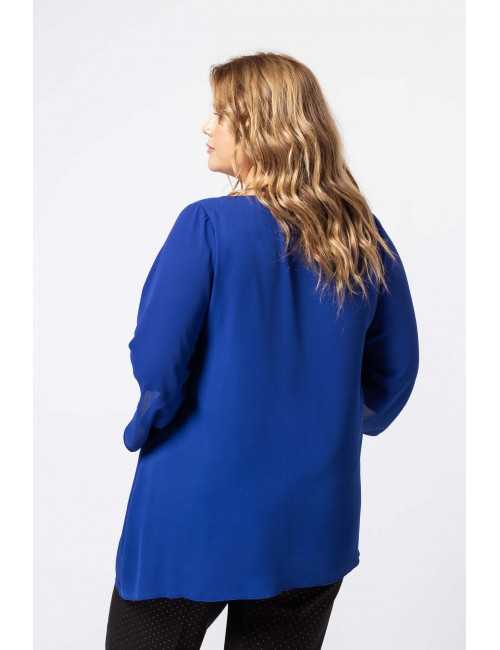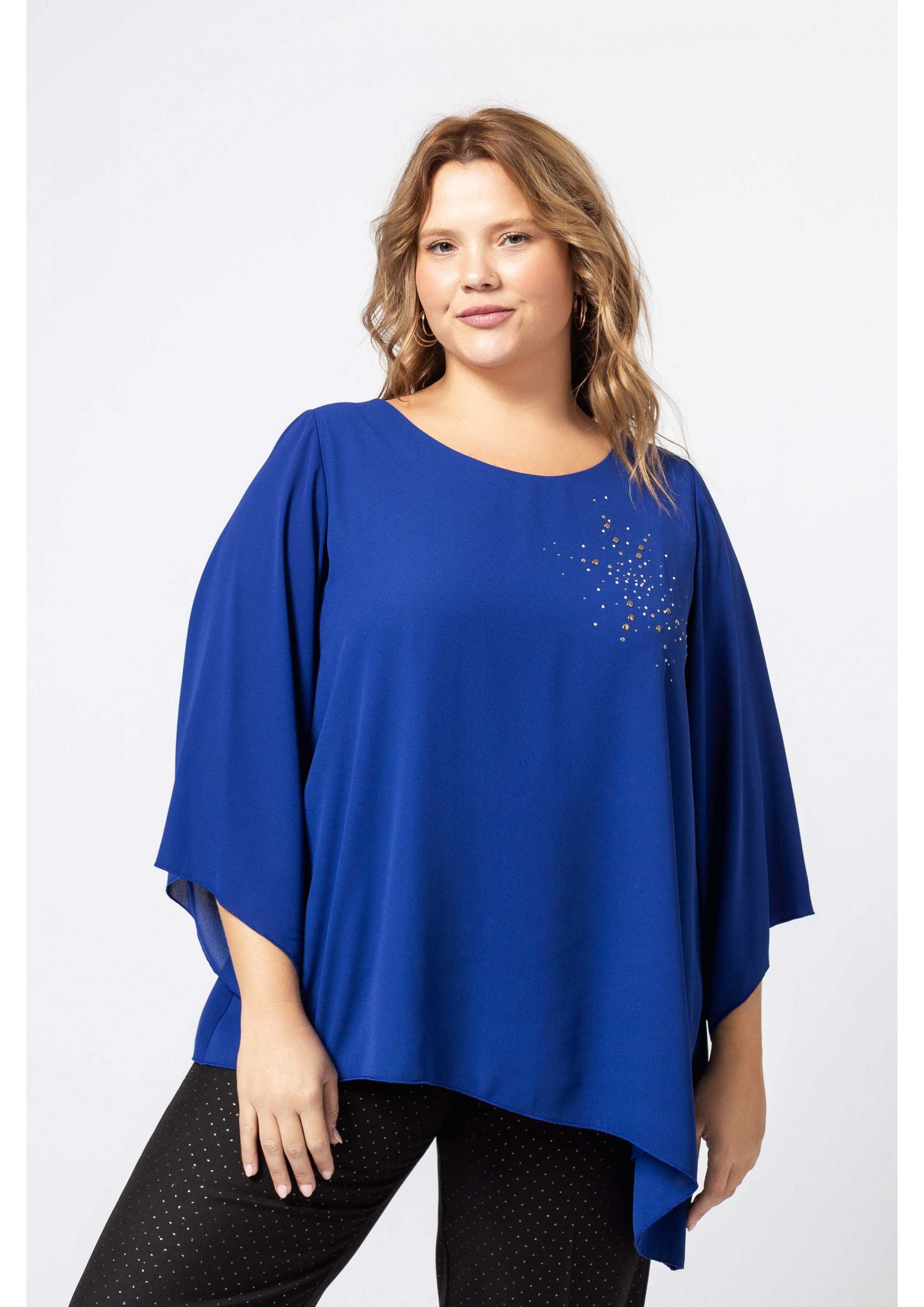 Solid fabric blouse, fine, round neckline, 3/4 wide sleeves, lined model with an applied transfer on the front. Collection: Autumn Winter Available in Plus Sizes. Designed and manufactured by us. We are a clothing manufacturing brand with over 50 years of experience. Model: Height 1.70m and is wearing size 2XL. Composition: 100% Polyester | LINING 94% Polyester 6% Elastane