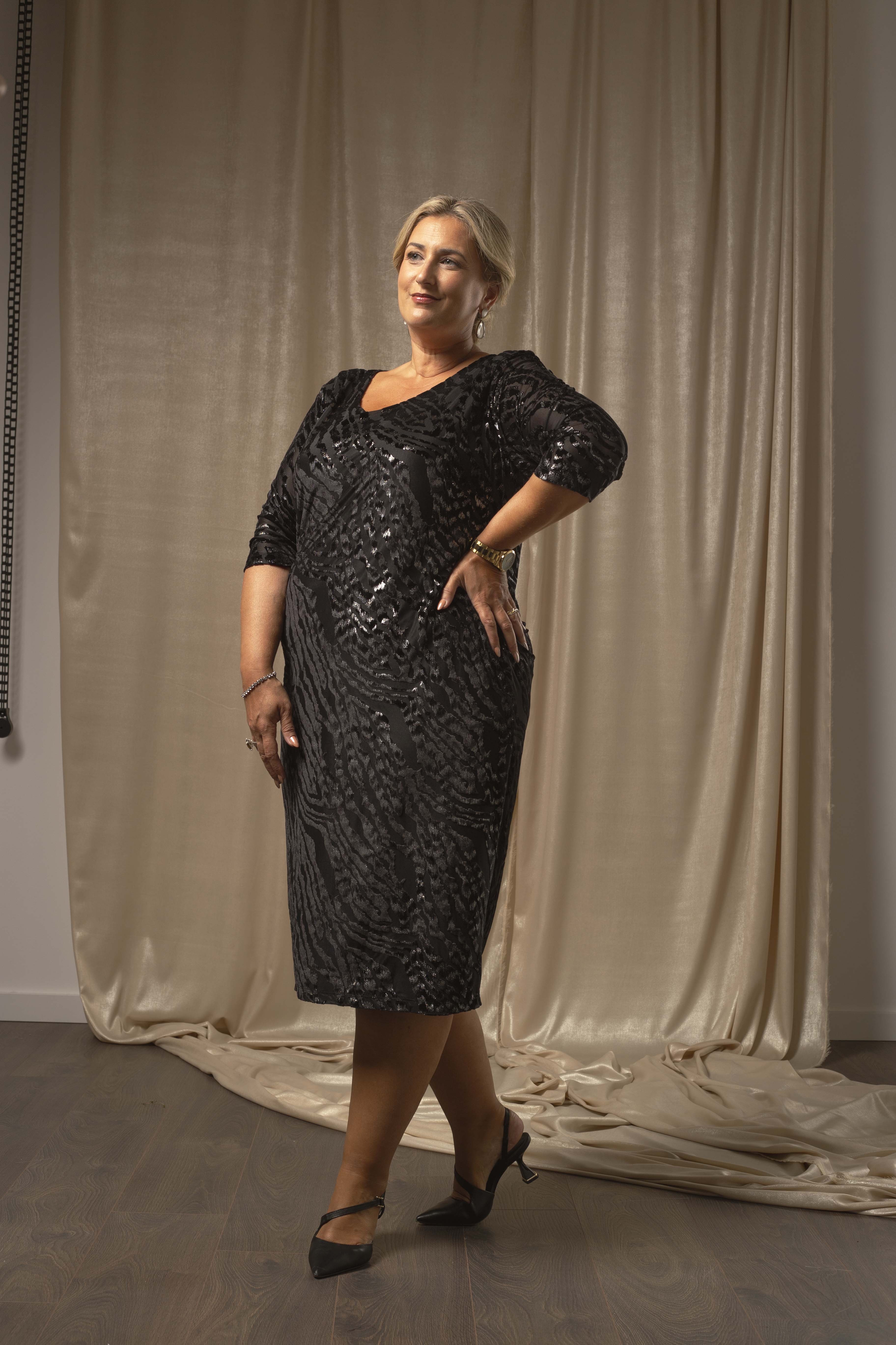 Dress in knitted fabric with velvet relief and shine, round neck, 3/4 sleeves, straight cut. Collection: Autumn Winter Available in Plus Sizes Own design and manufacturing product. We are a clothing manufacturing brand with over 50 years of experience Model: Height 1.70m and is wearing size 2XL. Composition: SHINE 44%Polyamide 43%Polyester 13%Elastane|LINING 94%Polyester 6%Elastane