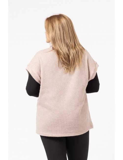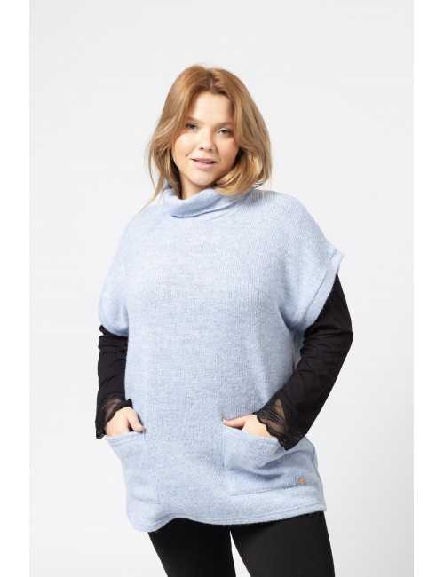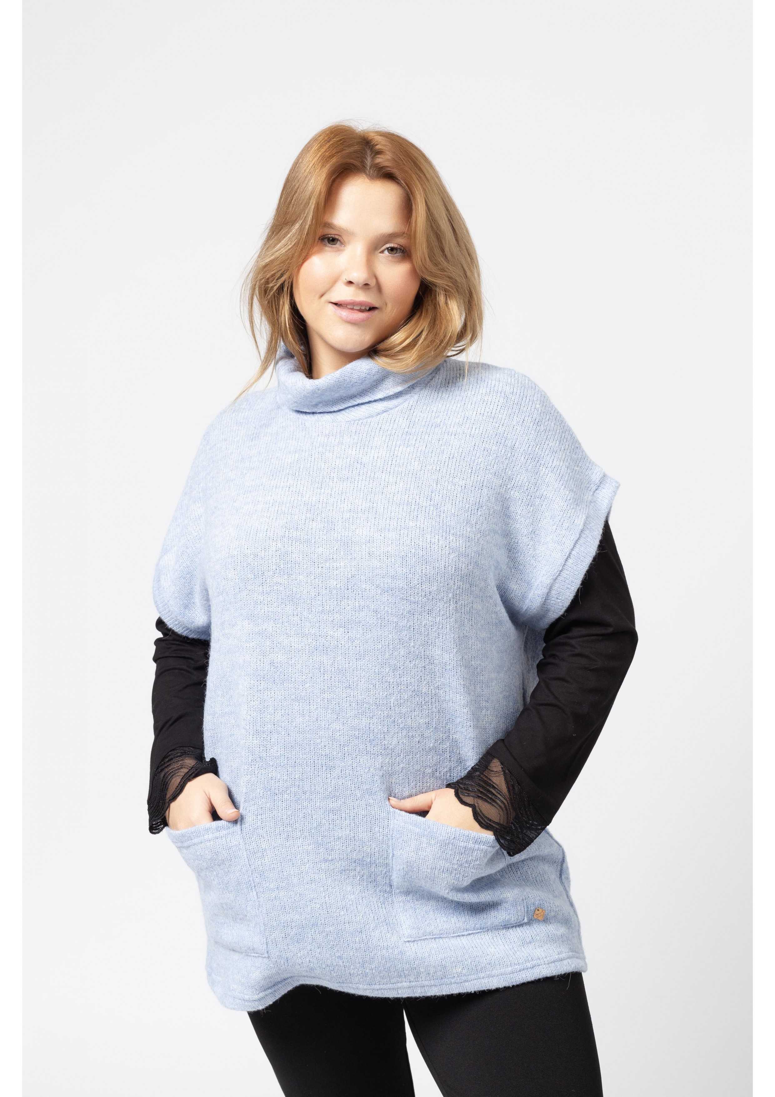 Plain knit poncho, high falling collar, cuffs, flap pockets in the front. Collection: Autumn Winter Available in Plus Sizes Product designed and manufactured by us. We are a clothing brand with over 50 years of experience Model: Height 1.70m and is wearing size 2XL. Composition: 53%Acrylic 22%Polyester 15%Polyamide 8%Wool 2%Elastane