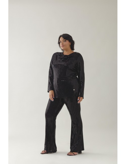 Shiny knit pants. Collection: Autumn Winter Available in Plus Sizes Own design and manufacturing product. We are a clothing manufacturing brand with over 50 years of experience Composition: 77% Nylon 18% Metal 5% Elastane