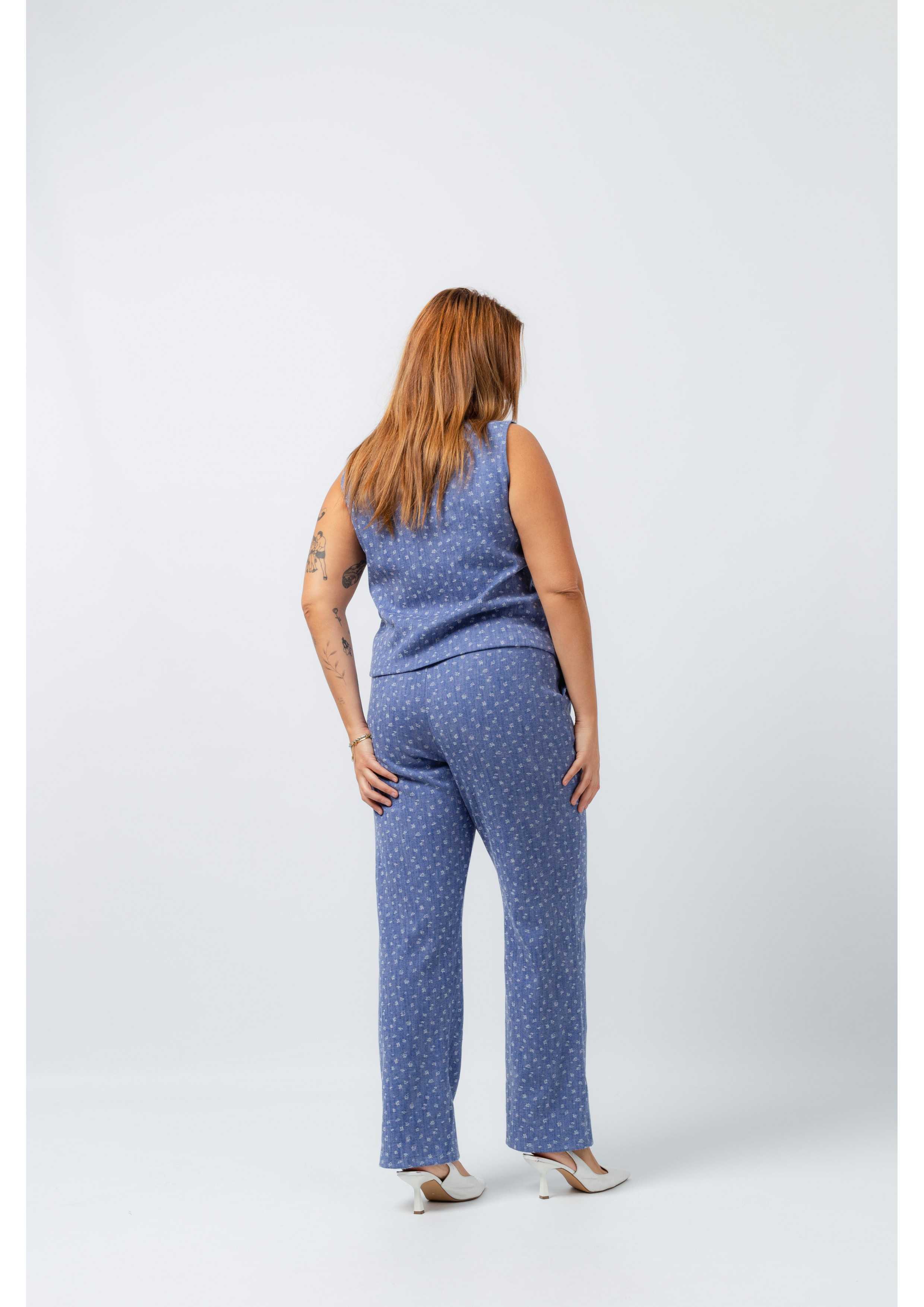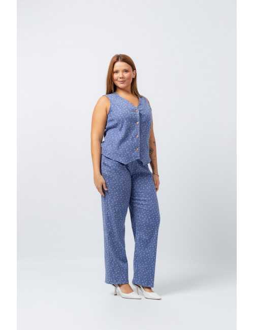 Denim pants with dots, side pockets, elastic at the waist, faux fly. Collection: Spring Summer Available in Plus Sizes Own design and manufacturing product. We are a clothing brand with over 50 years of experience Model: Height 1.70m and is wearing size 2XL. Composition: 71% Polyester 25% Cotton 3% Elastane