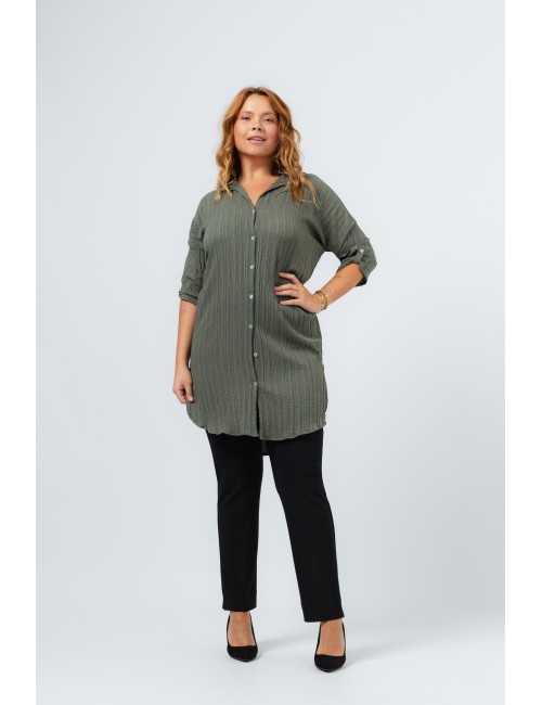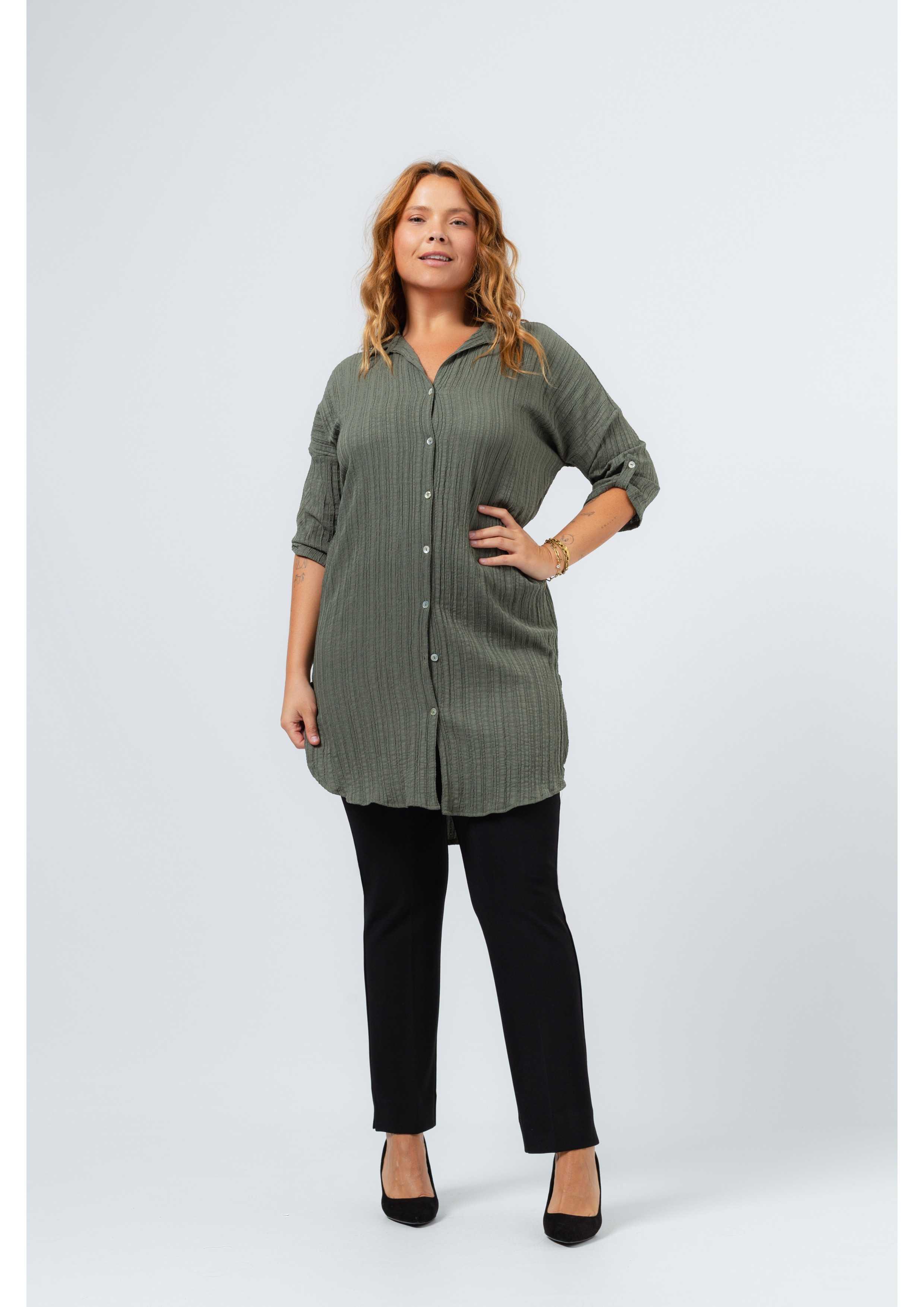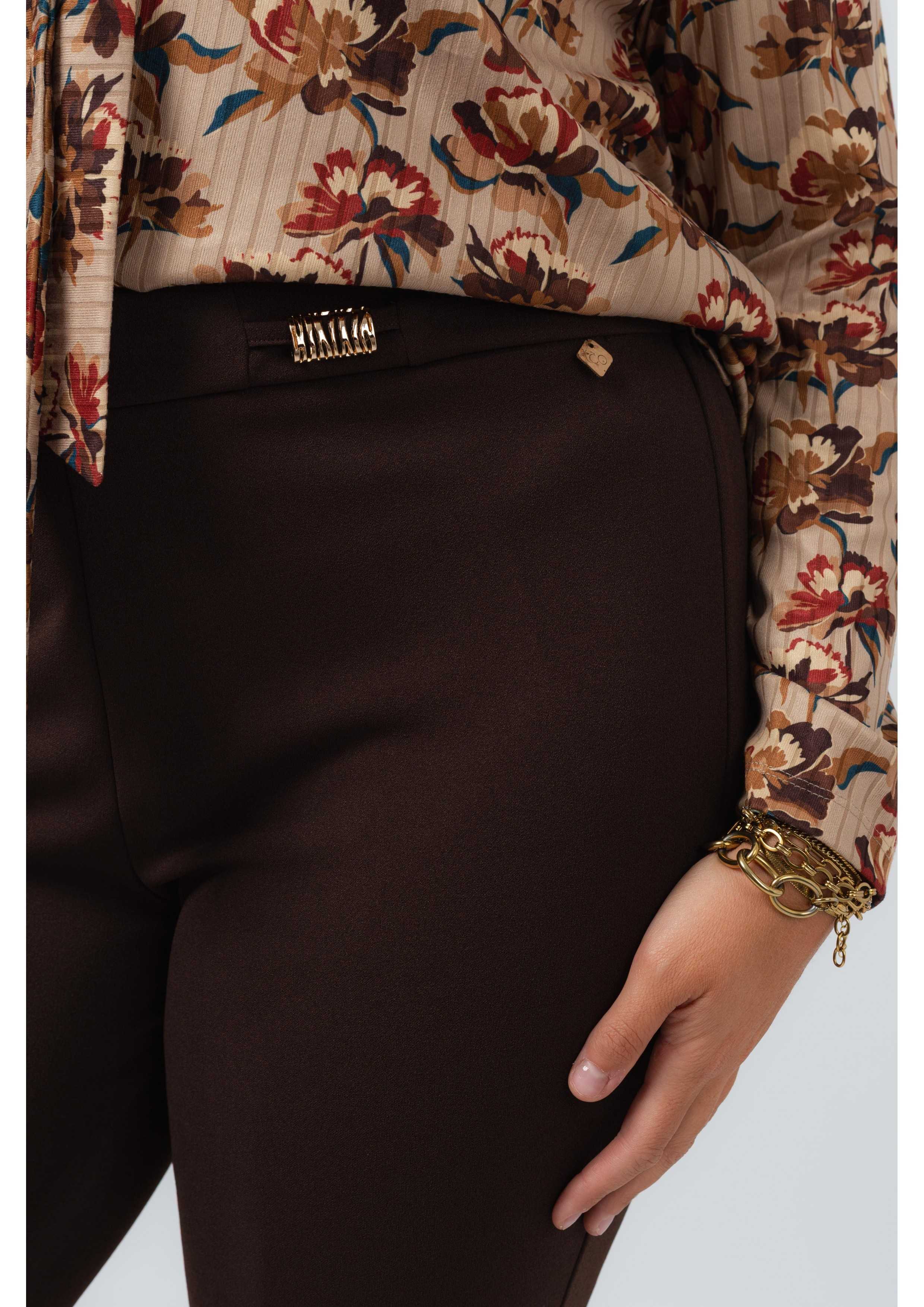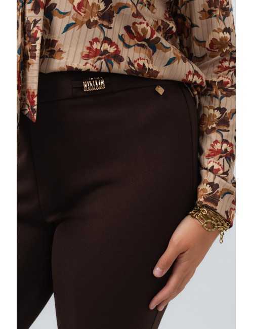 Plain fabric pants, pleated model with side slits. Plain belt in the front with 2 metal applications. Elastic only at the back. Collection: Autumn Winter Available in Plus Sizes Own design and manufacturing product. We are a clothing manufacturing brand with over 50 years of experience Model: Height 1.70m and wearing size L. Composition: 95% Polyester 5% Elastane