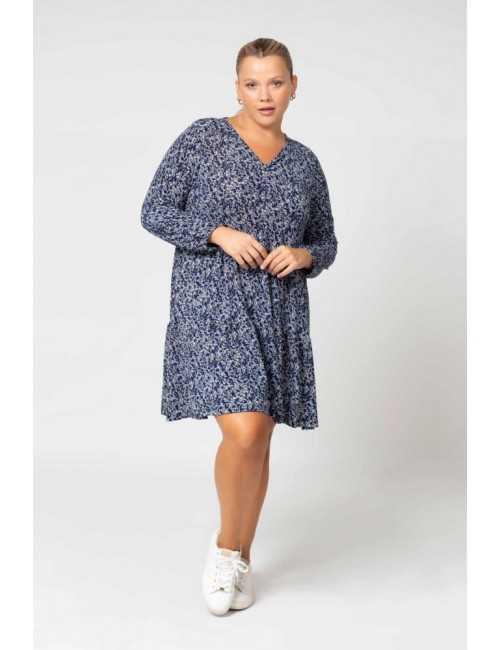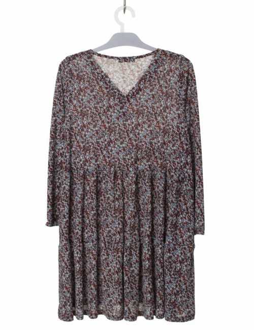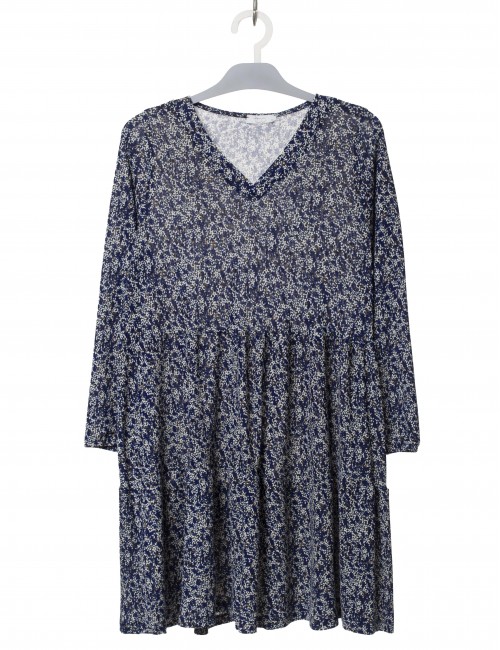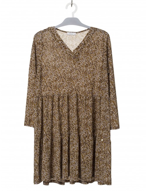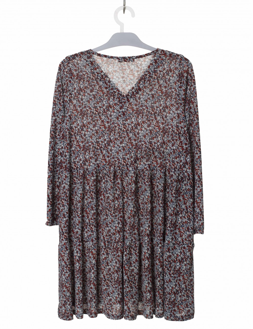 Floral knit dress, with ruffles, long sleeves, pointed neckline. Collection: Autumn Winter Model: Height 1.70m wearing size 2XL in blue. Model: Height 1.65m wearing size 3XL in brown.