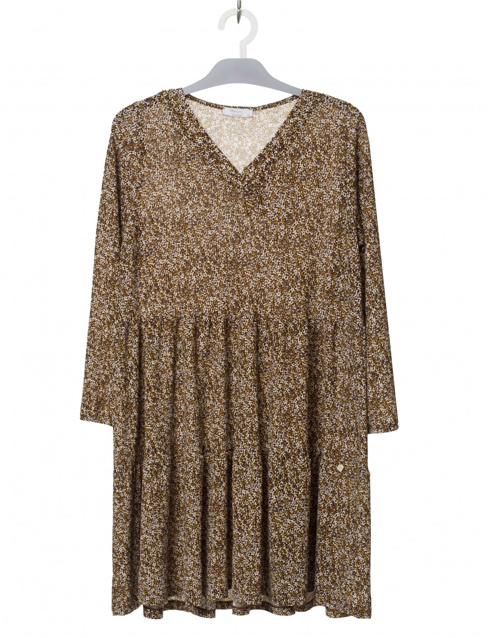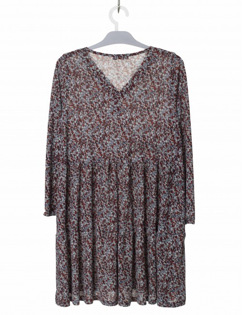 Floral knit dress, with ruffles, long sleeves, pointed neckline. Collection: Autumn Winter Available in Plus Sizes Own design and manufacturing product. We are a clothing manufacturing brand with over 50 years of experience Model: Height 1.70m wearing size 2XL in blue. Model: Height 1.65m wearing size 3XL in brown. Composition: 94% Polyester 6% Spandex
