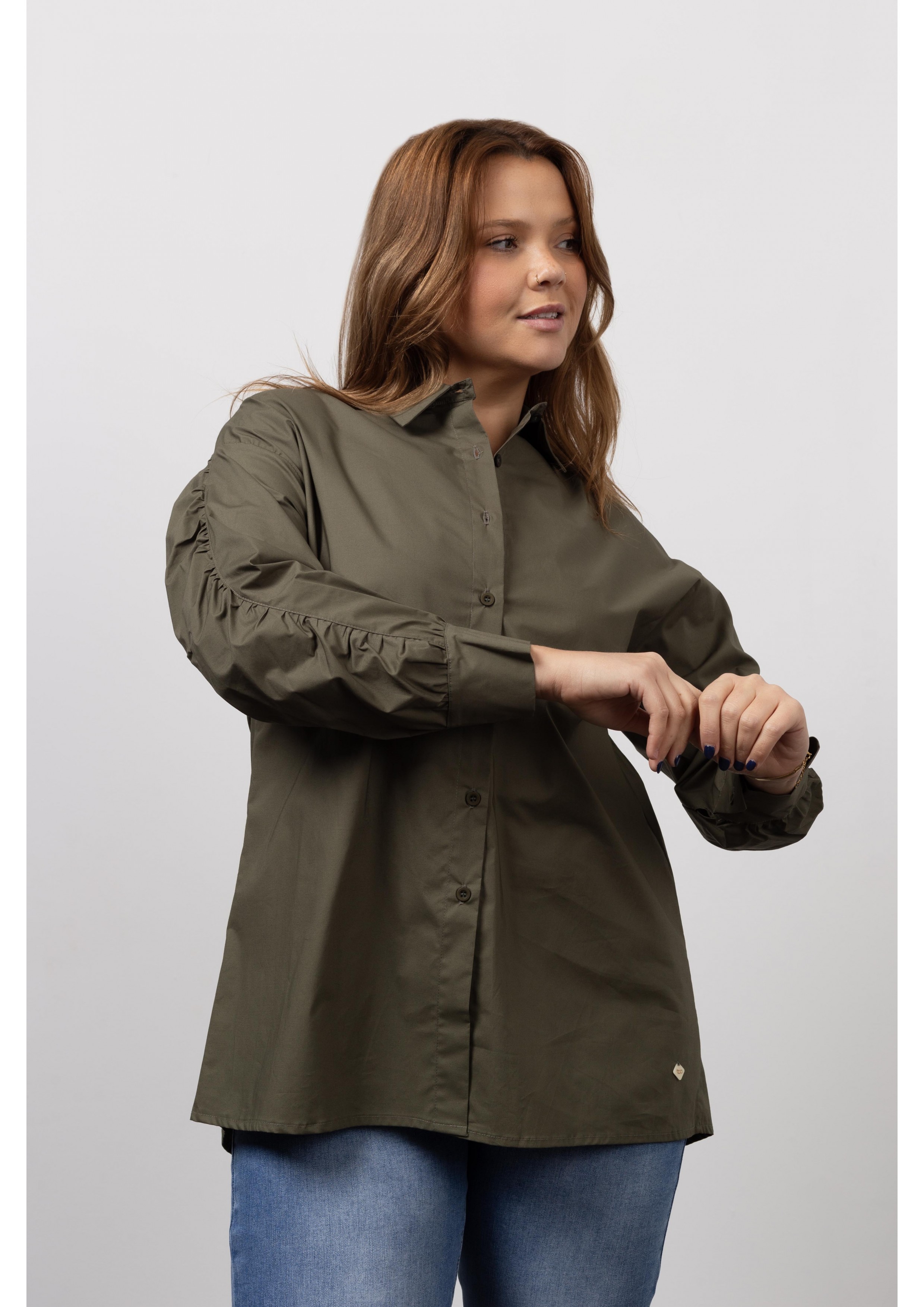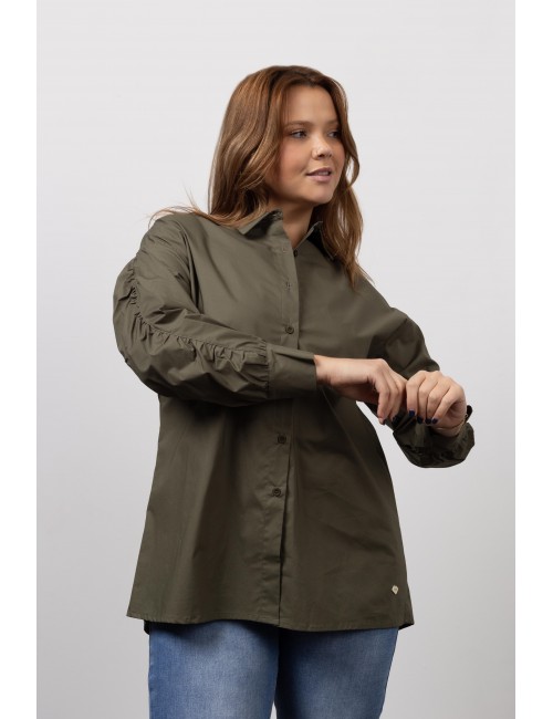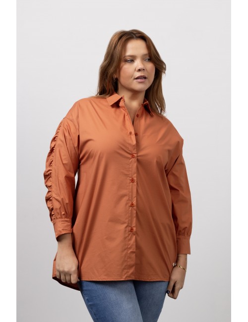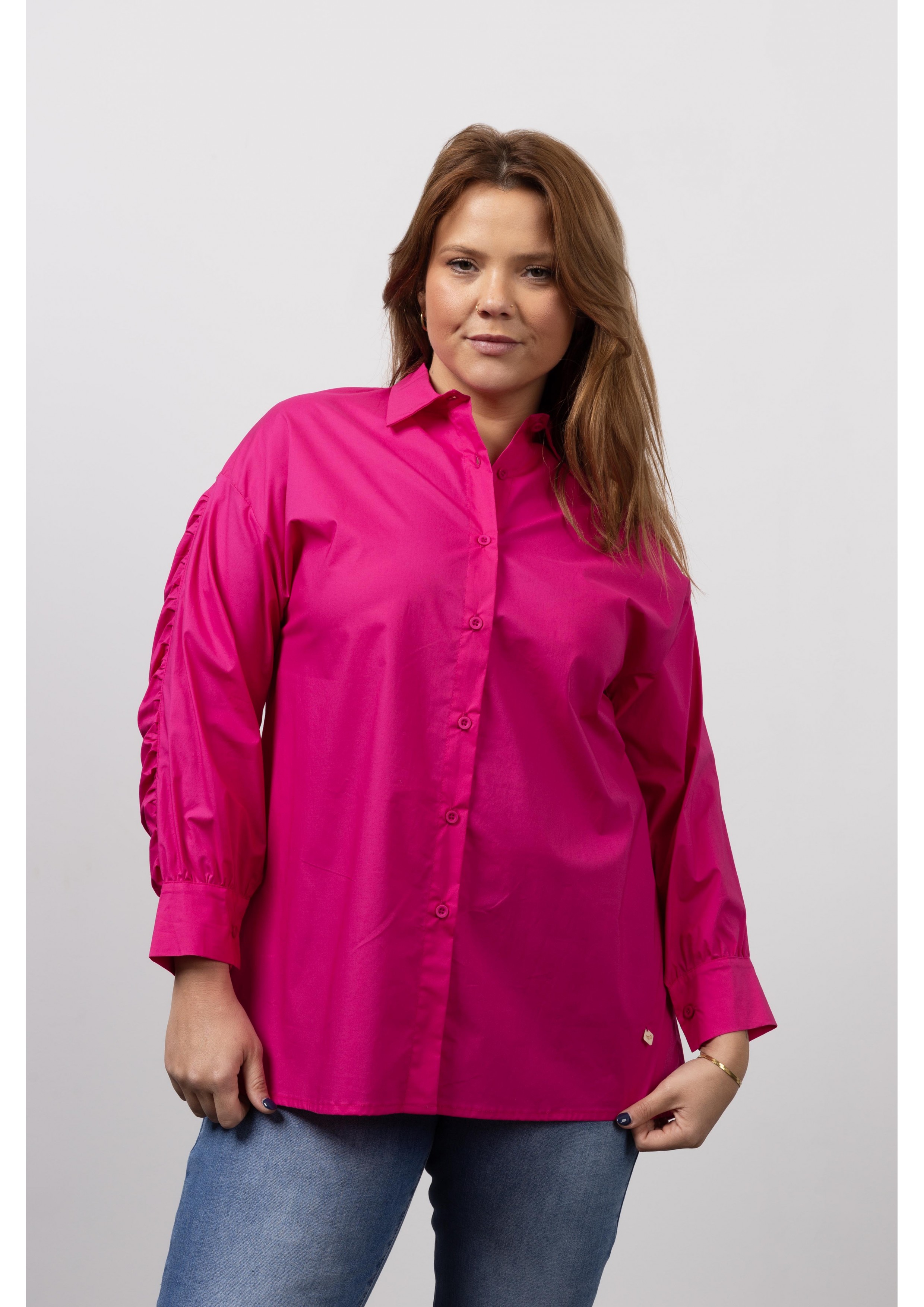 Blouse in plain cambraia fabric, Long sleeve with ruffles. Collection: Autumn Winter Model: Height 1.70m and is wearing size 2XL. 95% Cotton 5% Elastane
