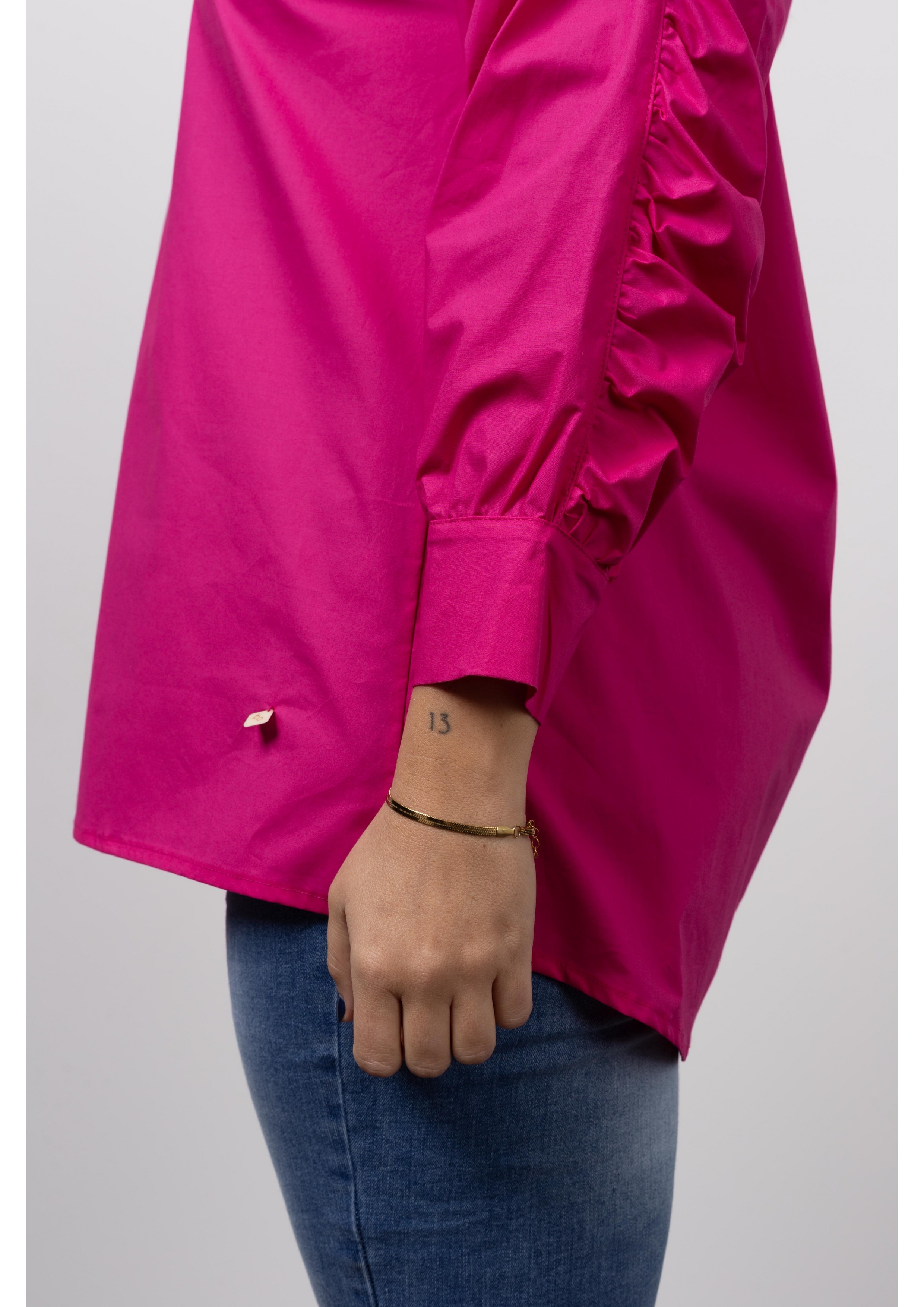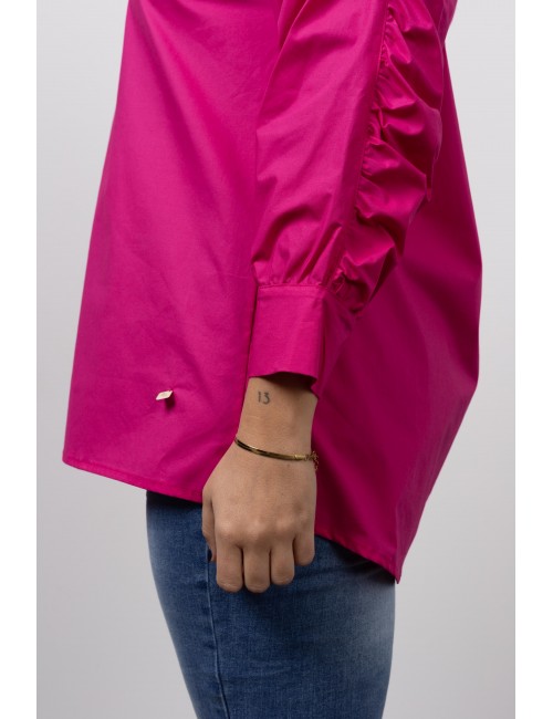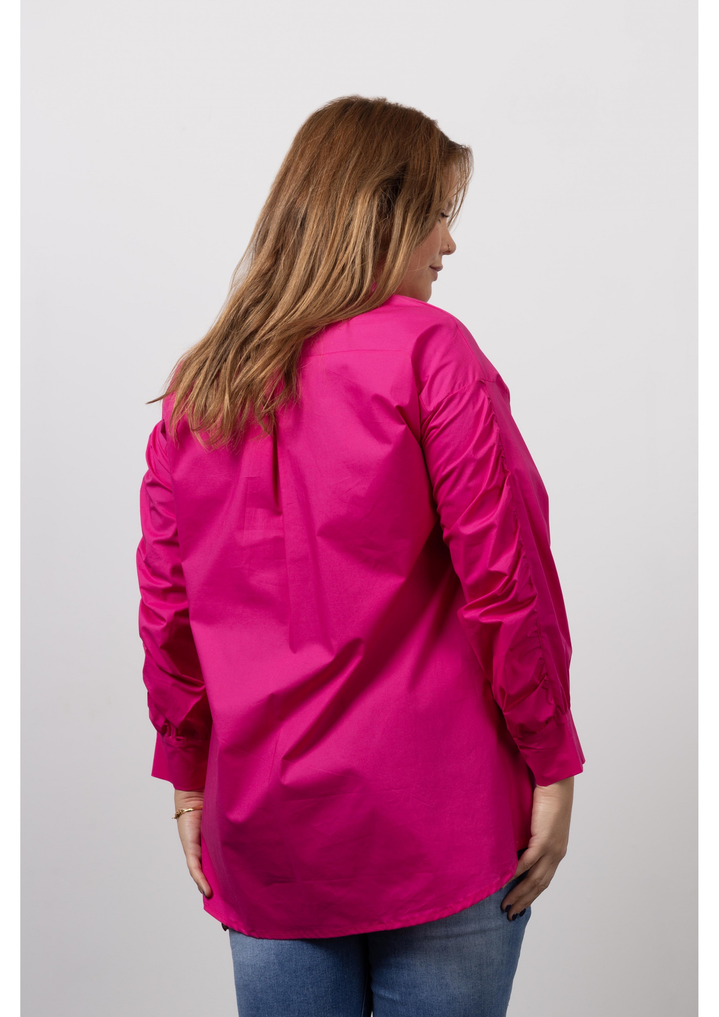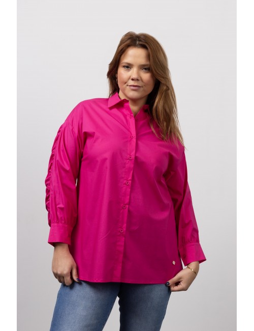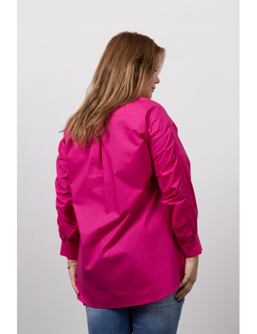Blouse in plain cambraia fabric, Long sleeve with ruffles. Collection: Autumn Winter Model: Height 1.70m and is wearing size 2XL. 95% Cotton 5% Elastane