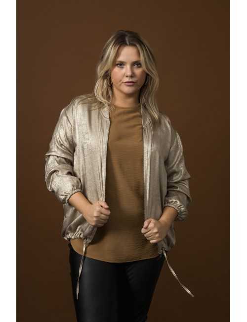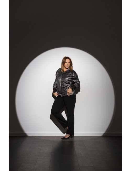 Bomber jacket in fabric, front closure, side pockets, 3/4 sleeves with studs and elastic at the base. Front closure. Model: Height 1.70m and wearing size 2XL. |
