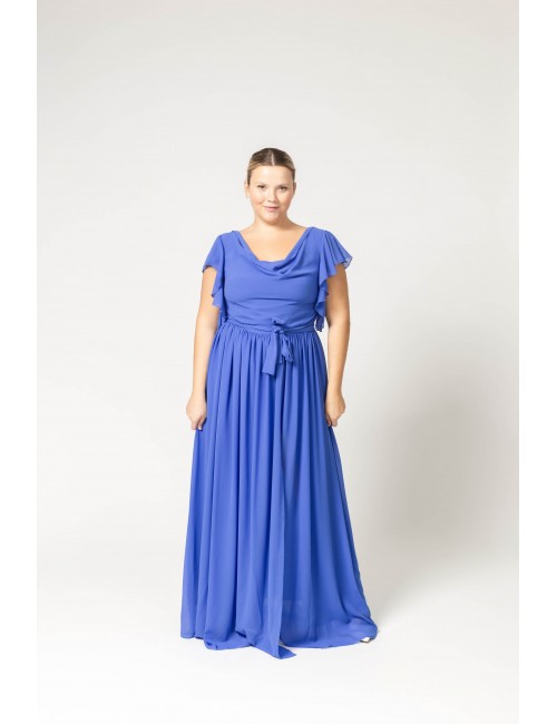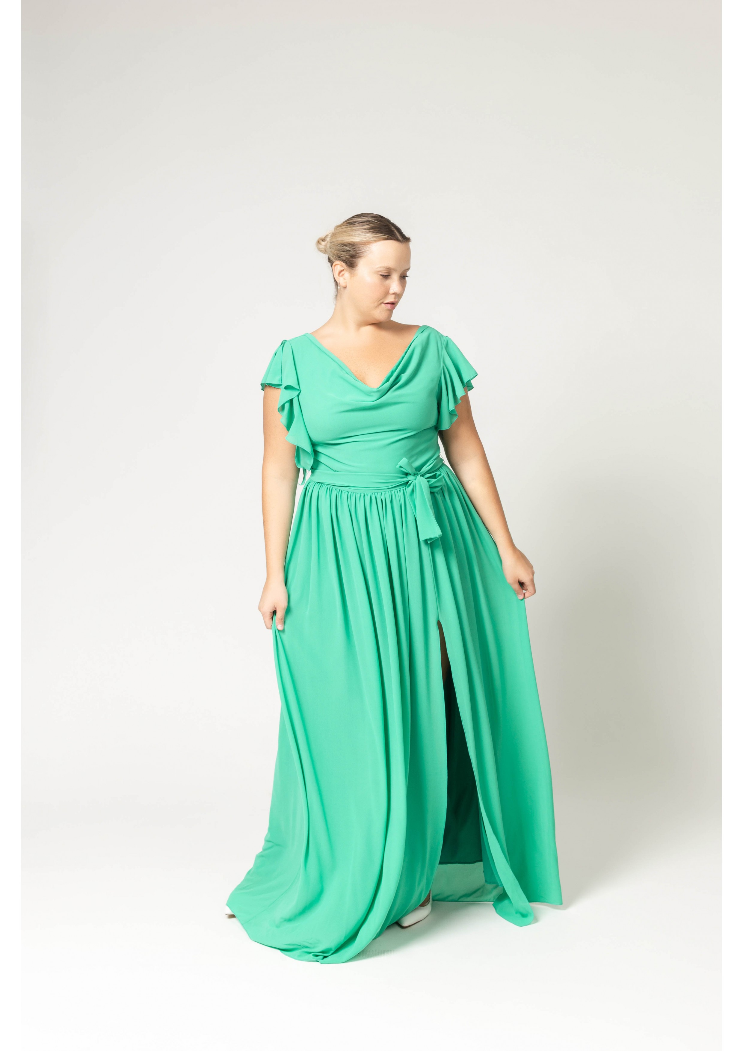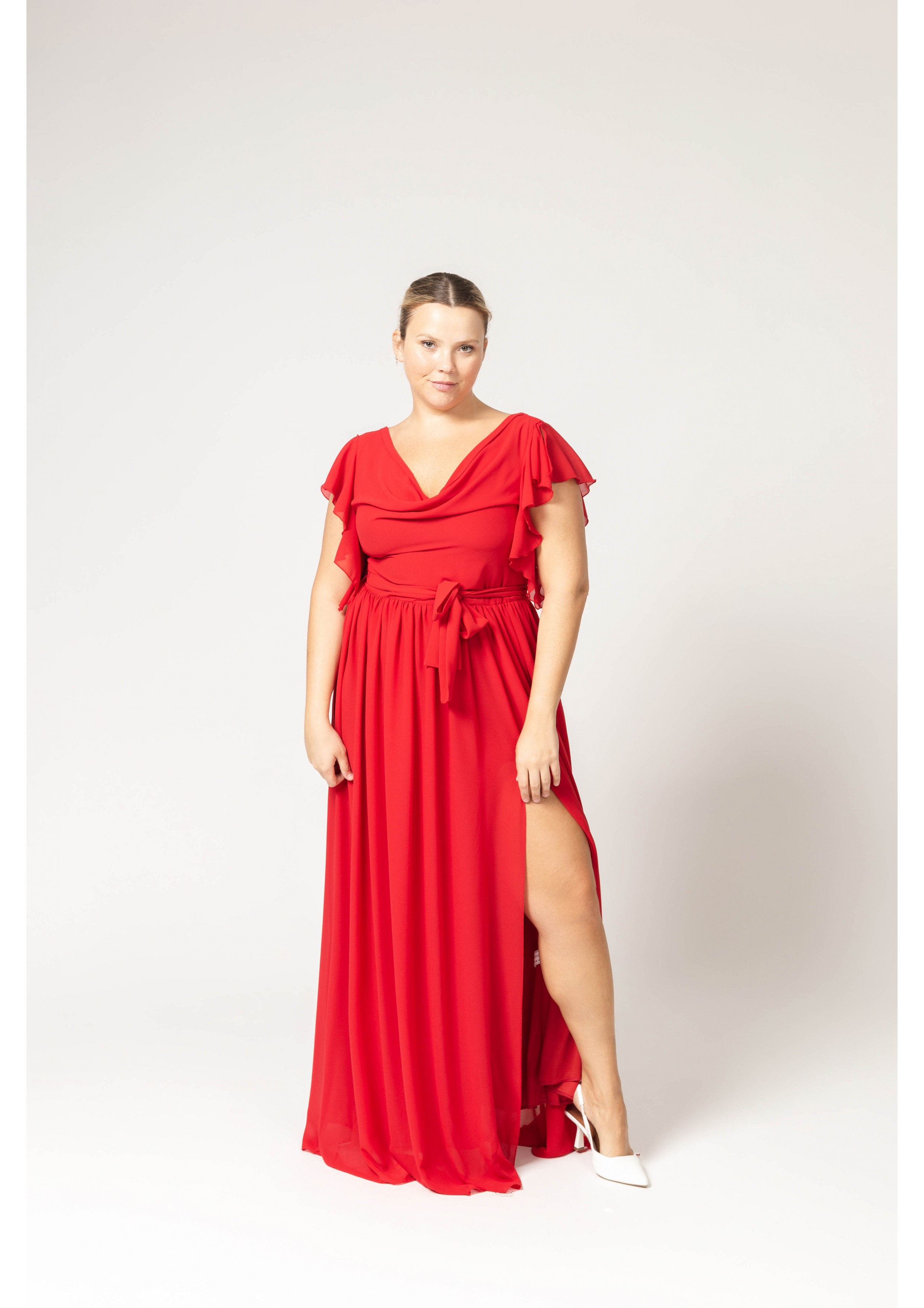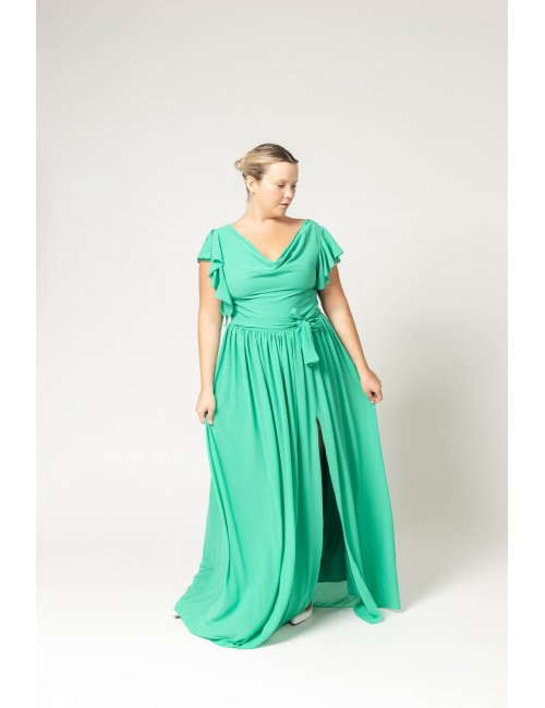 Long dress, in flowy fabric, waist cut, draped neckline, ruffle at the sleeves | Collection: Spring Summer | Model: Height 1.70m and wearing size 2XL |