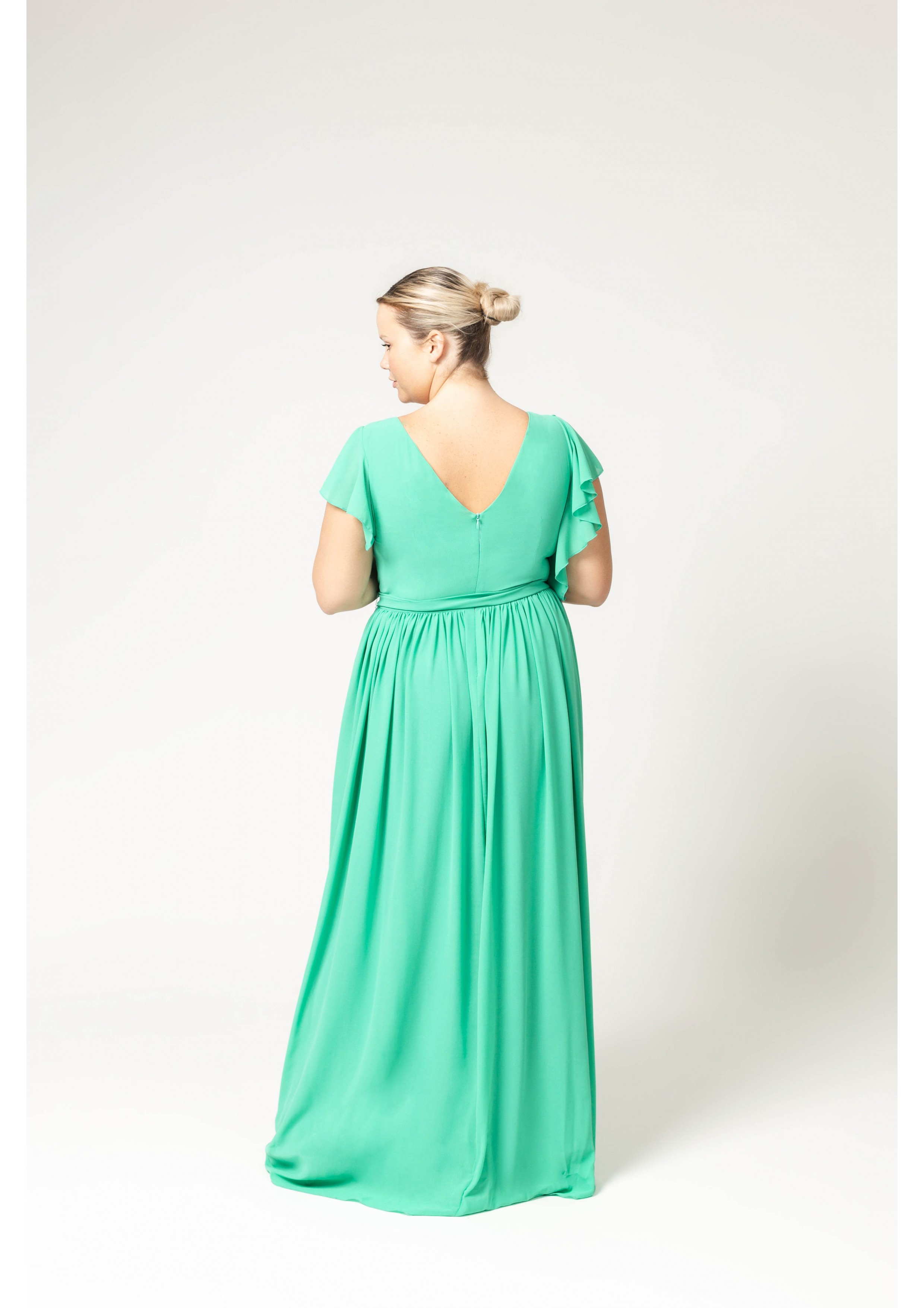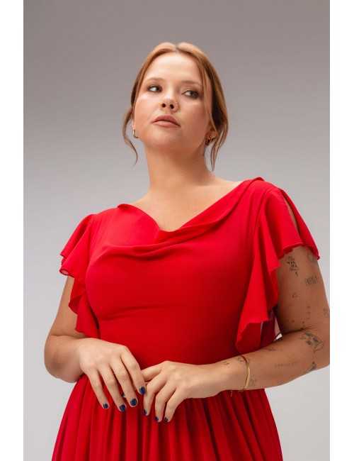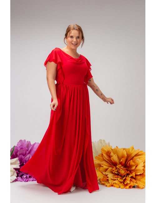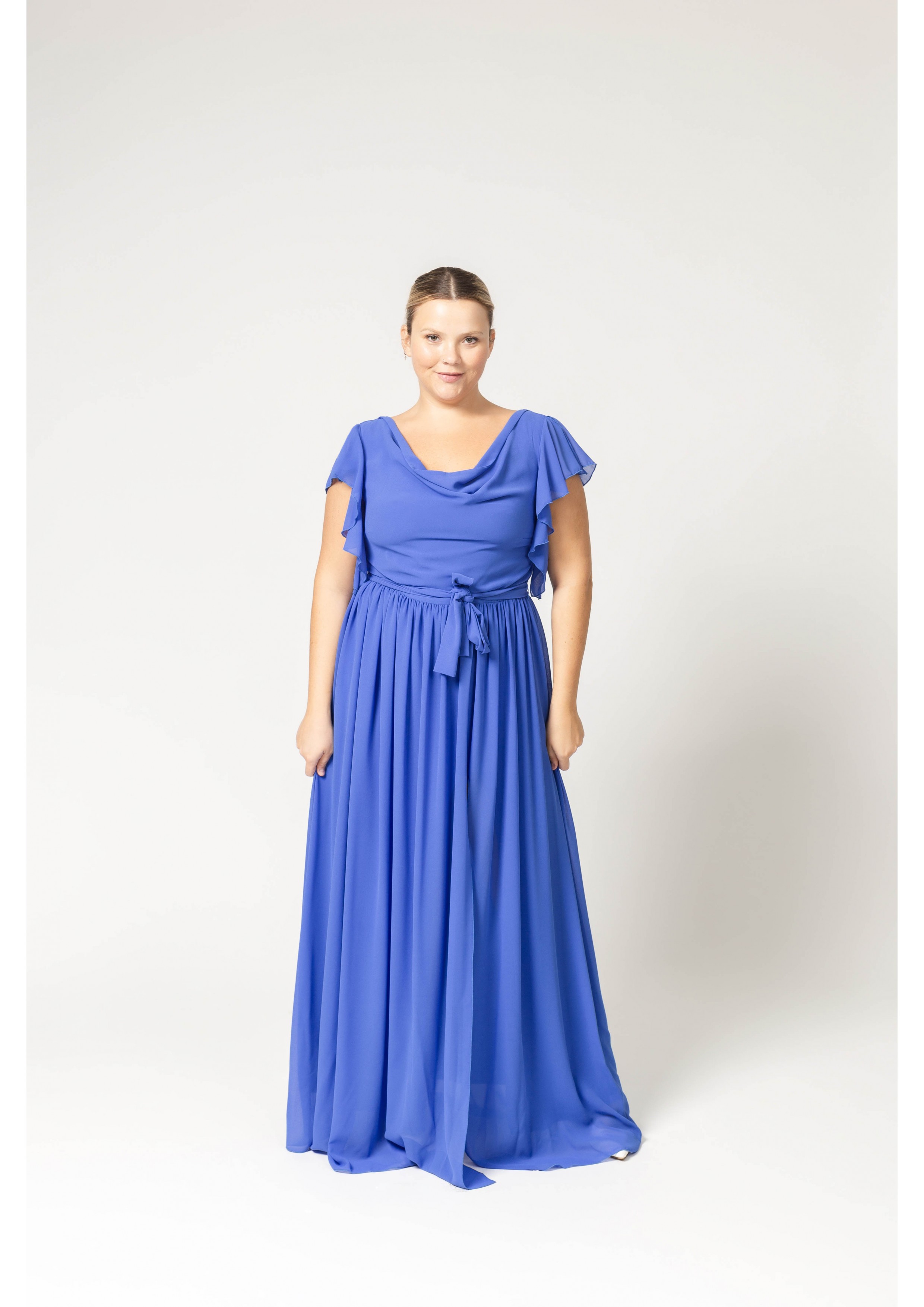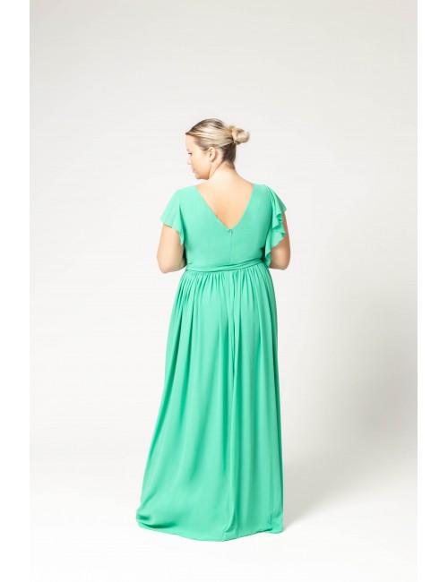 Long dress, in flowy fabric, waist cut, draped neckline, ruffle at the sleeves | Collection: Spring Summer | Model: Height 1.70m and wearing size 2XL |