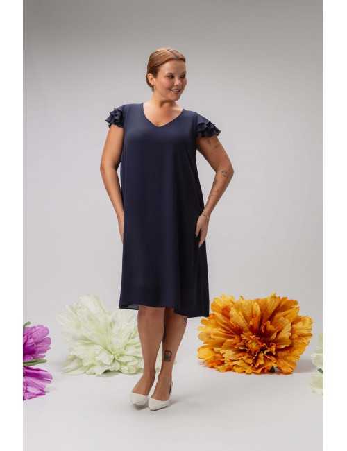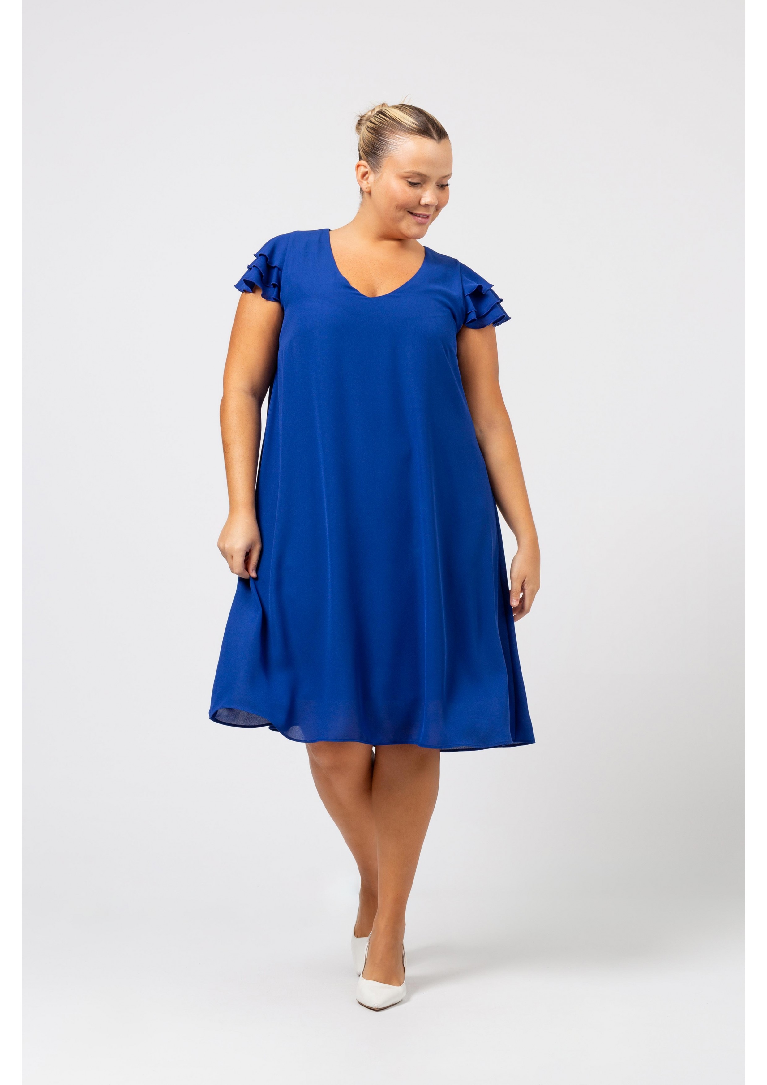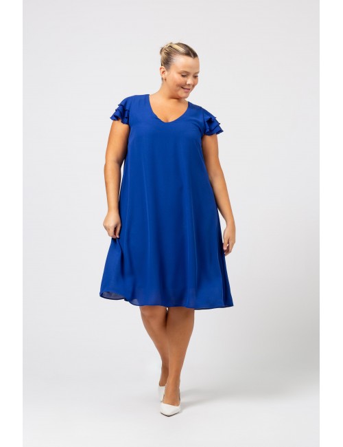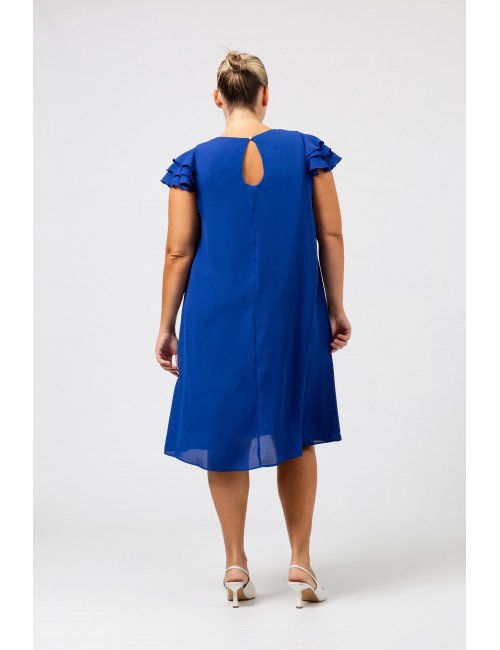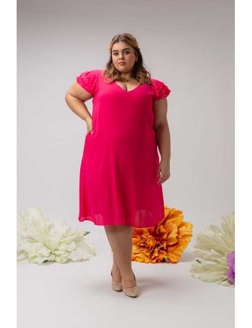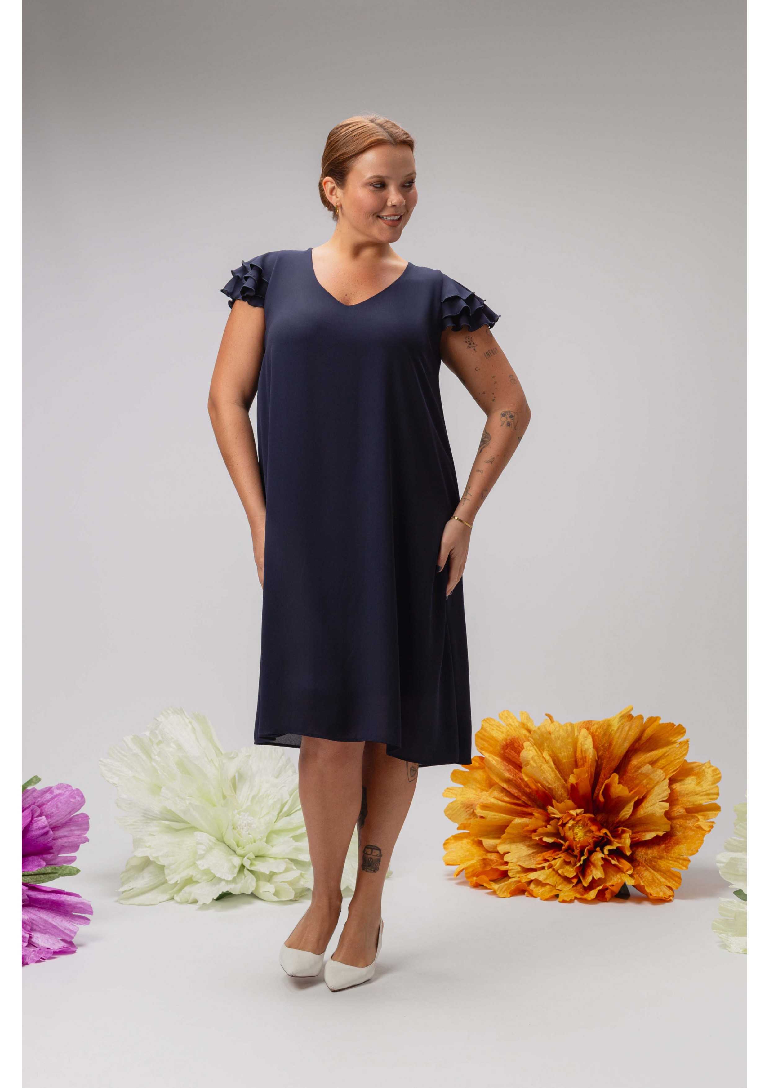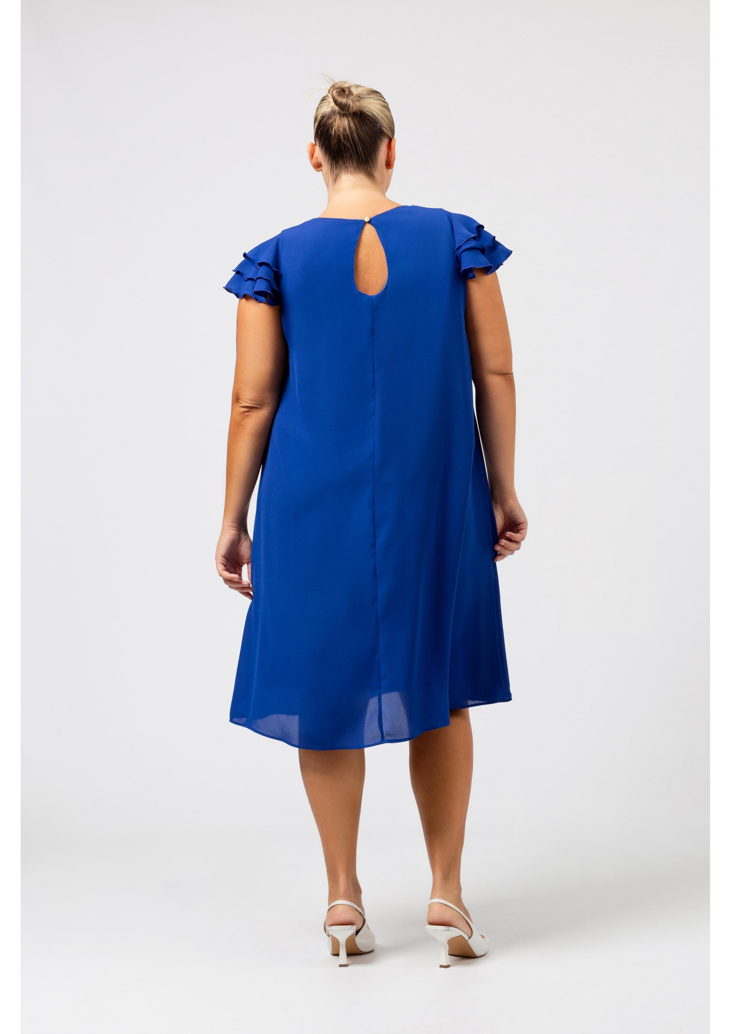 Dress in plain fabric, flared, three-tier puff sleeves with ruffle, Round neckline with a tear drop opening at the back, Lined piece. Collection: Spring Summer Available in Plus Sizes Own design and manufacturing brand. We are a clothing manufacturing brand with over 50 years of experience Model: Height 1.65m wearing size 2XL, in royal blue. Model: Height 1.67m wearing size 5XL, in pink Composition: Exterior: 100% Polyester | Lining: 94% Polyester 6% Elastane