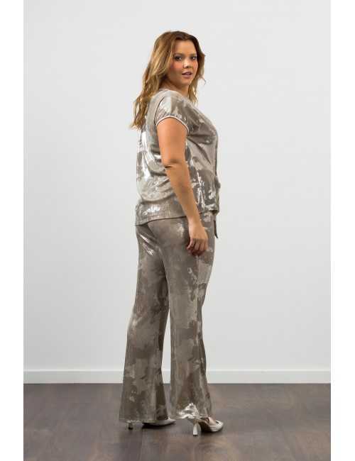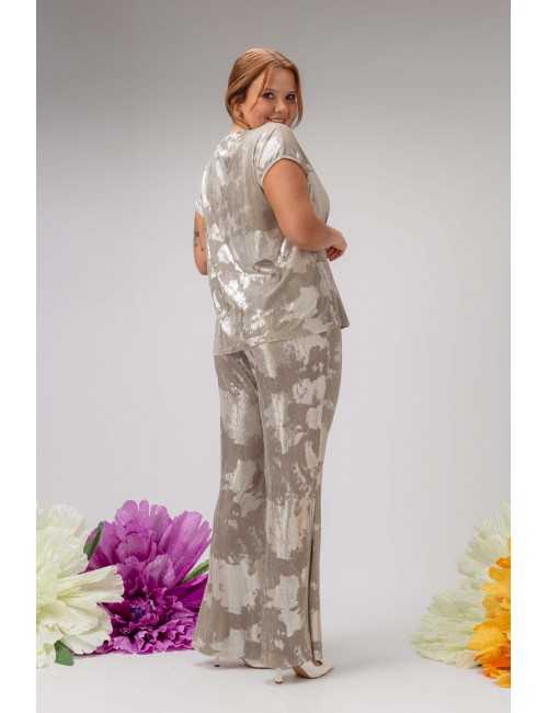 Shiny knit pants with an elastic waistband. Flared model. Collection: Spring Summer Available in Plus Sizes Own design and manufacturing product. We are a clothing manufacturing brand with over 50 years of experience Model: Height 1.70m and is wearing size 2XL. Composition: 95% Polyester 5% Elastane