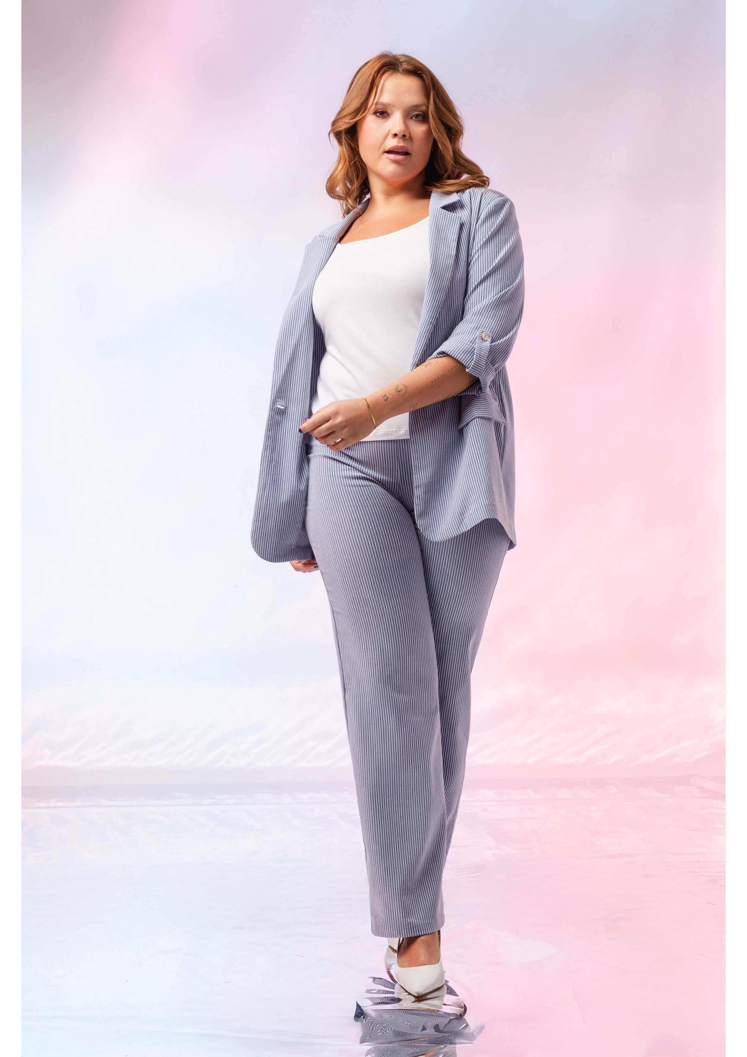 Blazer in vertical stripe fabric, turned at the front, with applied flaps. 3/4 sleeve with straps. Cut at the back. Collection: Spring/Summer Available in Plus Sizes Own design and manufacturing. We are a clothing brand with over 50 years of experience Model: Height 1.70m and wearing size 2XL. Composition: 57% Polyester 40% Viscose 3% Elastane