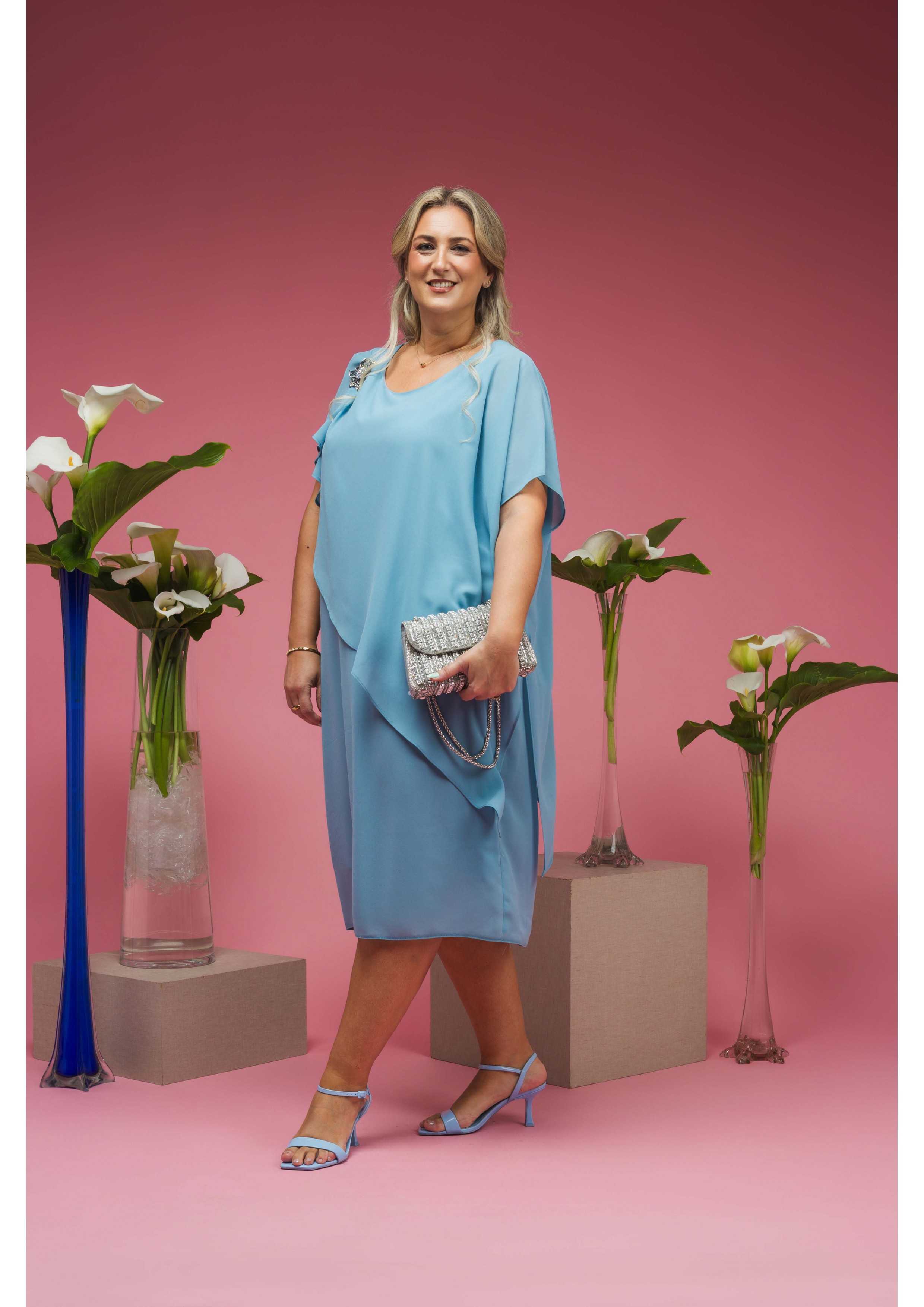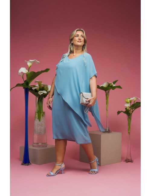 Solid fabric dress. Knee-length model, round neckline. Asymmetrical overlay cape made of the same material. Collection: Spring Summer Available in Plus Sizes Own design and manufacturing. We are a garment manufacturing brand with over 50 years of experience Model 1: Height 1.80m and wearing size G Model 2: Height 1.70m and wearing size XL Composition: 100% Polyester|95% Polyester 5% Elastane
