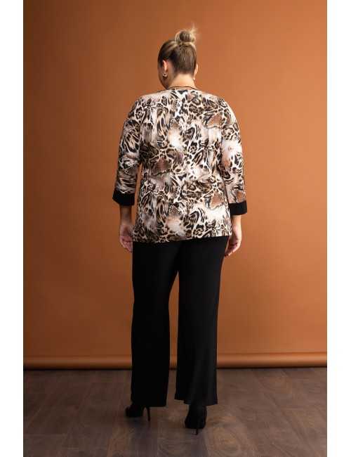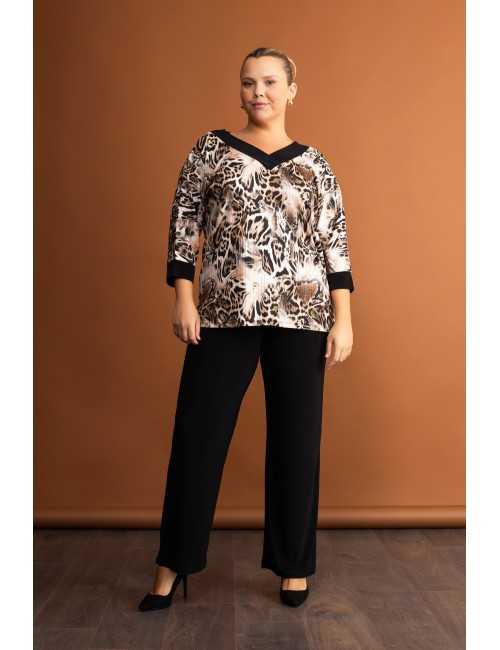 Set in printed and solid knit, leopard print sweater, solid pants with elastic. Collection: Autumn Winter Available in Plus Sizes Own design and manufacturing product. We are a clothing manufacturing brand with over 50 years of experience Model: Height 1.70m and is wearing size 2XL. Composition: 94% Polyester 6% Elastane