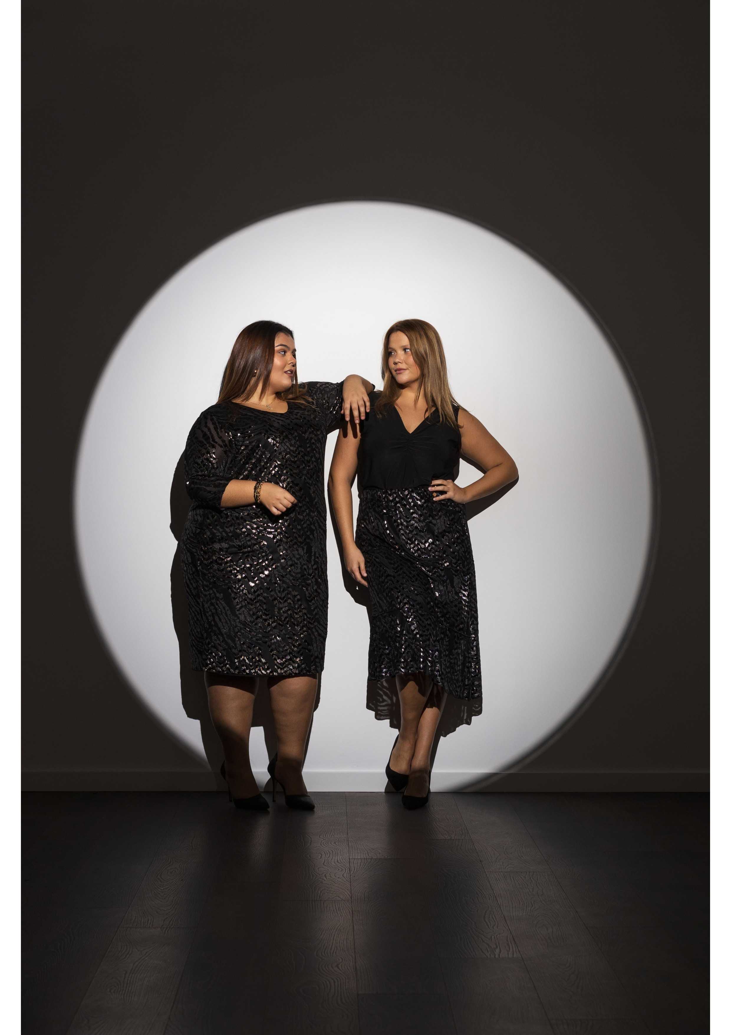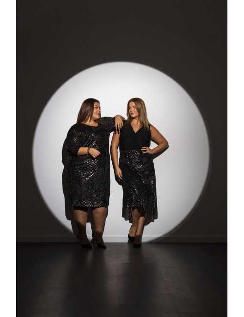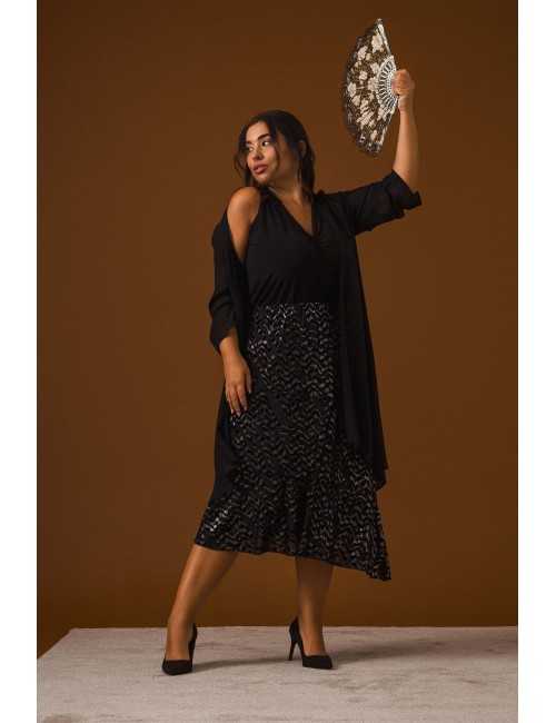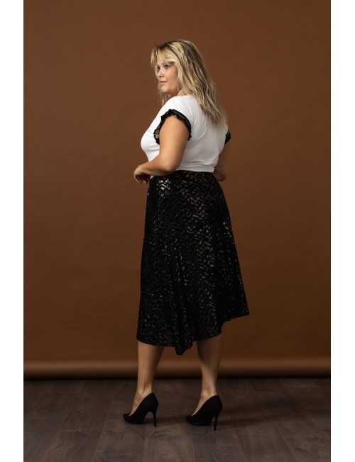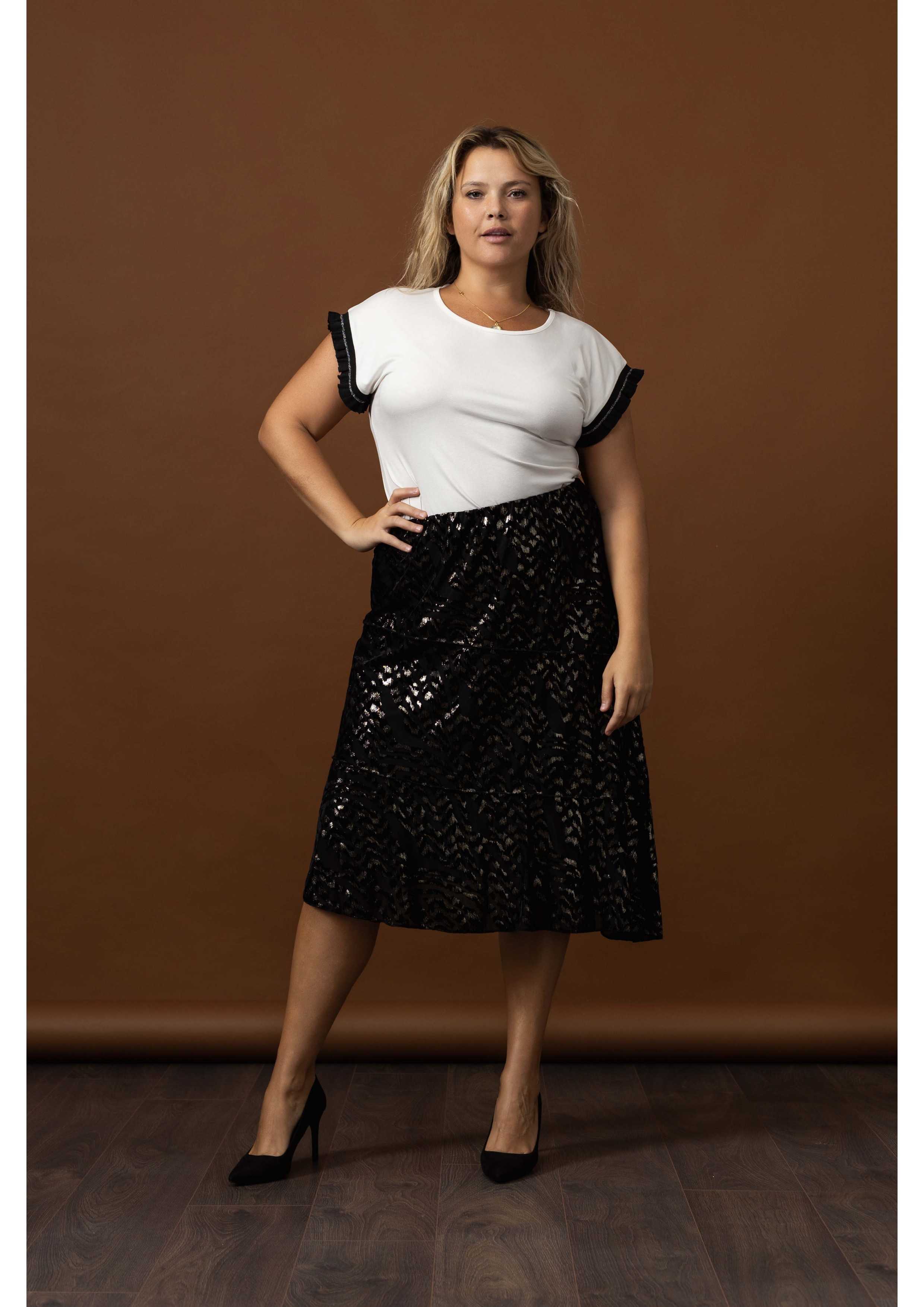 Printed knit skirt, layered ruffles, slightly flared and lined. Collection: Autumn Winter Model: Height 1.63m and wearing size 2XL, in gold color. Model: Height 1.70m and wearing size 2XL, in silver color