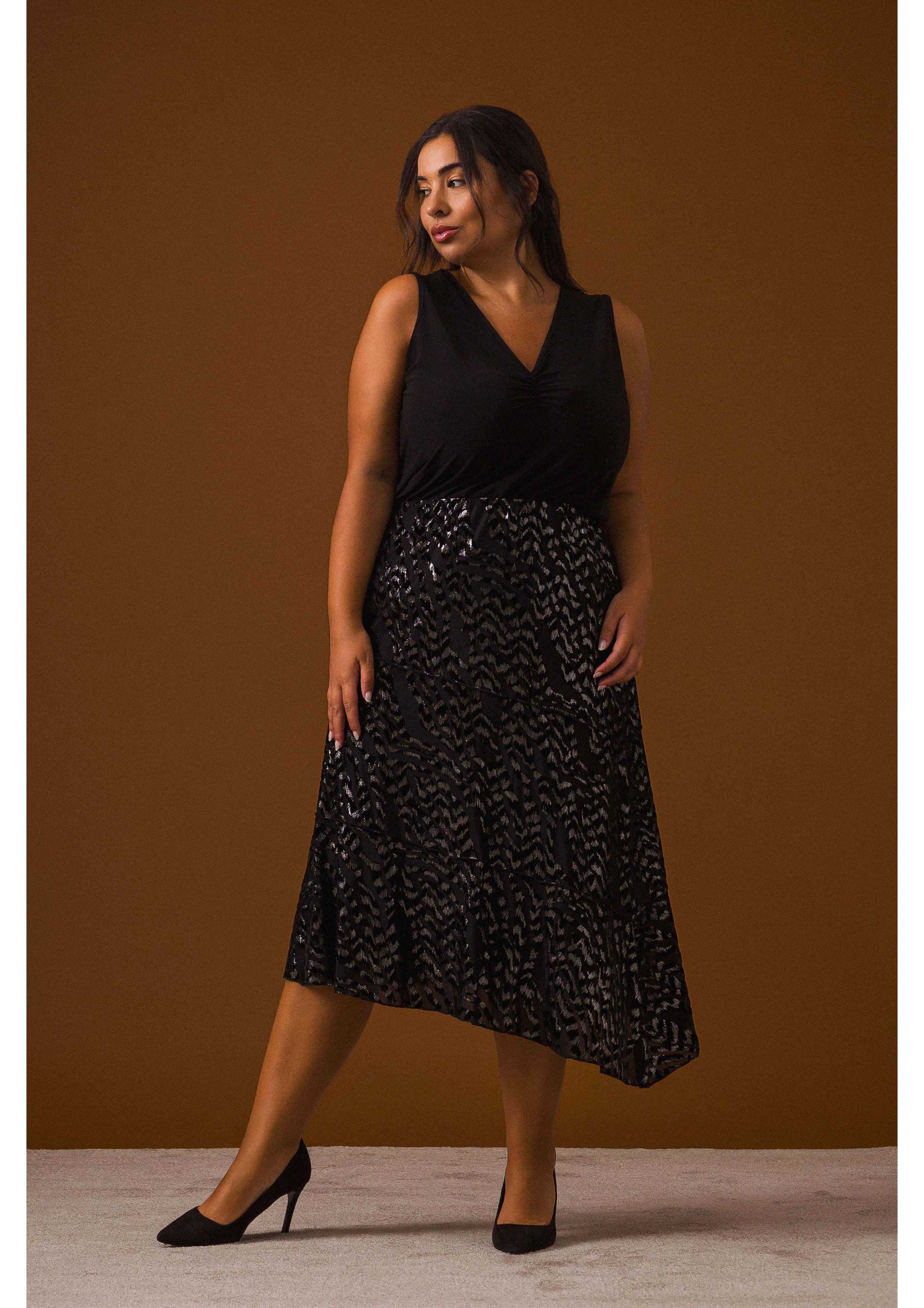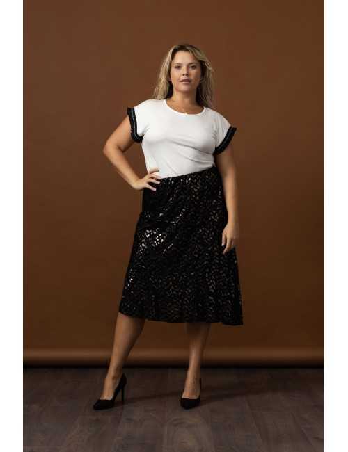 Printed knit skirt, layered ruffles, slightly flared and lined. Collection: Autumn Winter Available in Plus Sizes Own design and manufacturing product. We are a clothing manufacturing brand with over 50 years of experience Model: Height 1.63m and wearing size 2XL, in gold color. Model: Height 1.70m and wearing size 2XL, in silver color Composition: 44% Polyamide 43% Polyester 13% Elastane