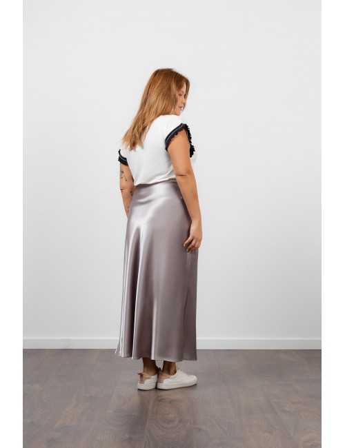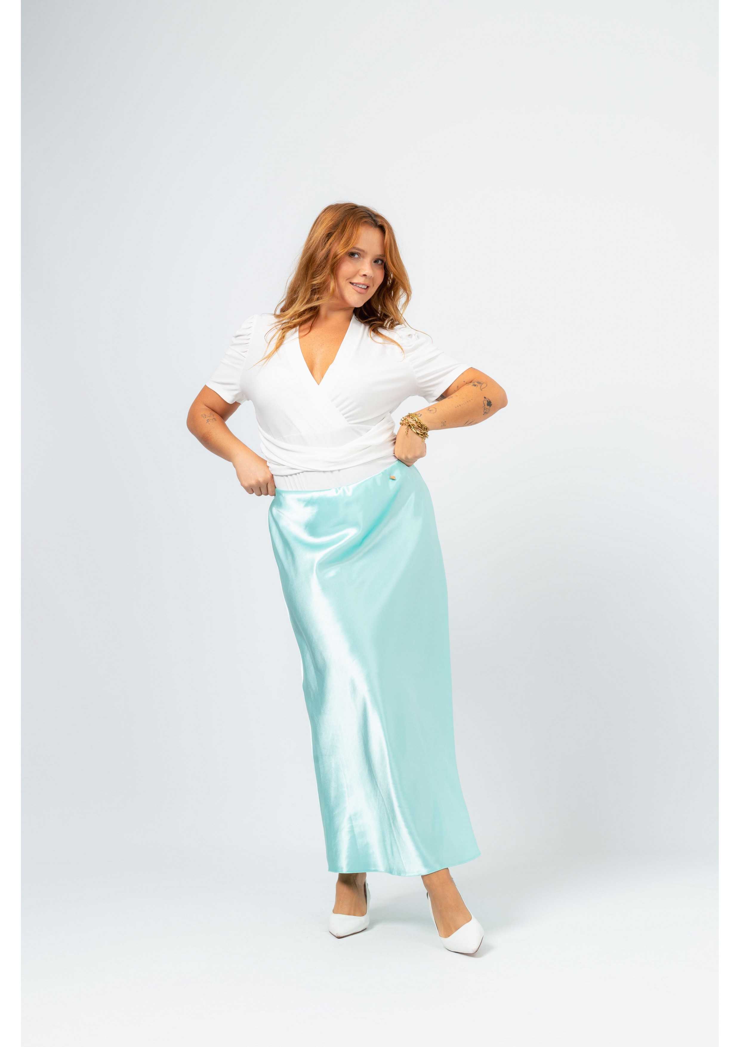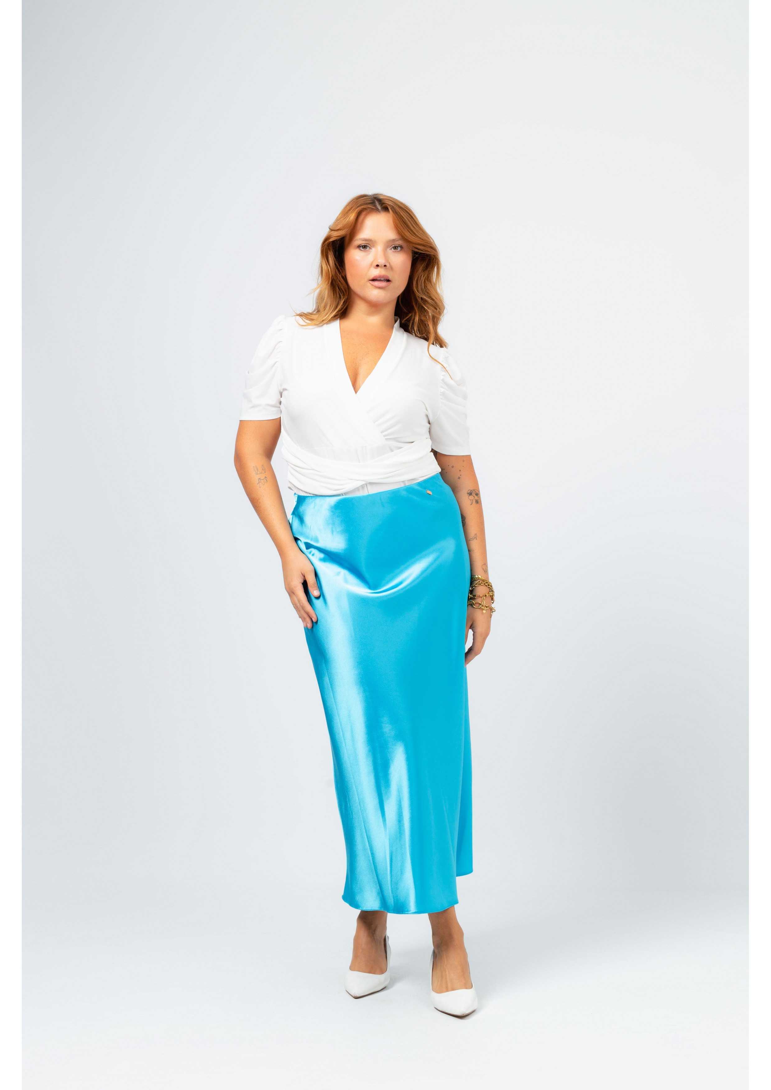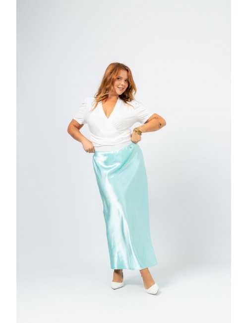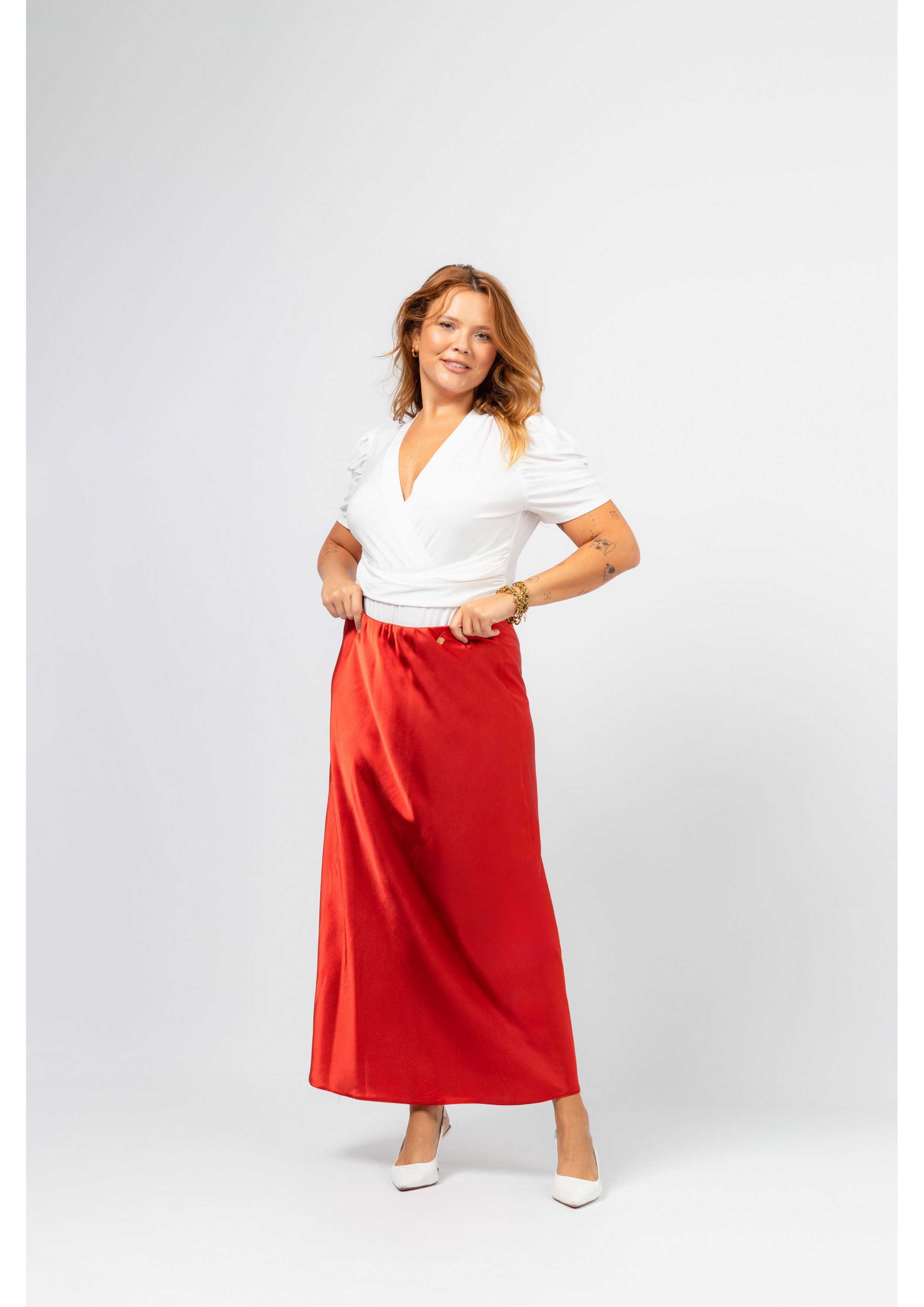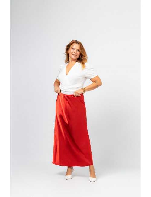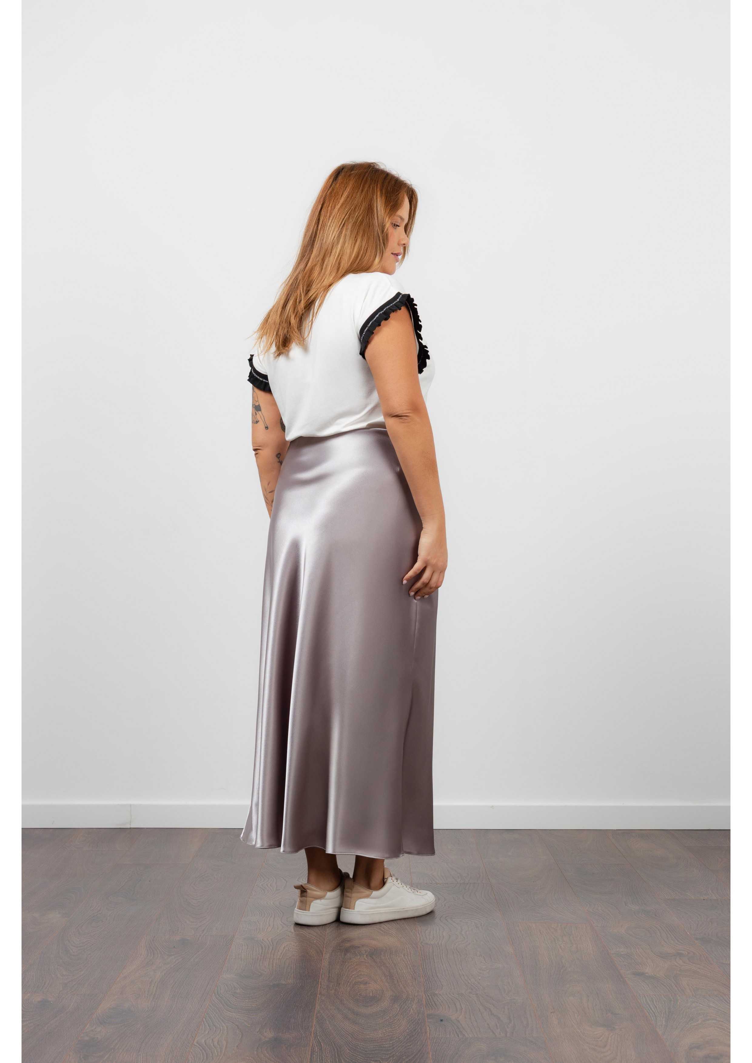 Solid fabric skirt, shiny satin. A-line model, knee-length. Elastic waistband. Collection: Spring Summer Available in Plus Sizes Own design and manufacturing product. We are a clothing brand with over 50 years of experience Model: Height 1.70m and is wearing size 2XL. Composition: 97% Polyester 3% Elastane