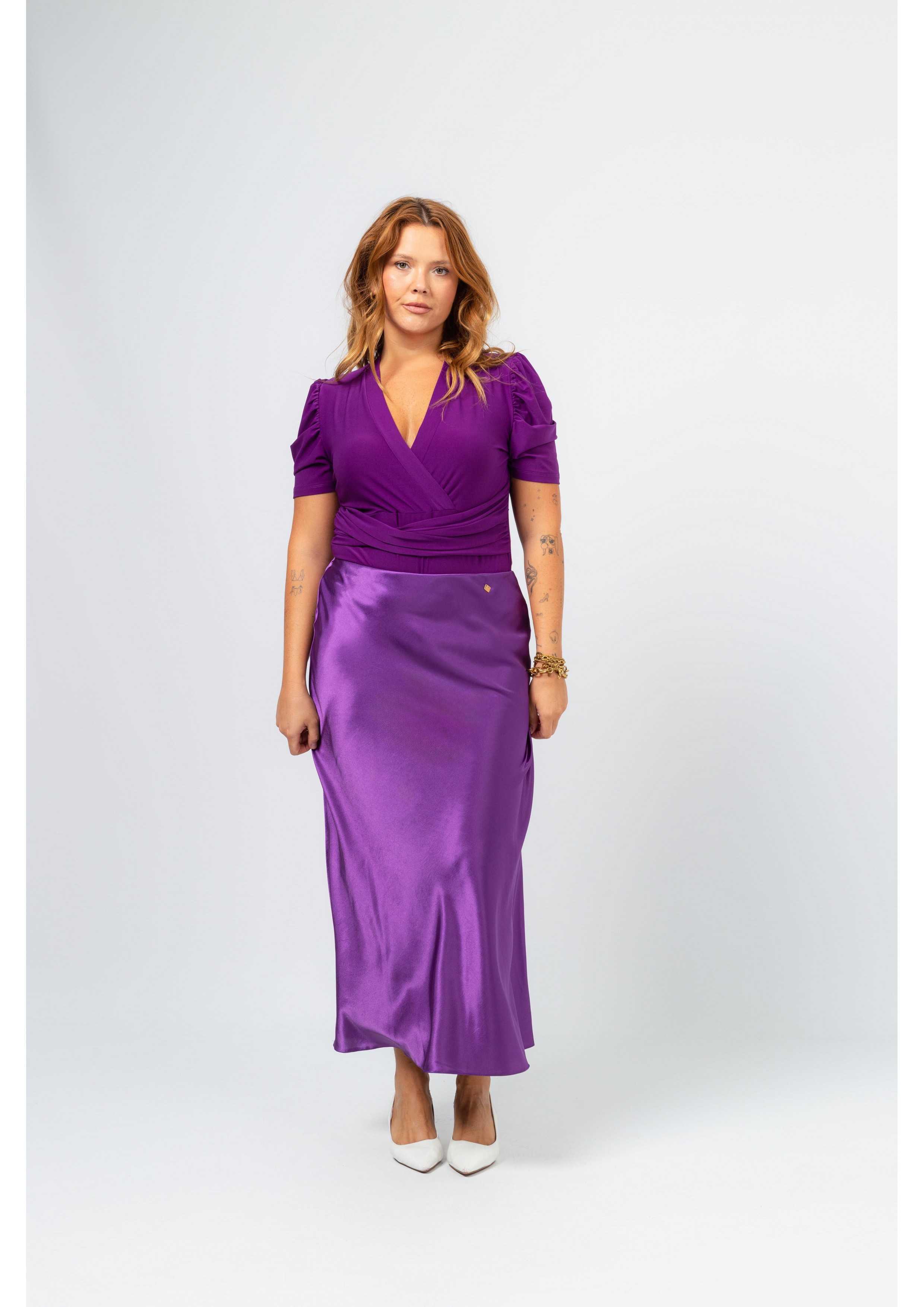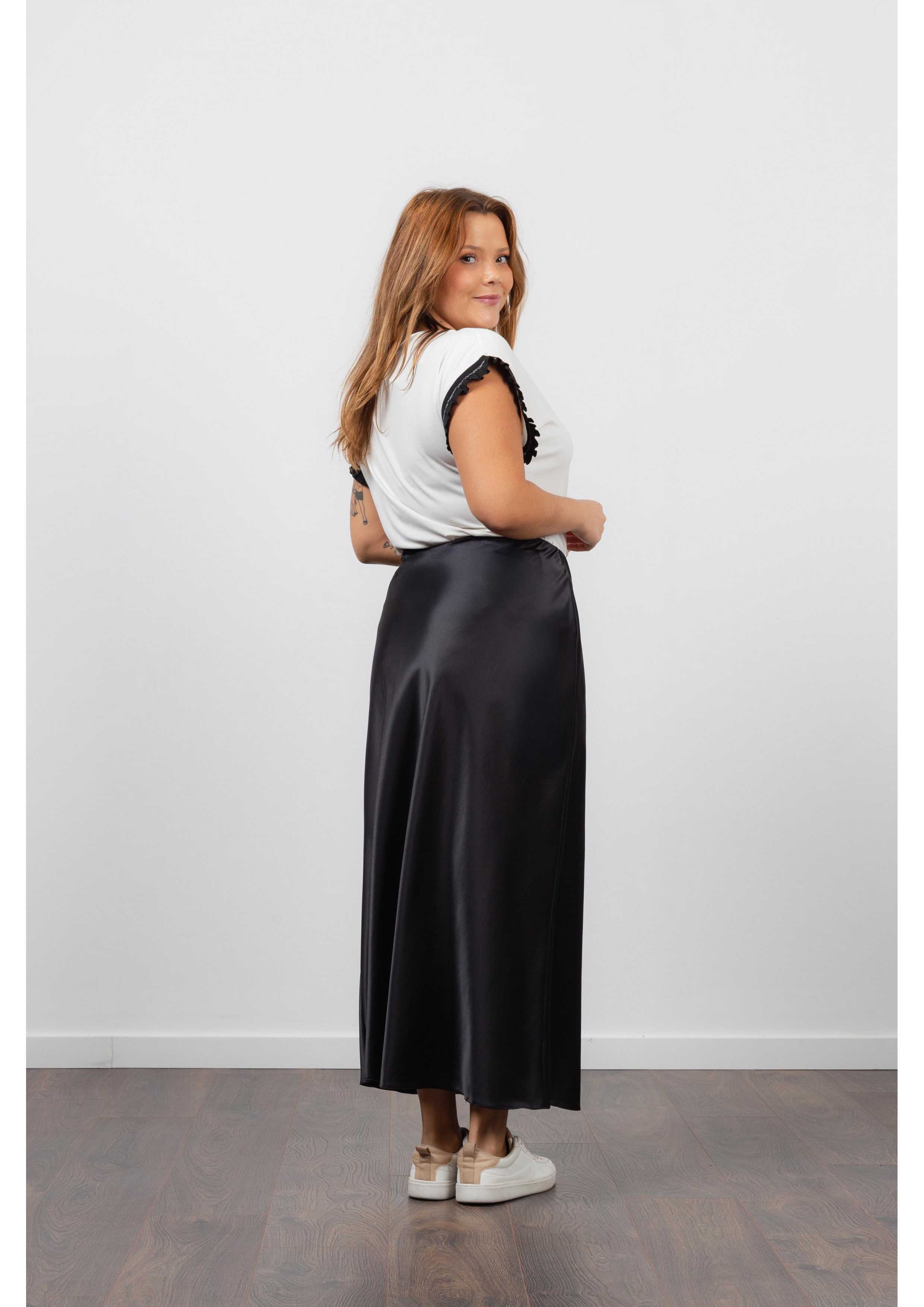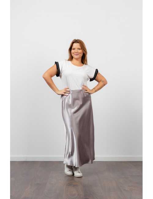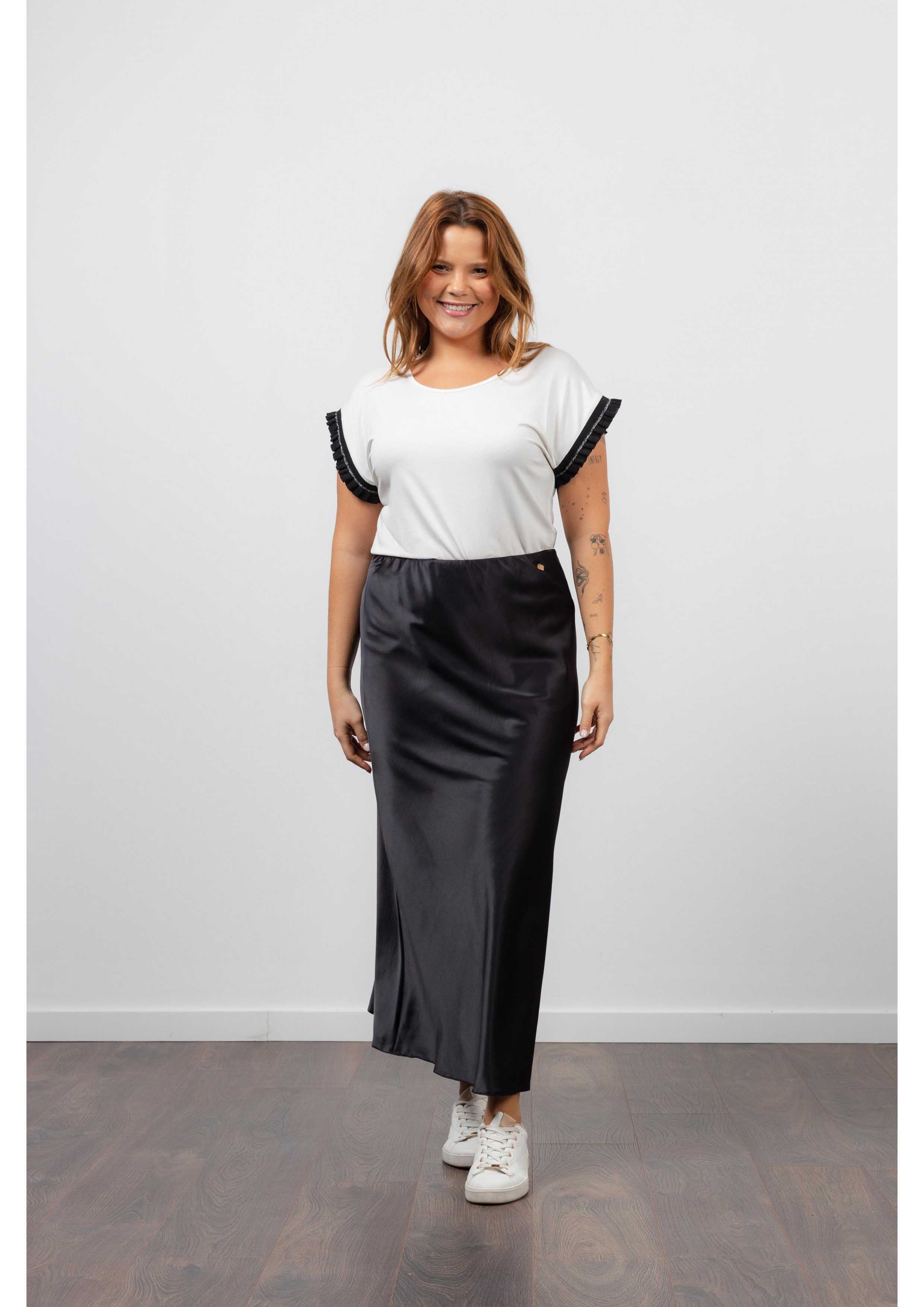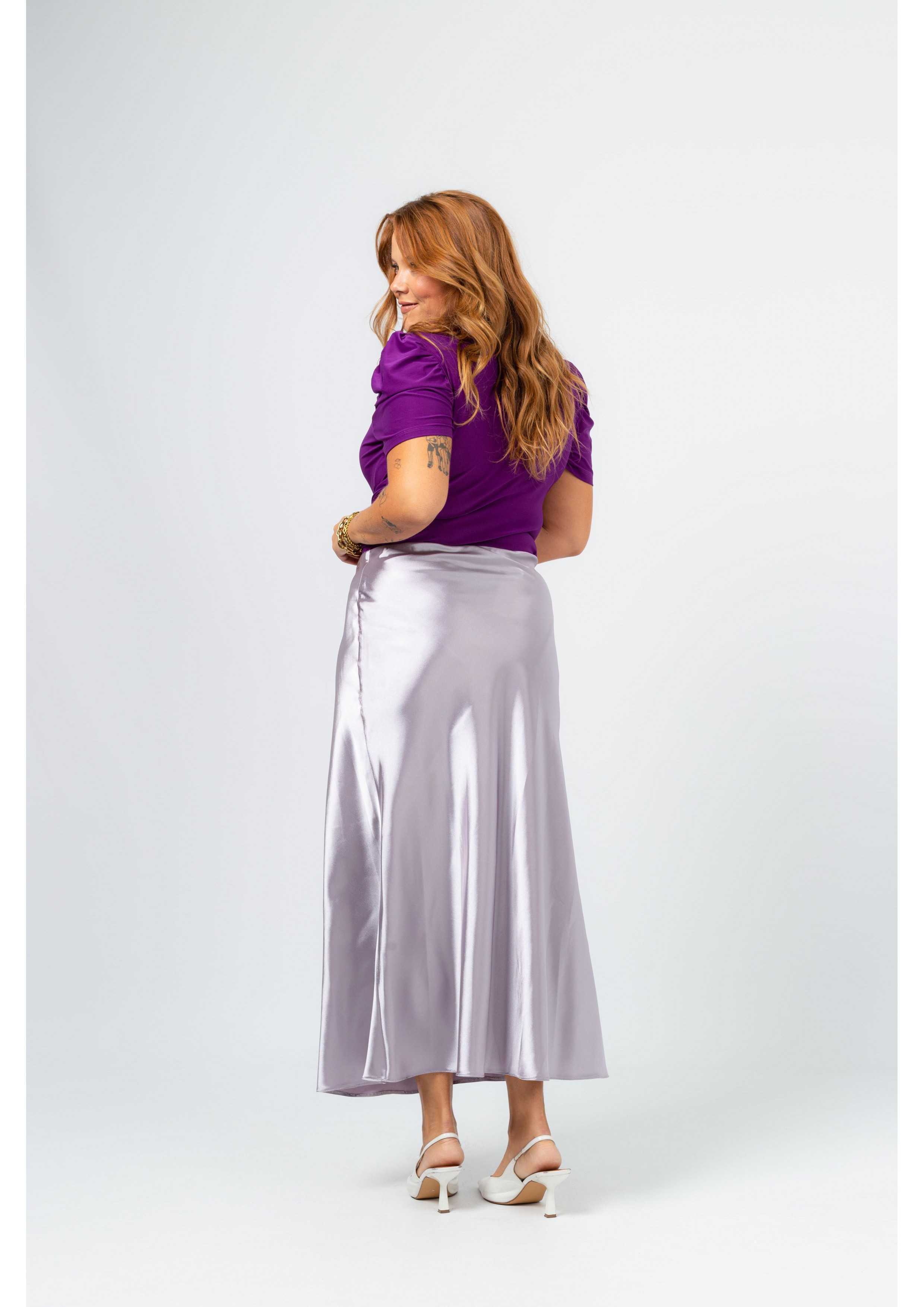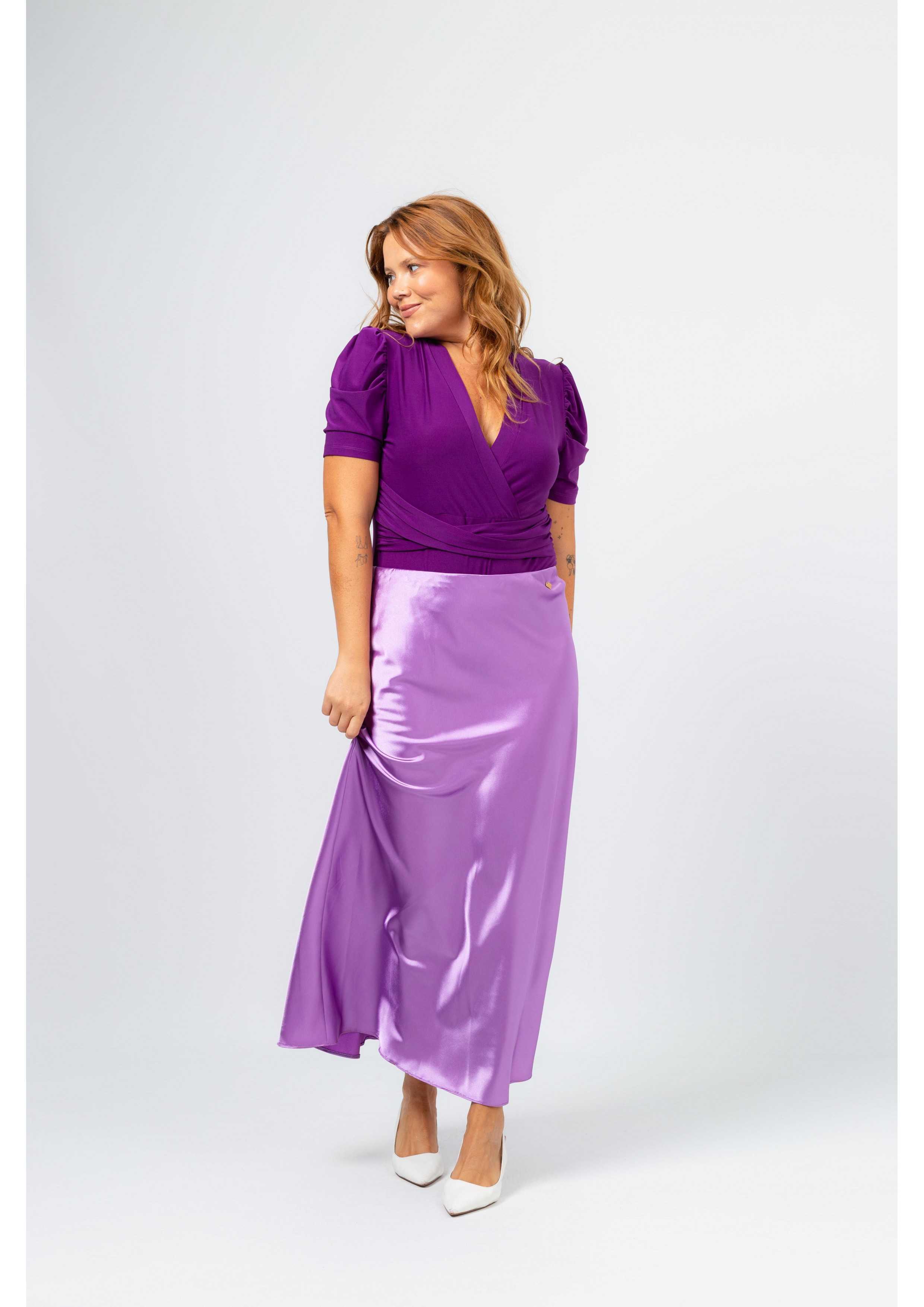 Solid fabric skirt, shiny satin. A-line model, knee-length. Elastic waistband. Collection: Spring Summer Available in Plus Sizes Own design and manufacturing product. We are a clothing brand with over 50 years of experience Model: Height 1.70m and is wearing size 2XL. Composition: 97% Polyester 3% Elastane