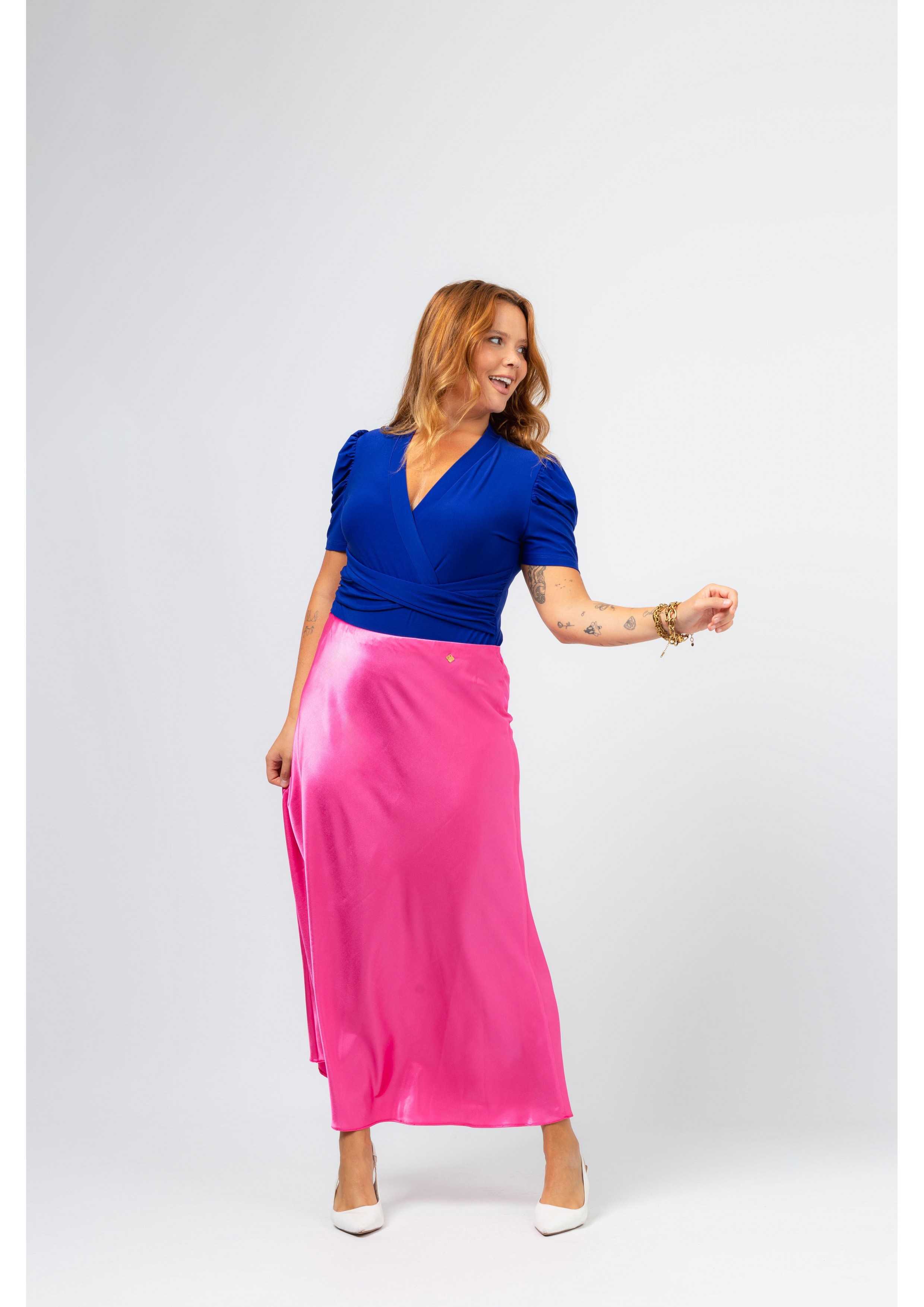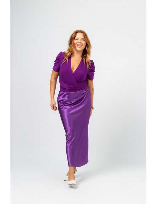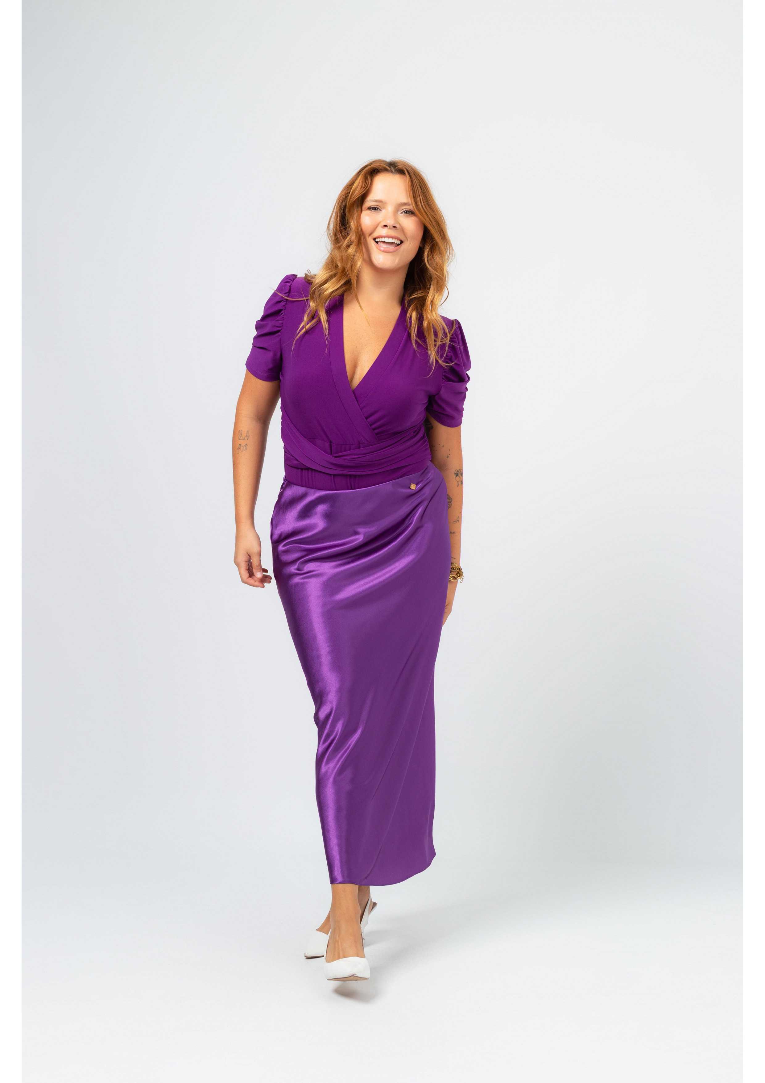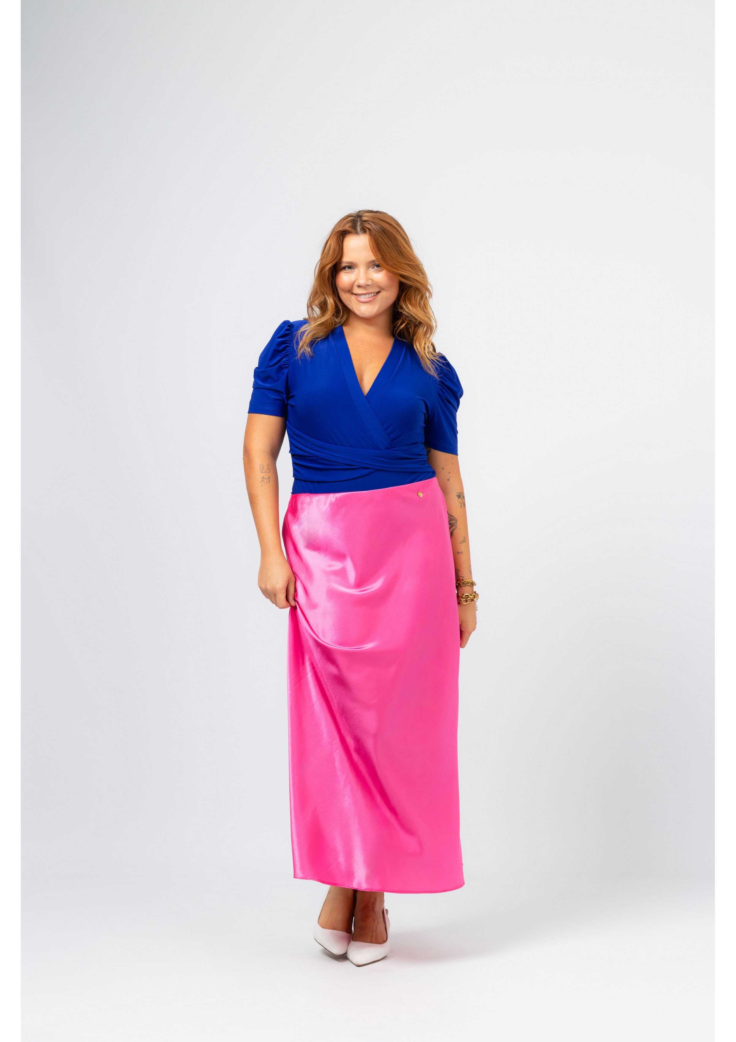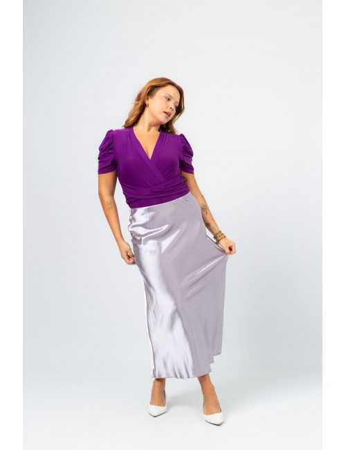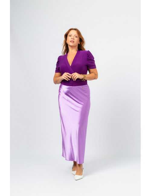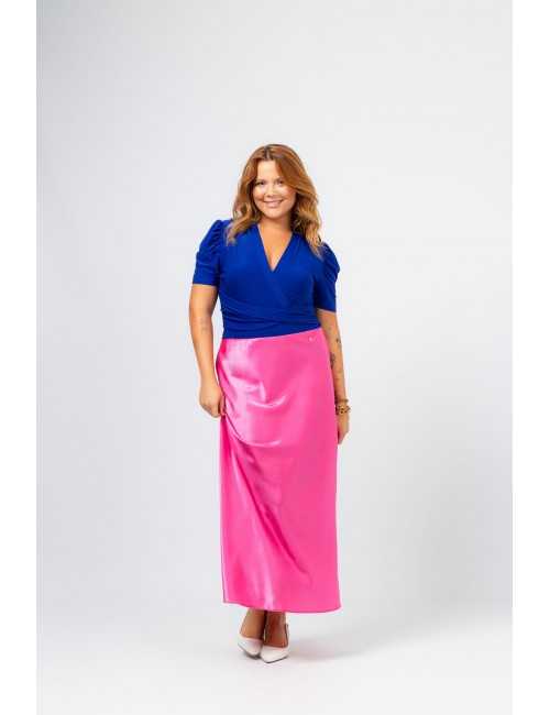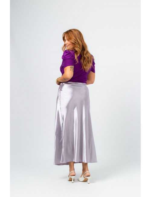 Solid fabric skirt, shiny satin. A-line model, knee-length. Elastic waistband. Collection: Spring Summer Available in Plus Sizes Own design and manufacturing product. We are a clothing brand with over 50 years of experience Model: Height 1.70m and is wearing size 2XL. Composition: 97% Polyester 3% Elastane