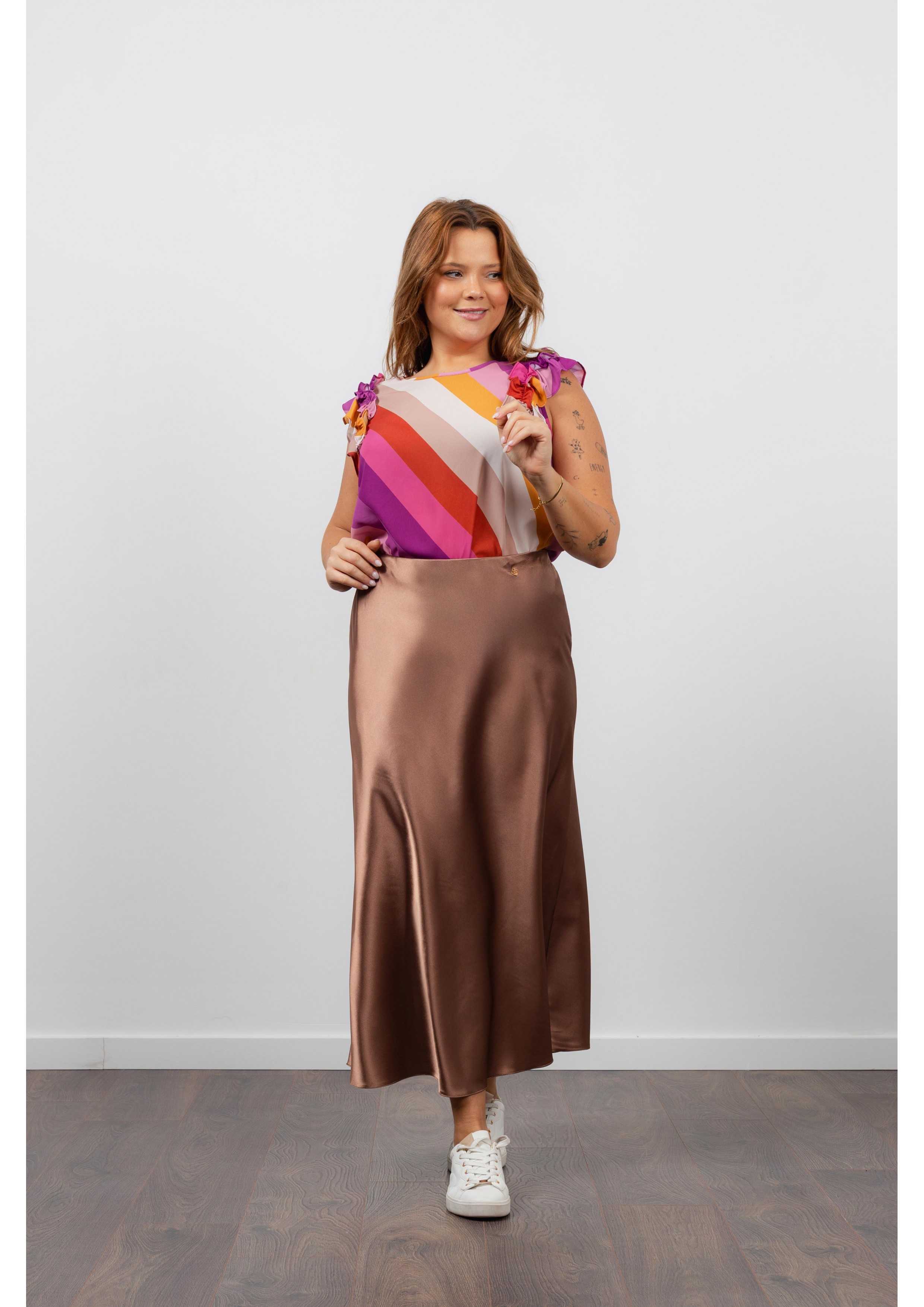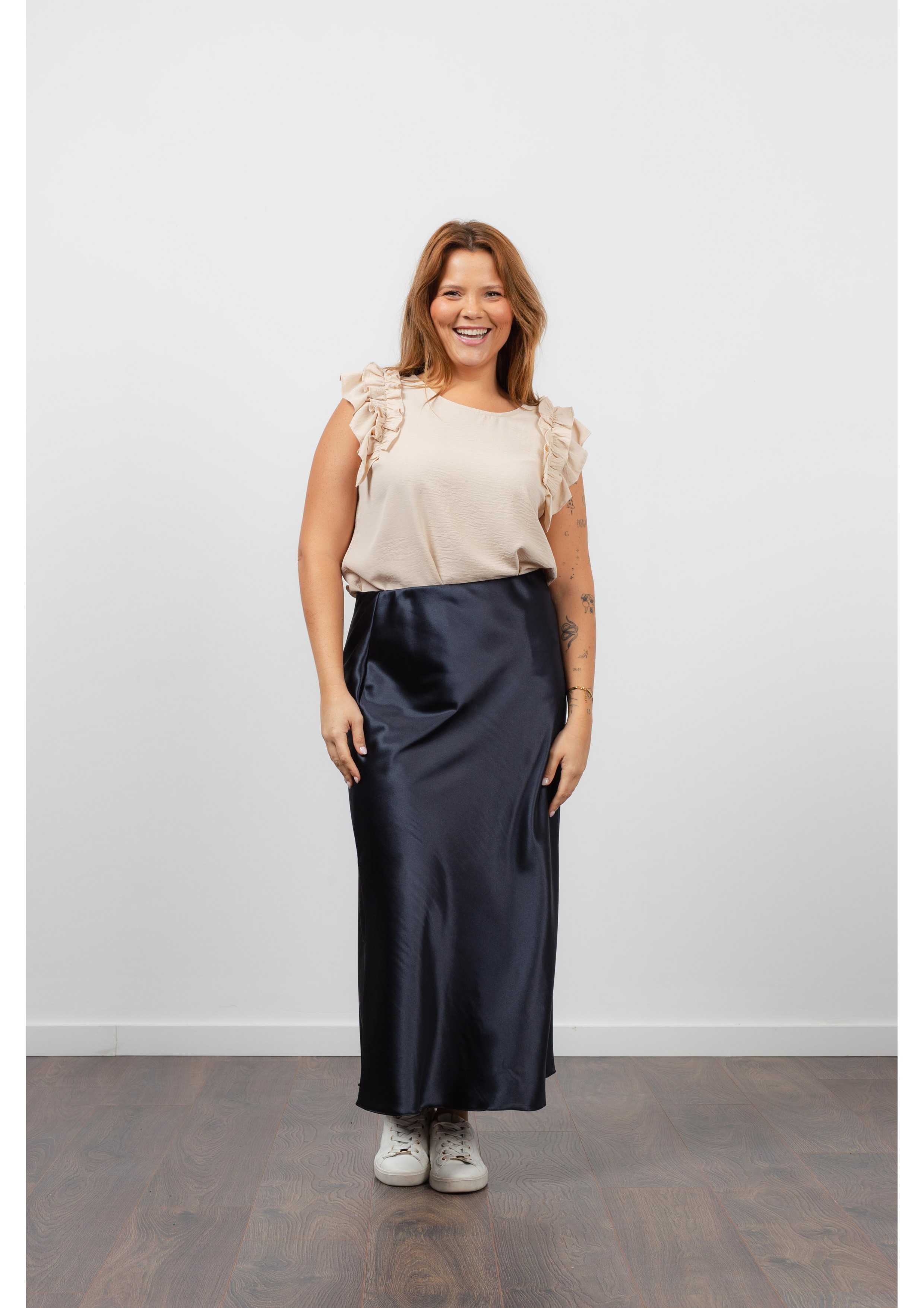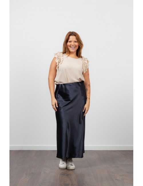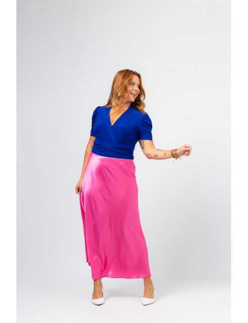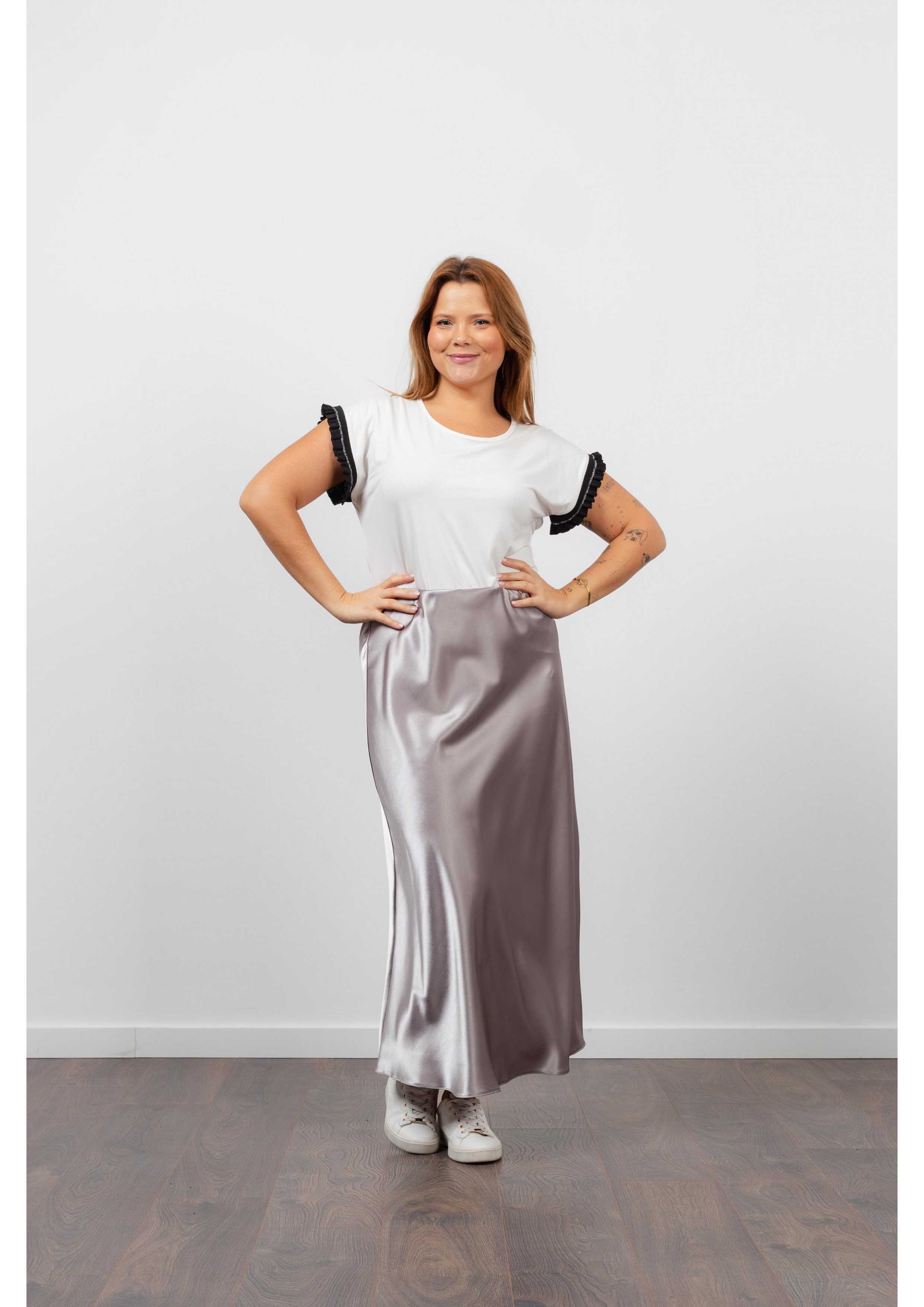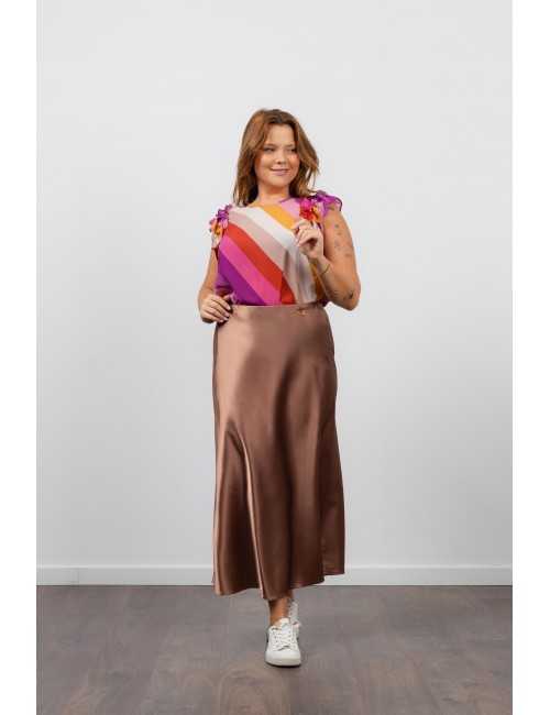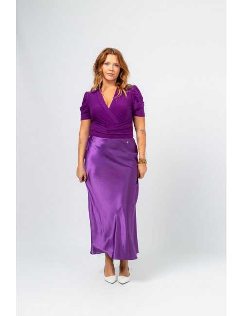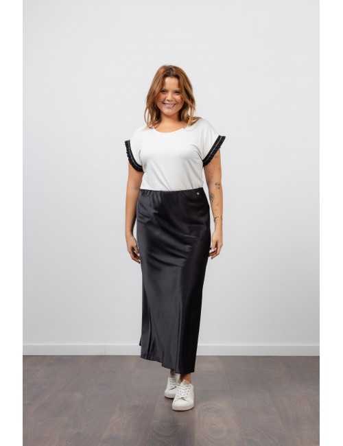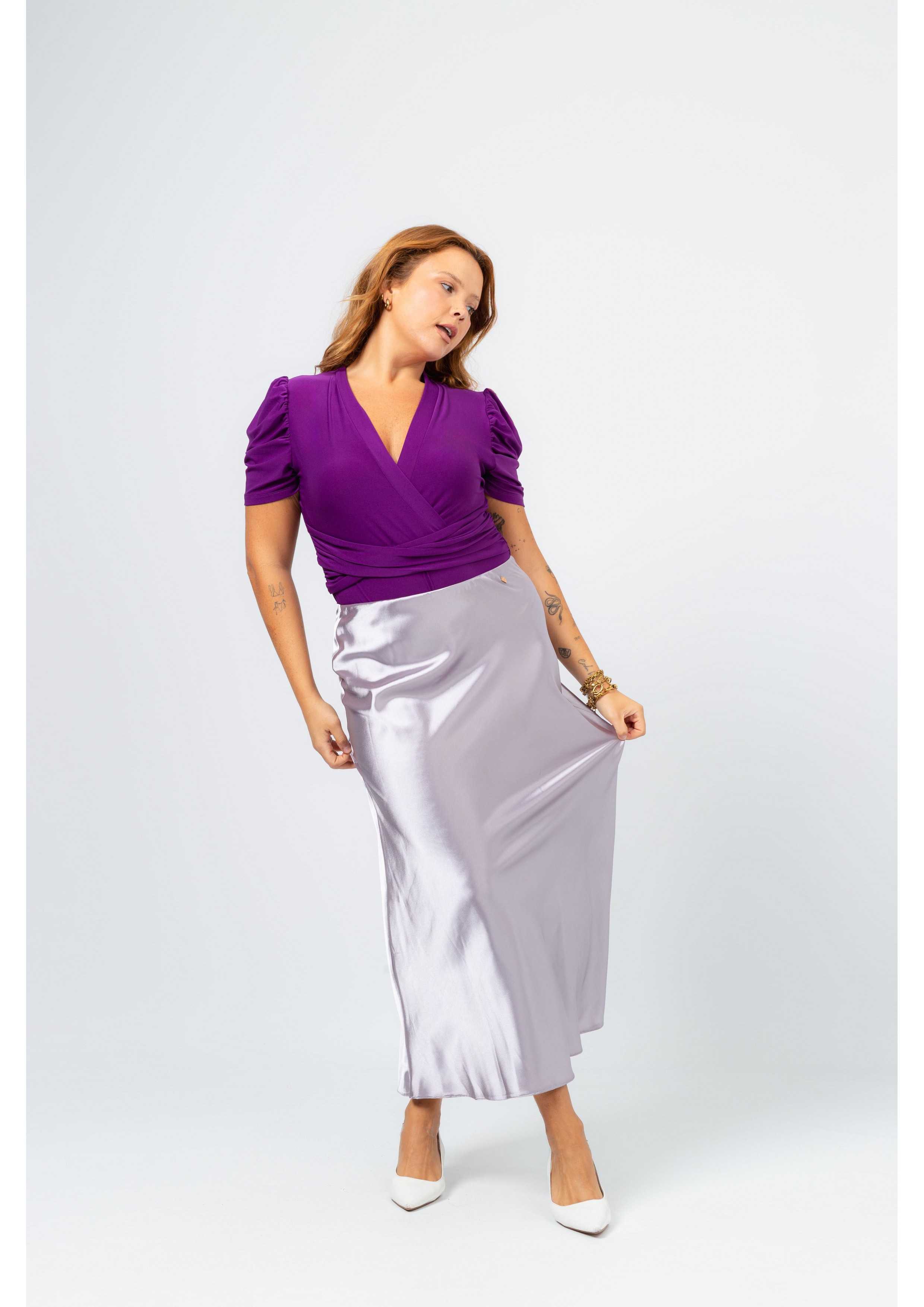 Solid fabric skirt, shiny satin. A-line model, knee-length. Elastic waistband. Collection: Spring Summer Available in Plus Sizes Own design and manufacturing product. We are a clothing brand with over 50 years of experience Model: Height 1.70m and is wearing size 2XL. Composition: 97% Polyester 3% Elastane