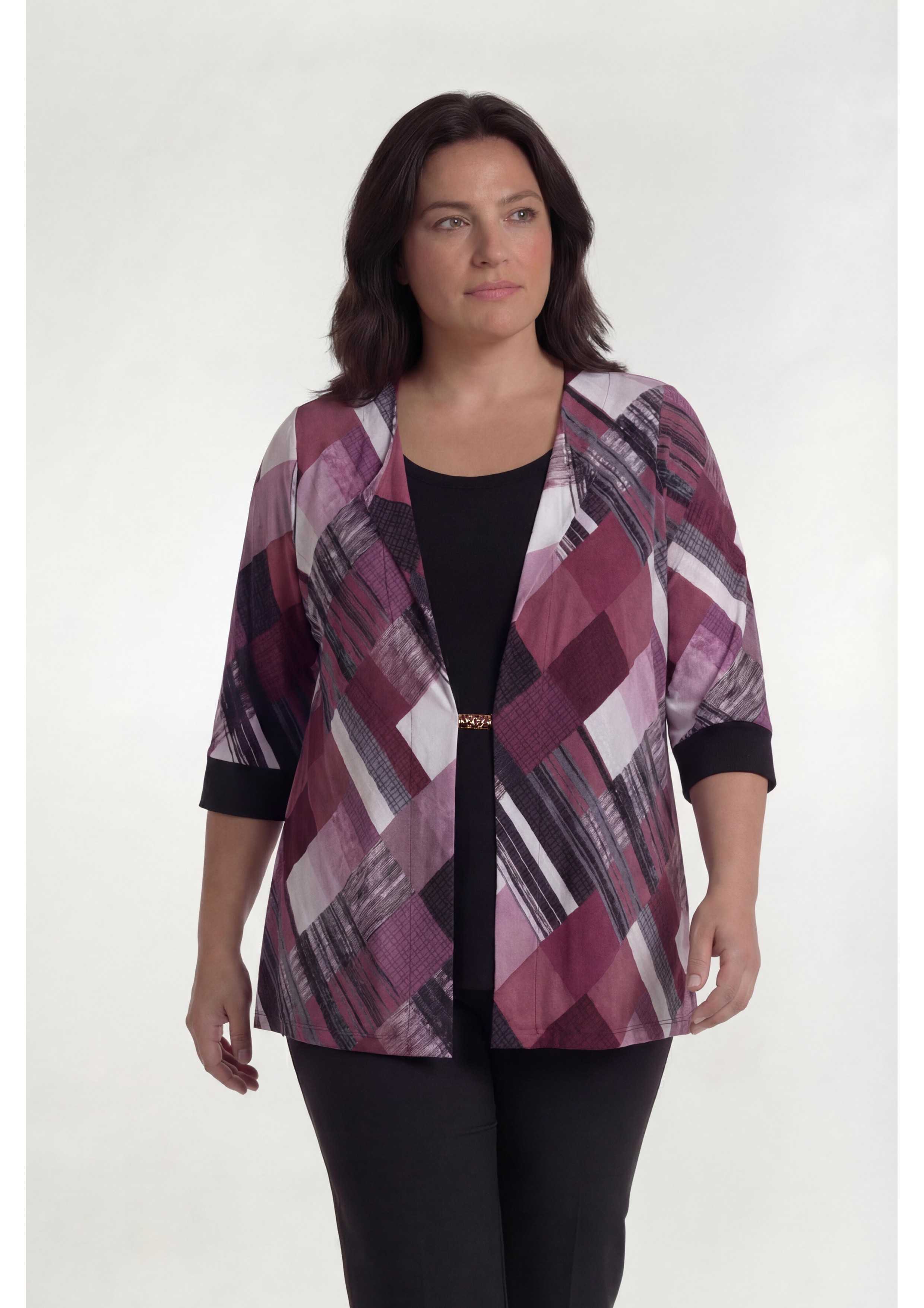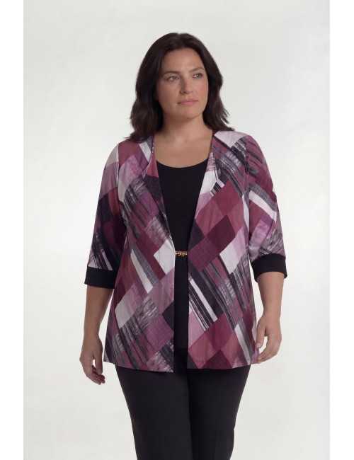Printed and plain knit set, 2 in 1, in black tones. Plain camisole, front only attached to the jacket, Printed jacket with 3/4 sleeves and plain cuffs. Features an application joining the front of the jacket. Available in Plus Sizes Product of our own design and manufacture. We are a clothing manufacturing brand with over 50 years of experience Composition: |
