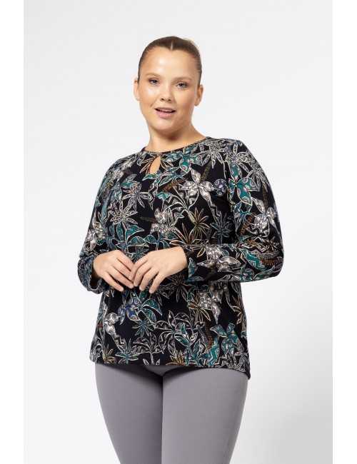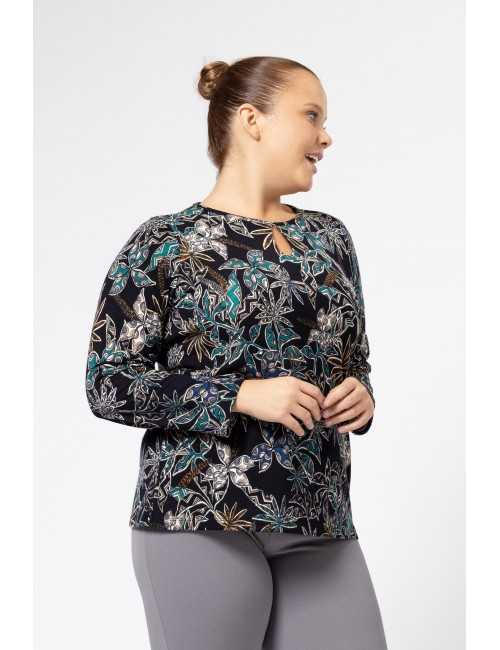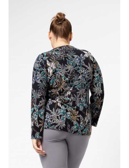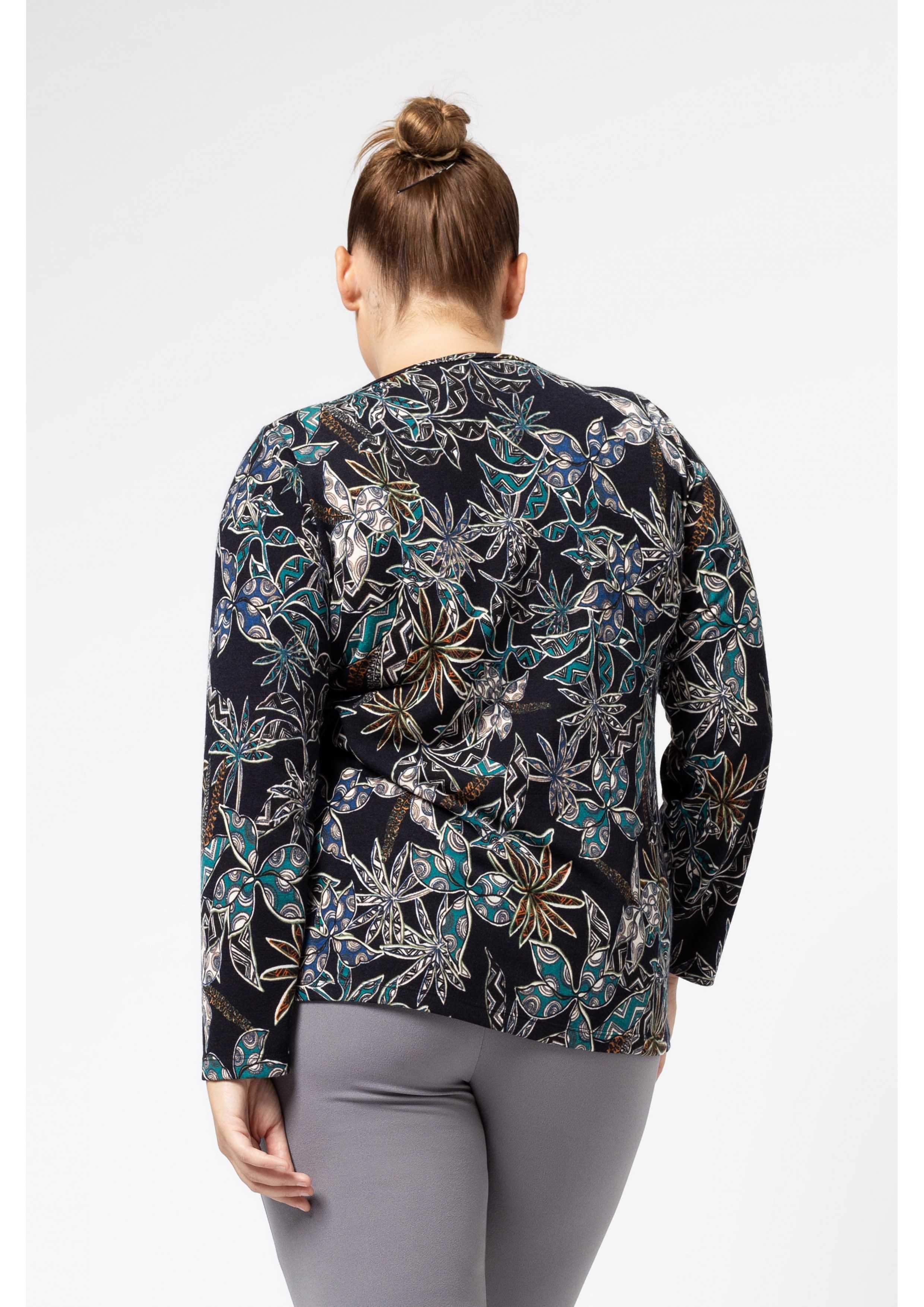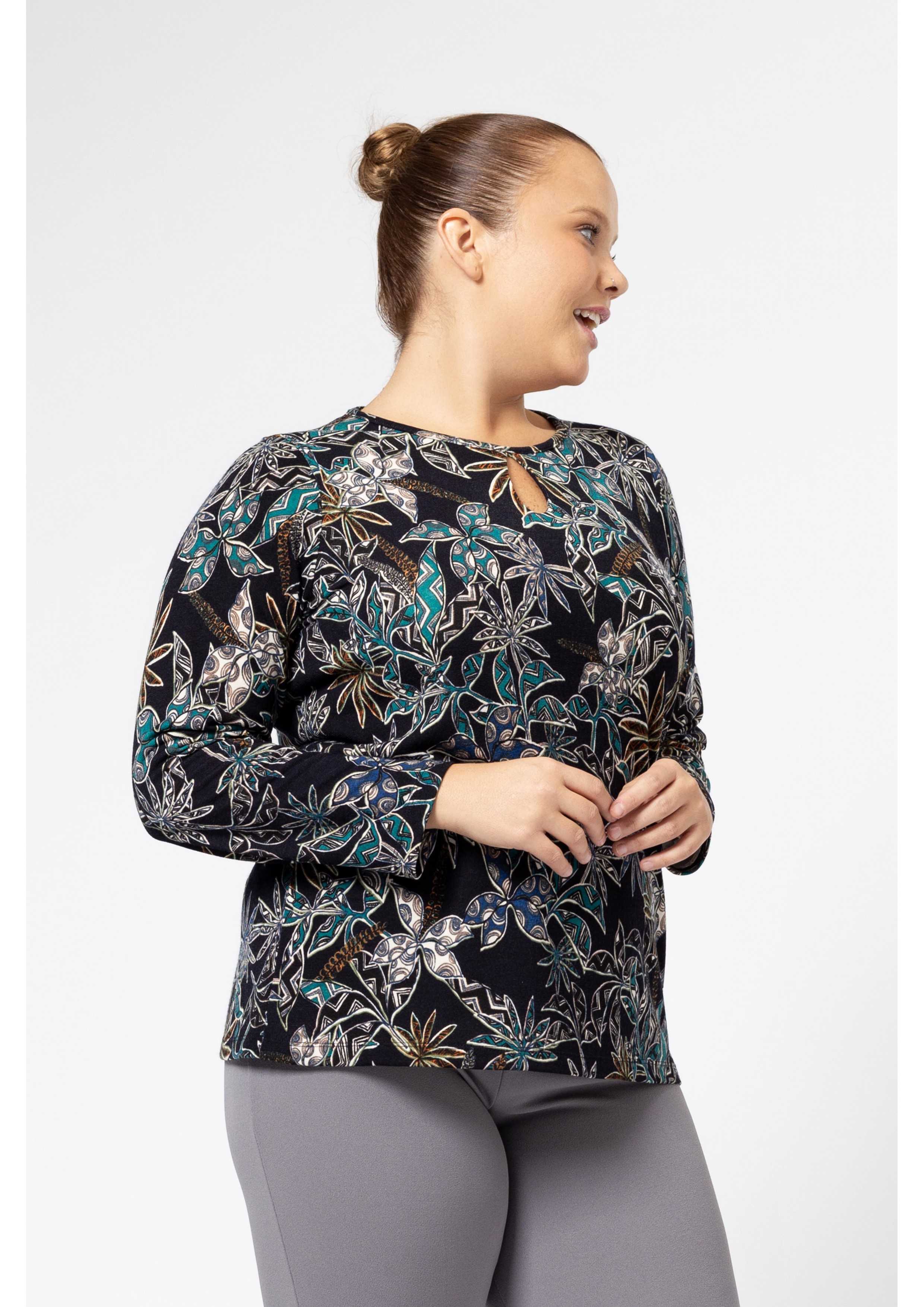 Printed knit sweater, round neckline with makeup, features a tear drop in the front. Collection: Autumn Winter Available in Plus Sizes Product designed and manufactured in-house. We are a clothing manufacturing brand with over 50 years of experience Model: Height 5.57ft and is wearing size 2XL. Composition: 95% Polyester 5% Elastane
