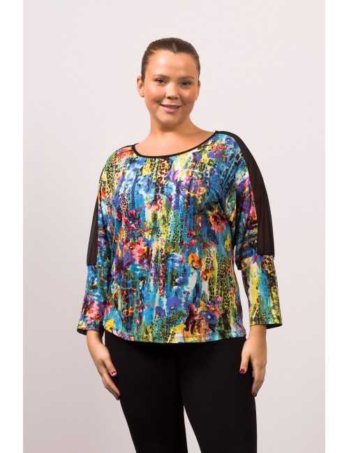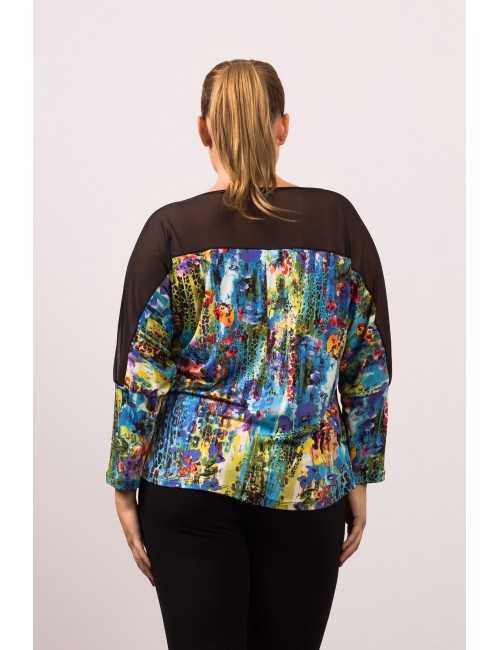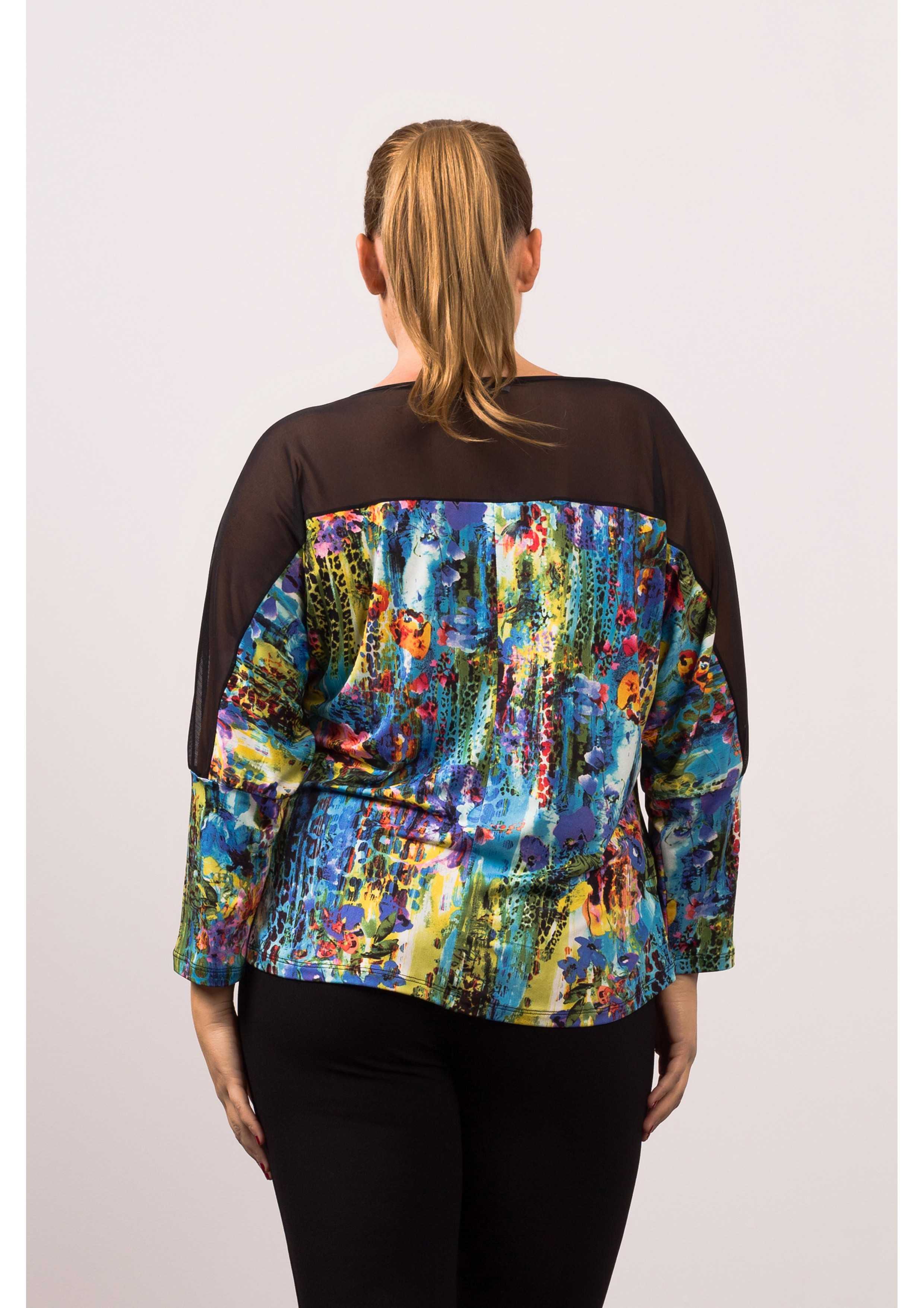 Printed knit sweater, bat sleeves, back neckline in smooth tulle. Collection: Spring Summer Available in Plus Sizes Own design and manufacturing. We are a clothing brand with over 50 years of experience Model: Height 1.70m and wearing size 2XL. Composition: 96% Polyester 4% Elastane
