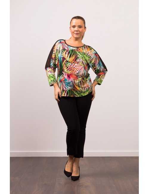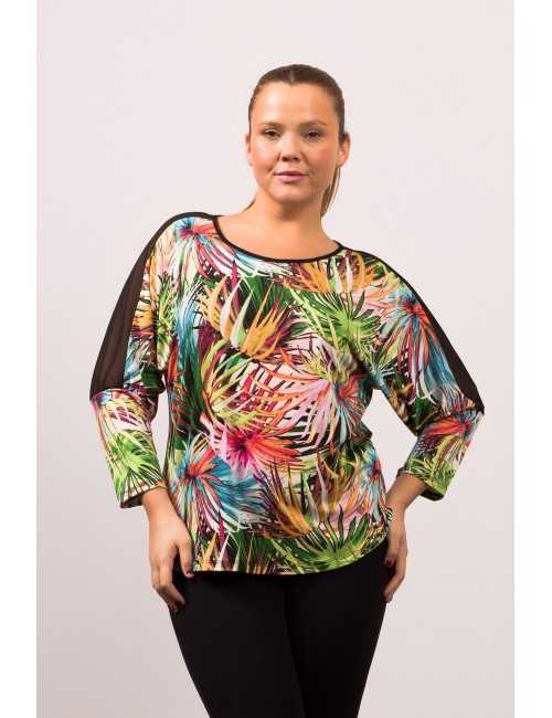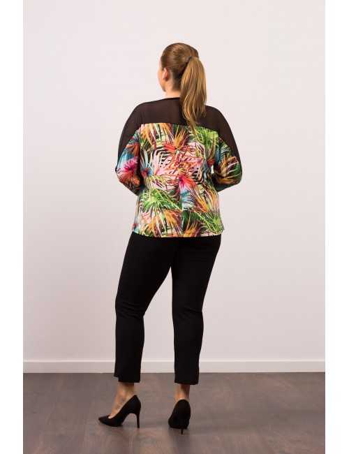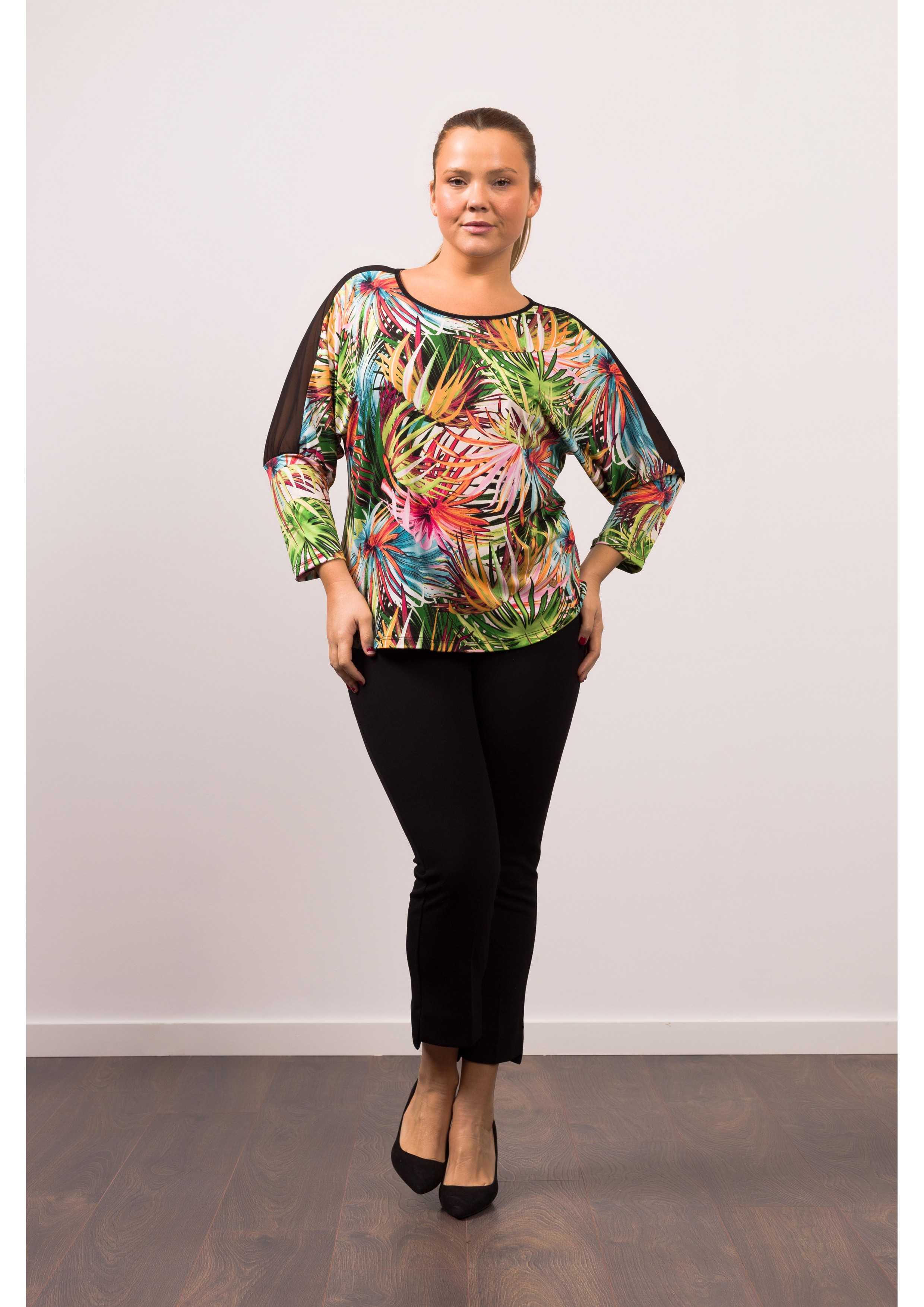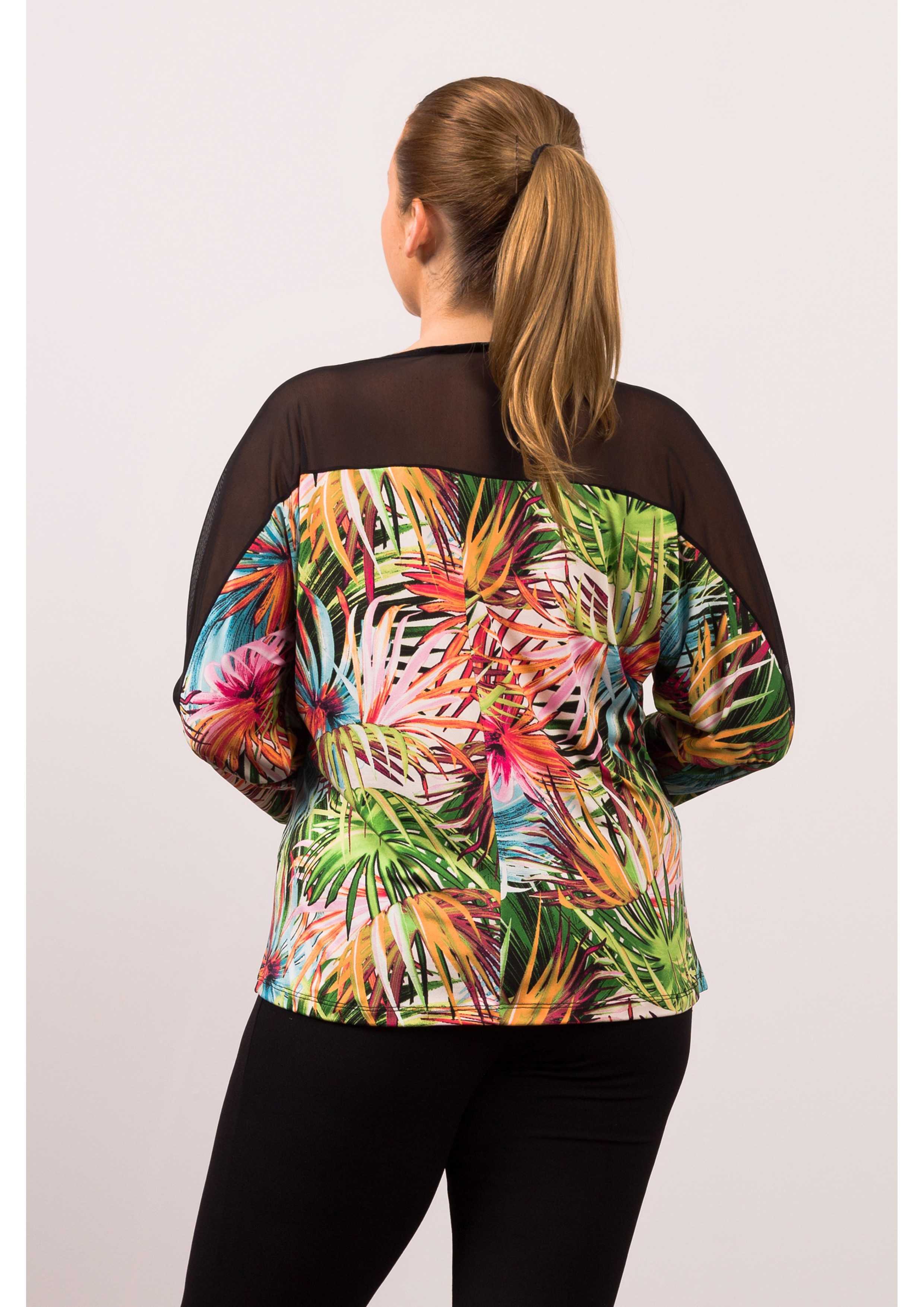Printed knit sweater, batwing sleeves, back opening in smooth tulle. Collection: Spring Summer Available in Plus Sizes Own design and manufacturing product. We are a clothing production brand with over 50 years of experience Model: Height 1.70m and is wearing size 2XL. Composition: 96% Polyester 4% Elastane