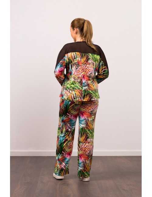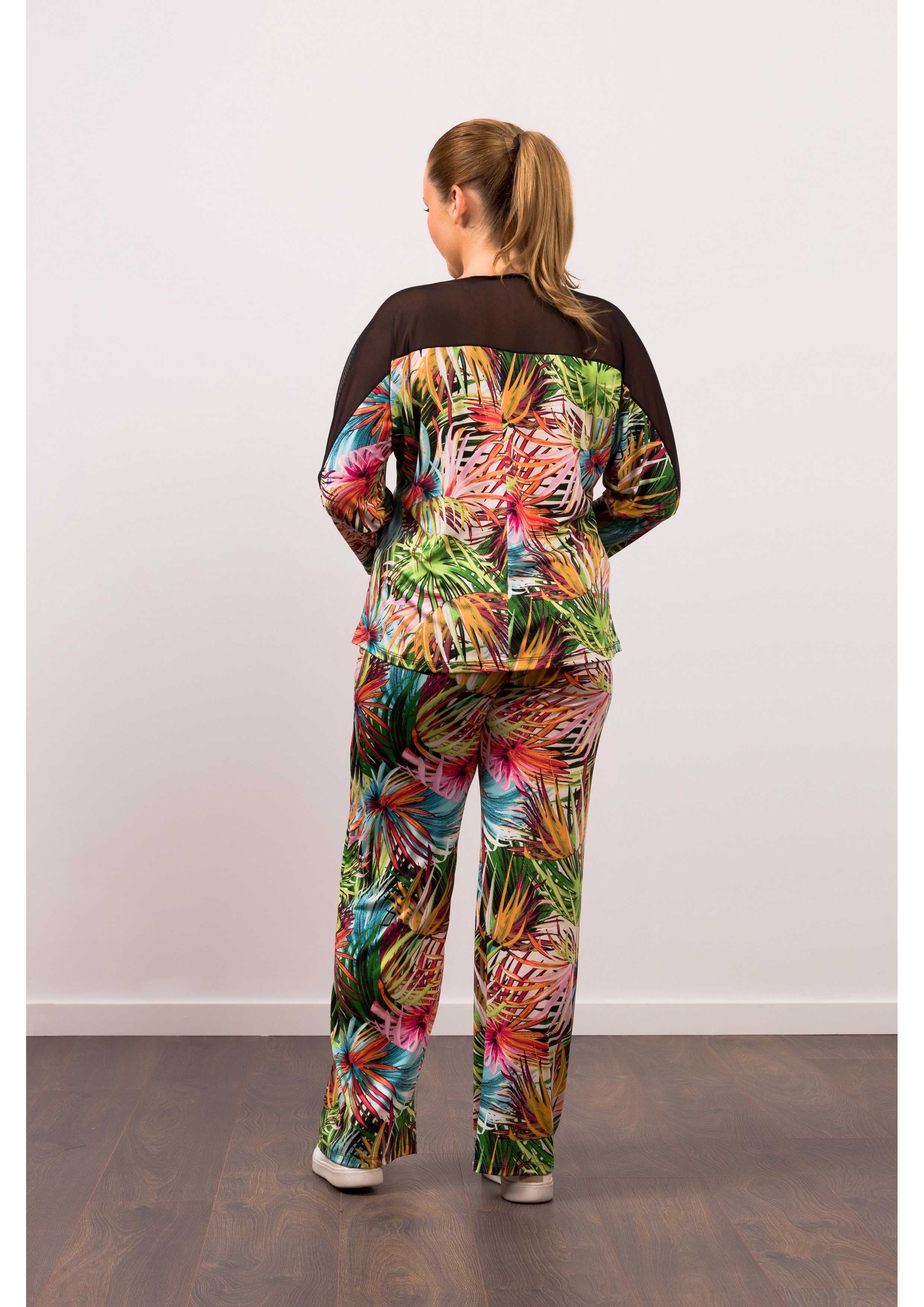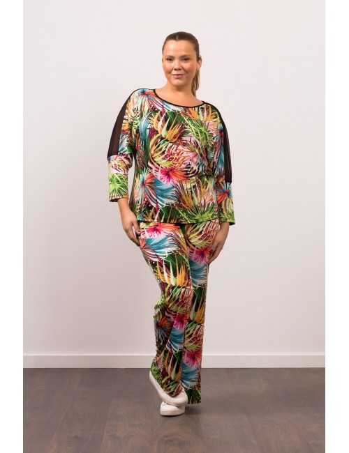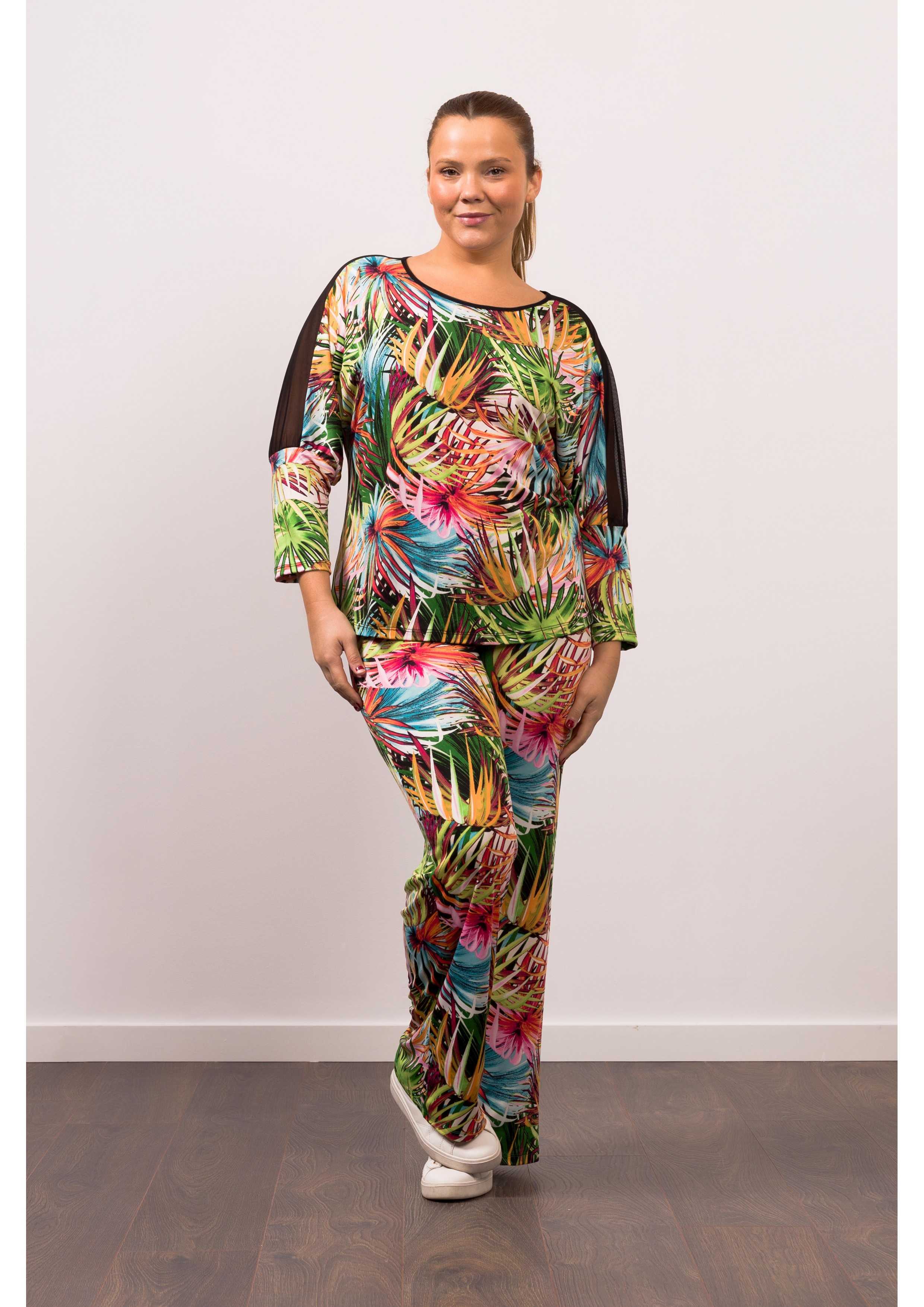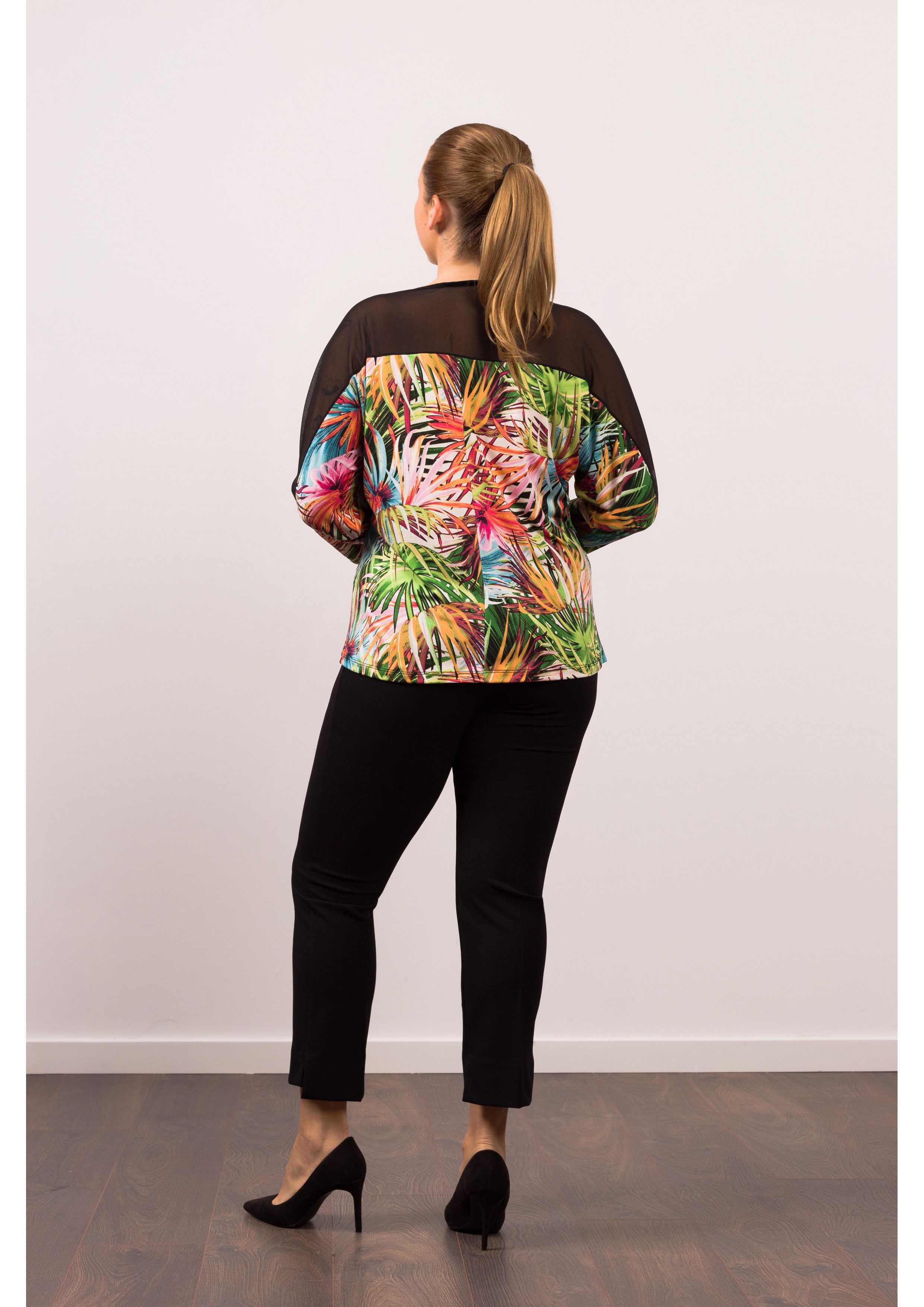 Printed knit sweater, batwing sleeves, back opening in smooth tulle. Collection: Spring Summer Available in Plus Sizes Own design and manufacturing product. We are a clothing production brand with over 50 years of experience Model: Height 1.70m and is wearing size 2XL. Composition: 96% Polyester 4% Elastane