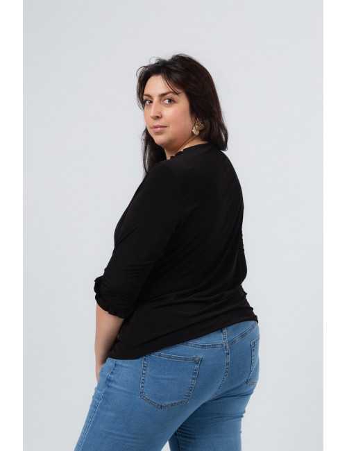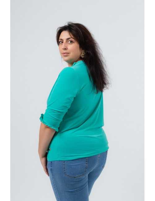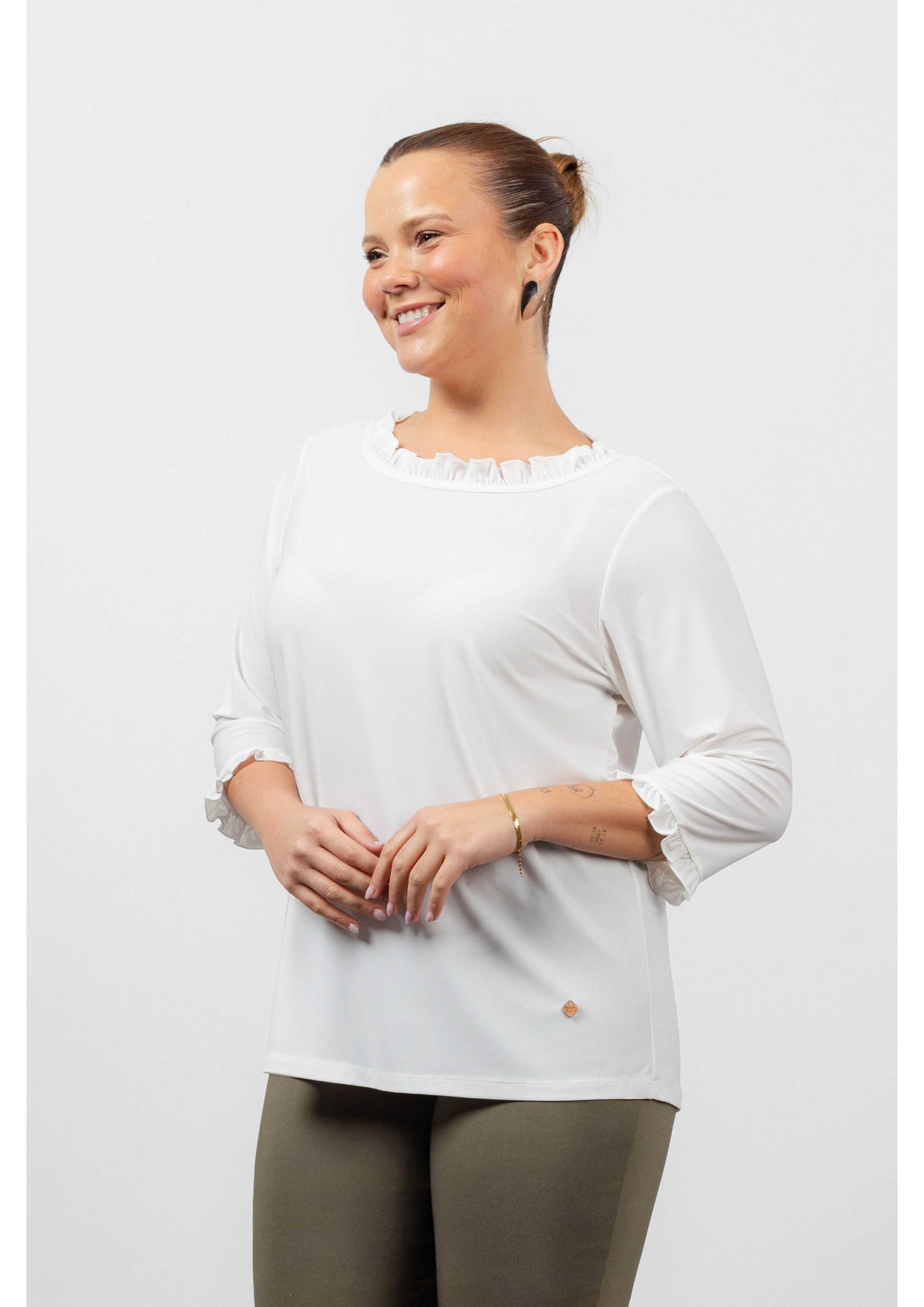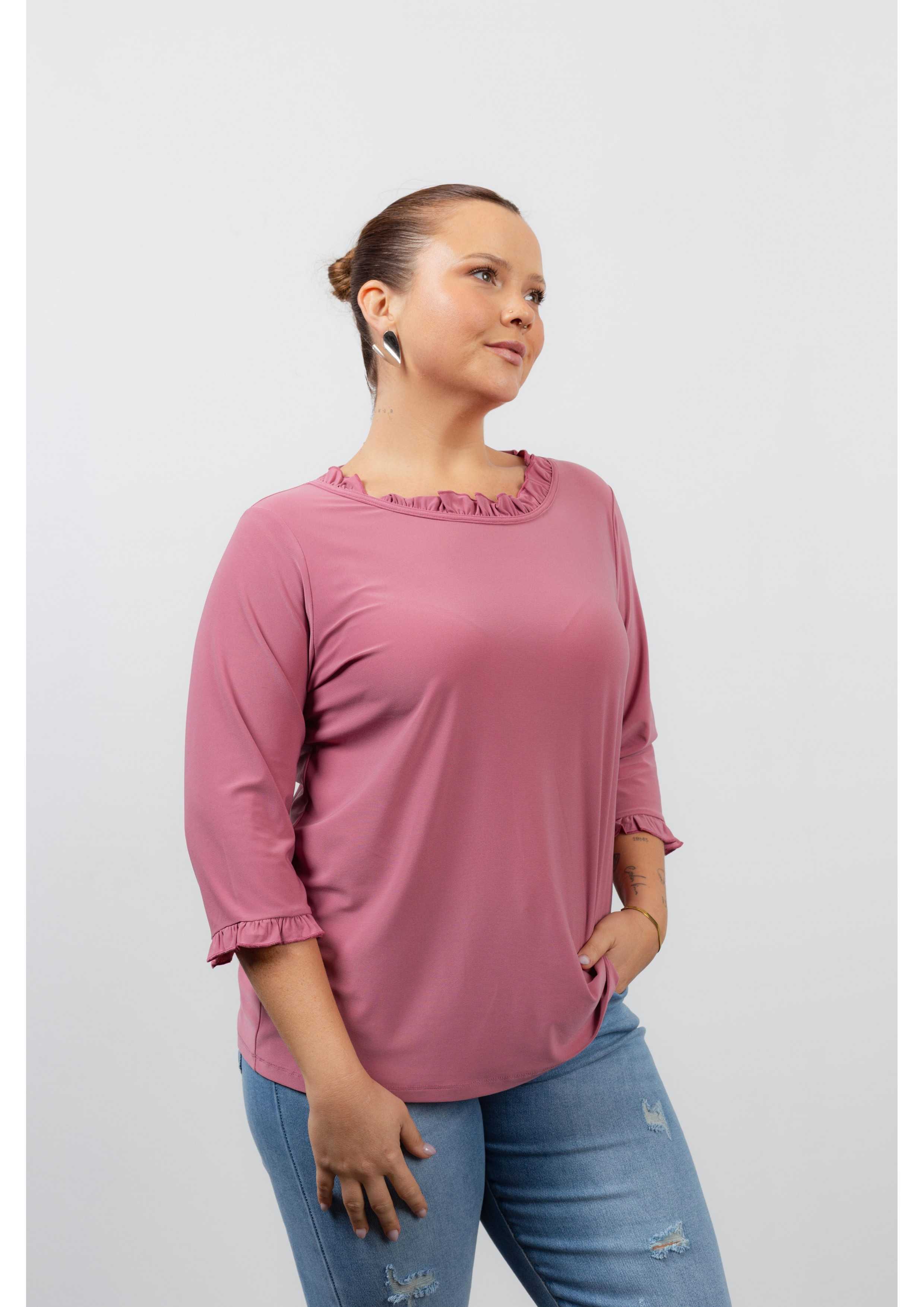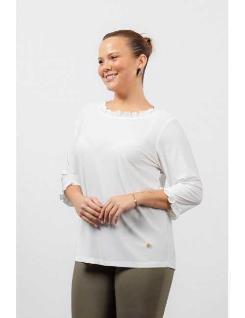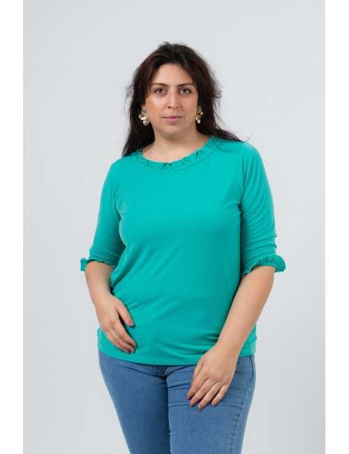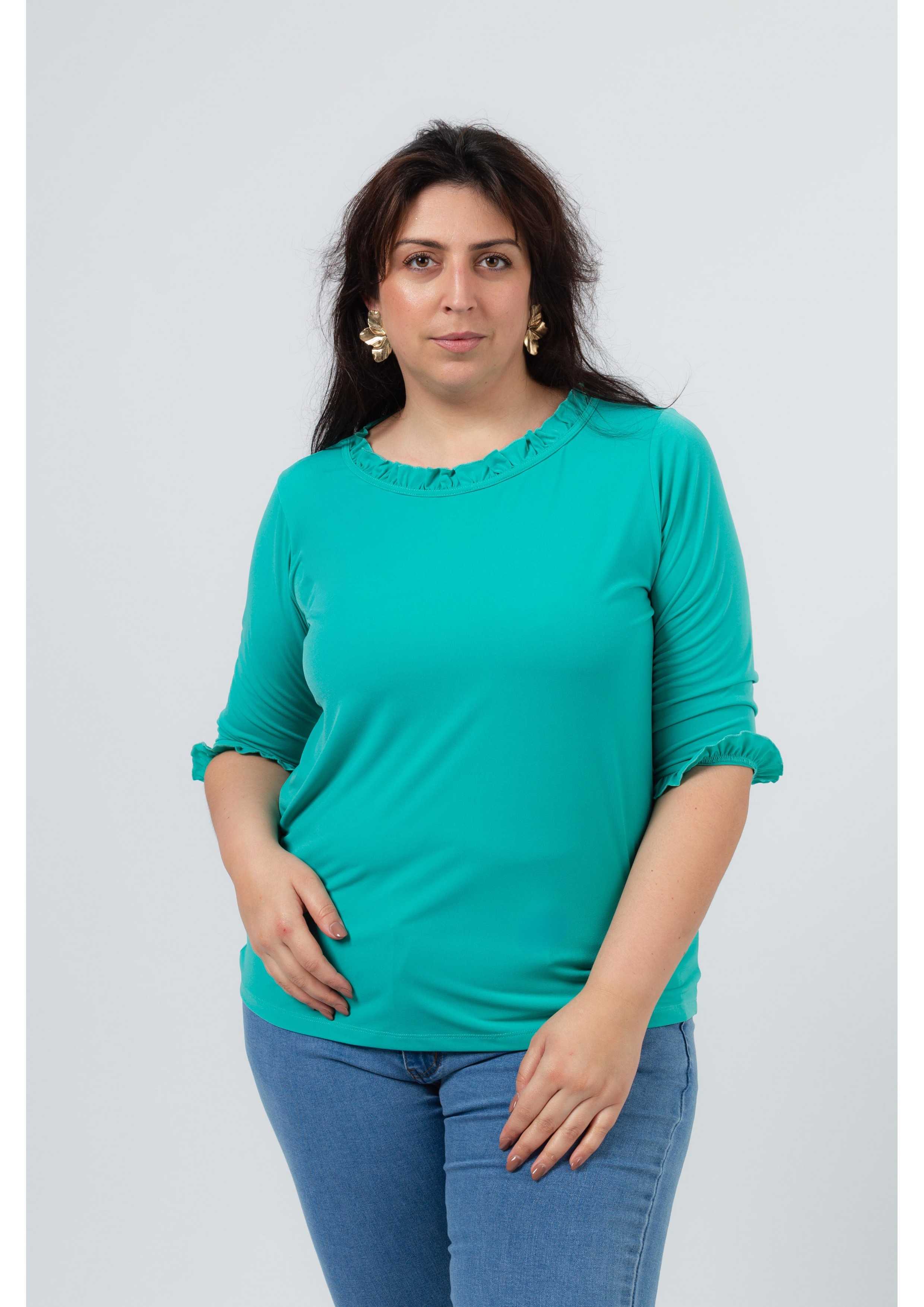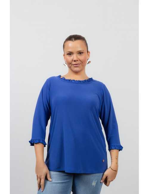 Plain knit sweater with 3/4 sleeves, round neck with ruffle only in the front and on the sleeves. Collection: Spring Summer Available in Plus Sizes Own design and manufacturing product. We are a clothing brand with over 50 years of experience. Model: Height 1.70m and wearing size 2XL. Composition: 94% Polyester 6% Elastane