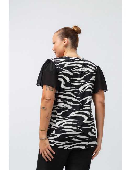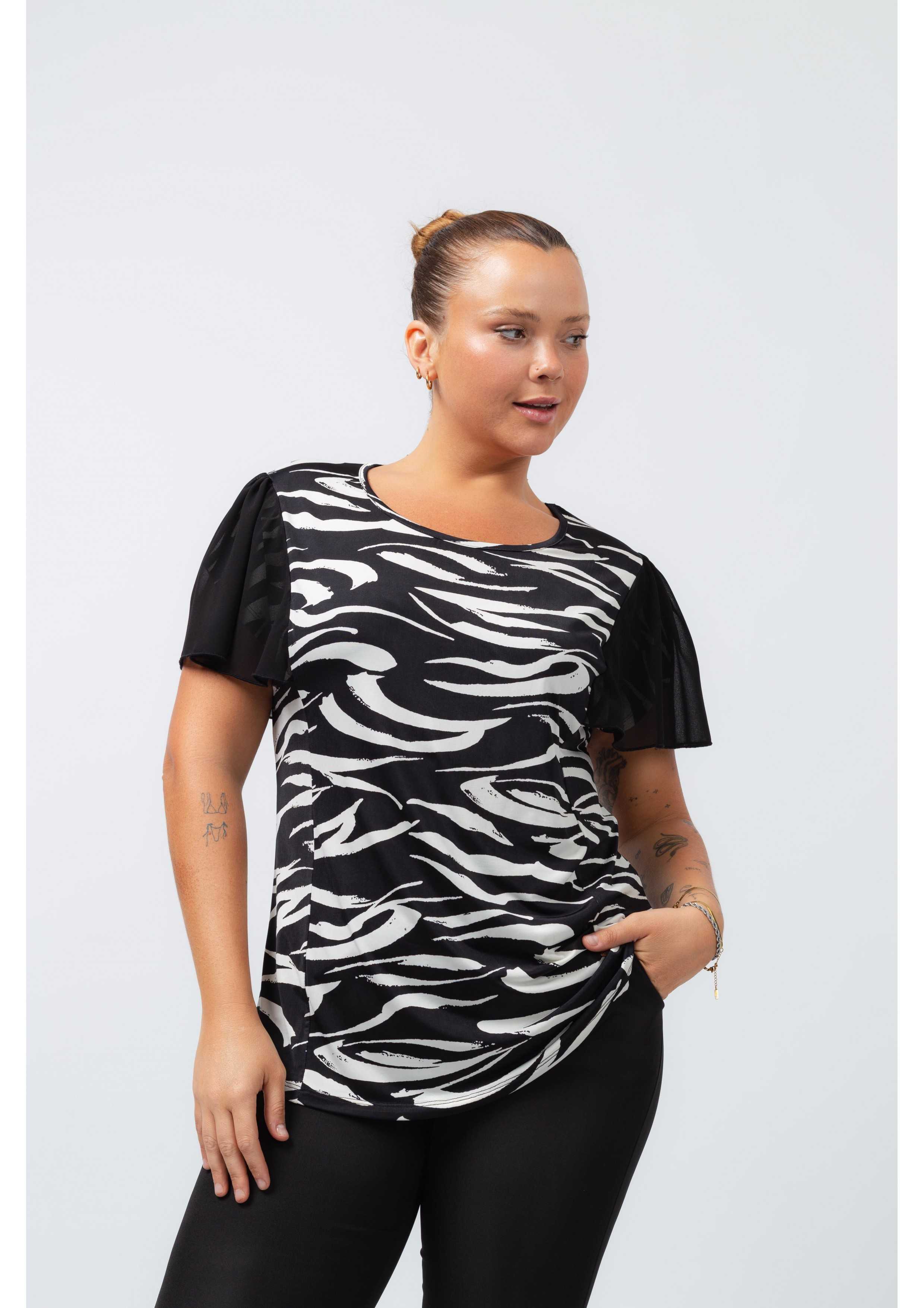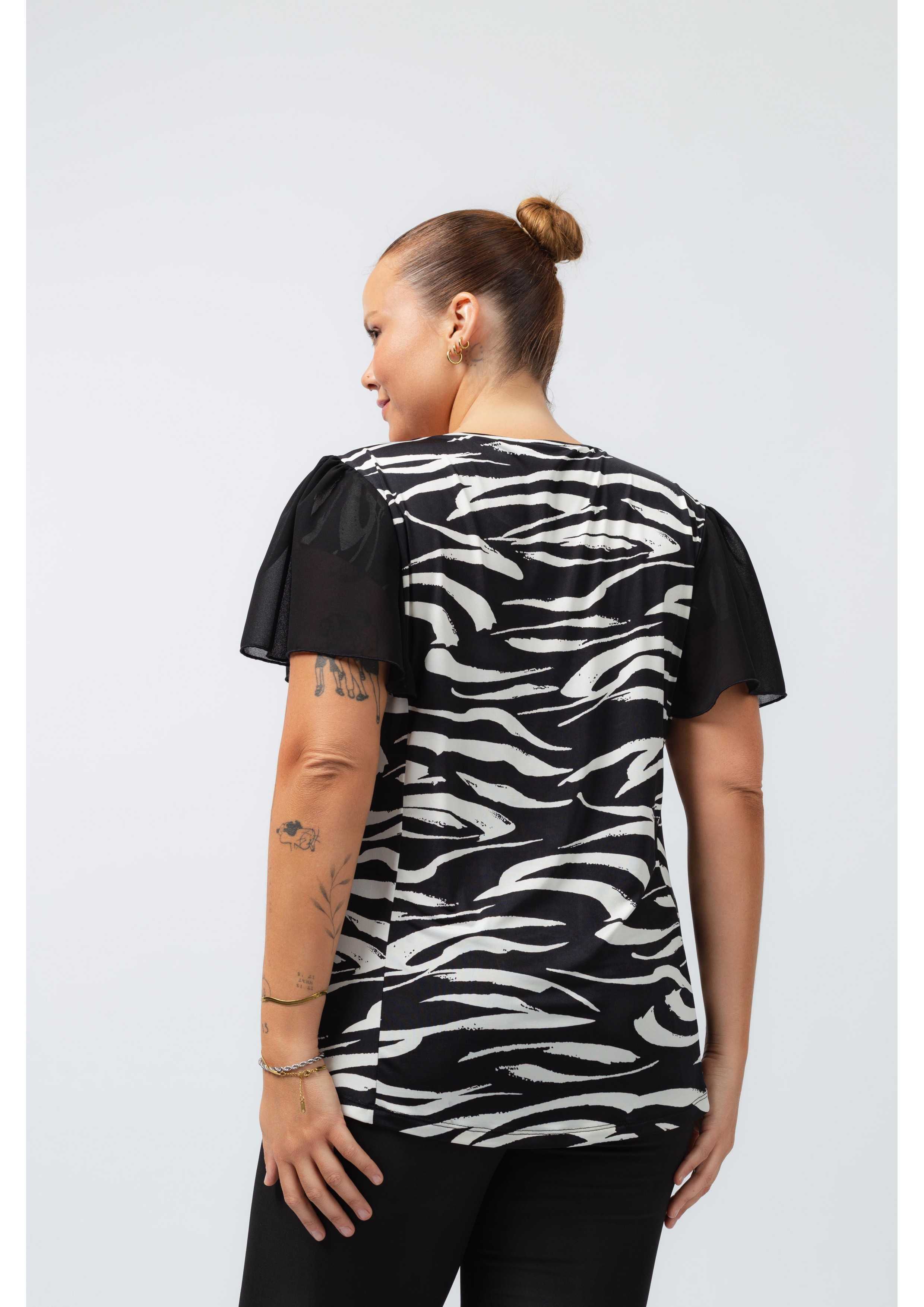 Printed knit tunic, short sleeves, round neckline, featuring an overlay frill on the sleeves made of fine smooth fabric with rolled finish. Collection: Spring Summer Available in Plus Sizes Own design and manufacturing. We are a clothing brand with over 50 years of experience Model: Height 1.70m and is wearing size XL. Composition: 100% Polyester | 94% Polyester 6% Elastane