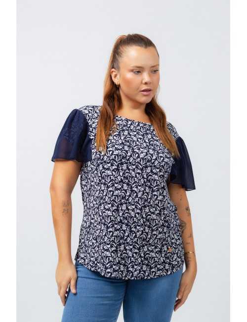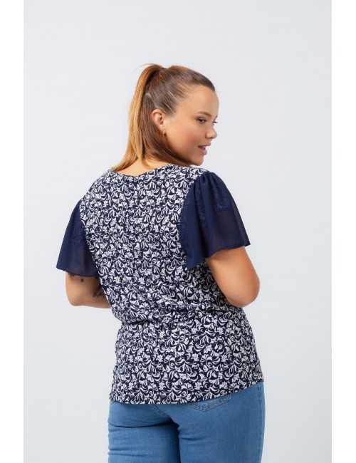 Printed knit sweater with silver dots, short sleeves, round neckline, featuring a layered ruffle on the sleeves made of fine smooth fabric with a rolled hem. Collection: Spring Summer Available in Plus Sizes Own design and manufacturing product. We are a clothing brand with over 50 years of experience. Model: Height 1.70m and wearing size XL. Composition: 100% Polyester | 94% Polyester 6% Elastane