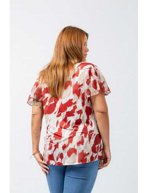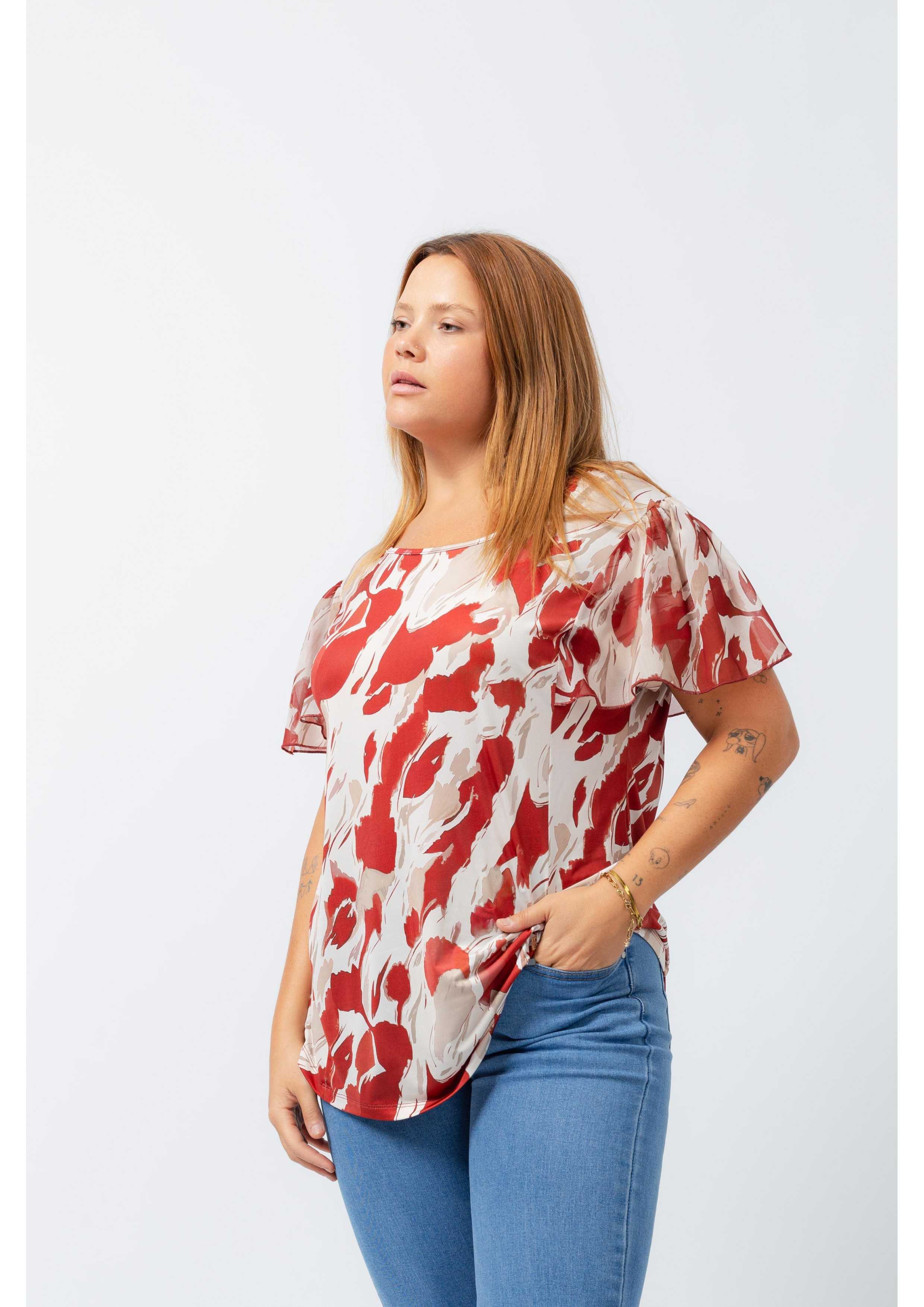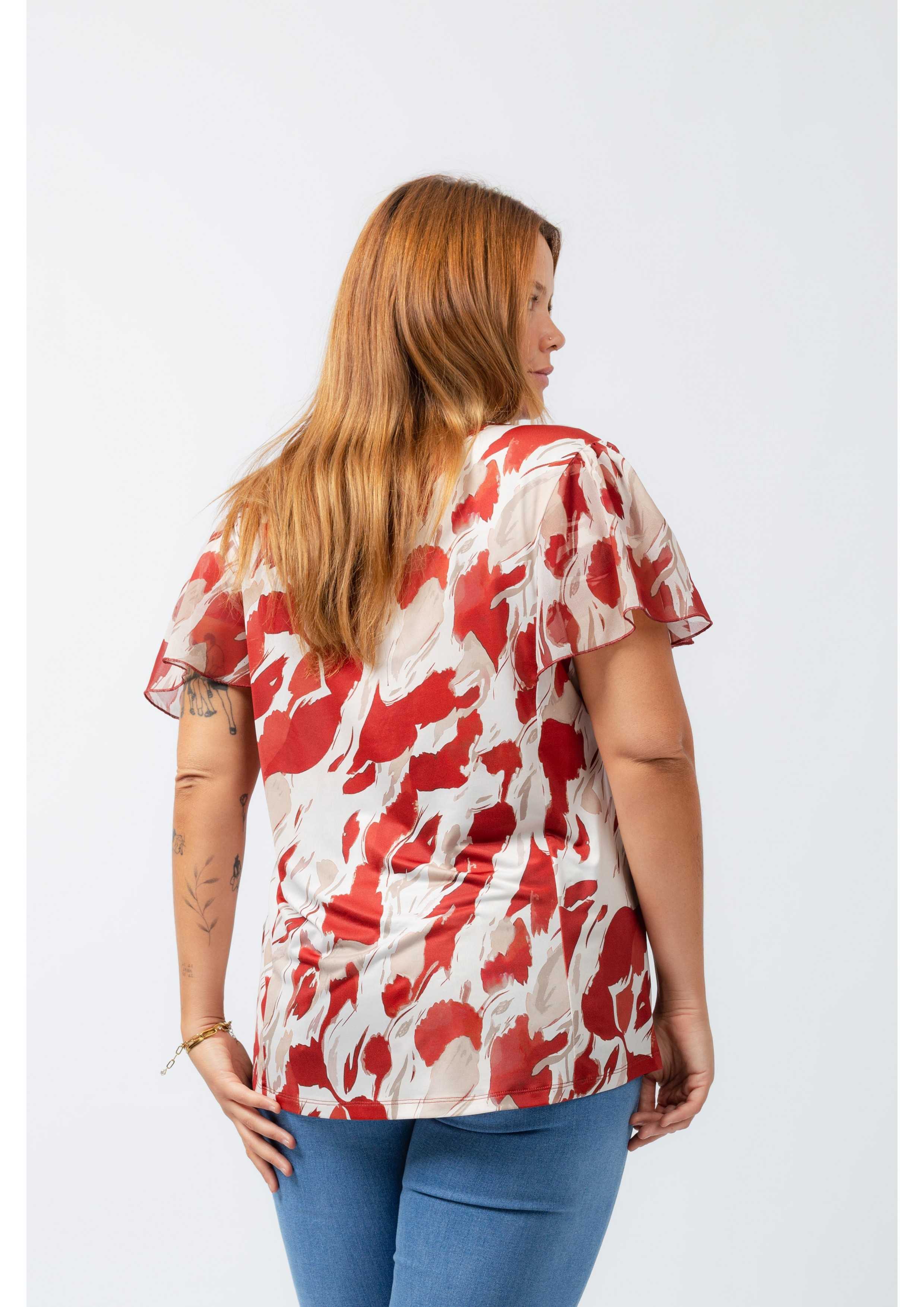 Printed knit top, round neckline, features an overlay ruffle at the sleeve area in a fine fabric also printed with a rolled hem finish. Collection: Spring Summer Available in Plus Sizes Own design and manufacturing product. We are a clothing manufacturing brand with over 50 years of experience. Model: Height 1.70m and wearing size XL. Composition: 100% Polyester | 95% Polyester 5% Elastane