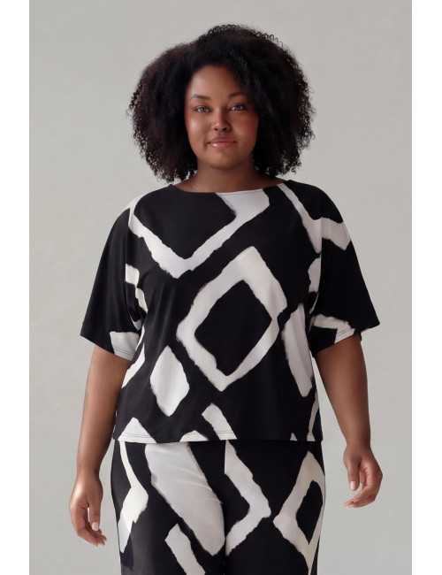 Printed knit sweater, batwing sleeves, back cut, slightly boat neckline.