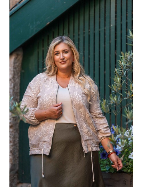 Plain knit top, V-neck, with cutaway shoulders in metallic lace. Collection: Spring Summer Model: Height 1.70m wearing size 2XL, in white Model: Height 1.65m wearing size 3XL, in beige Plain: 94% Viscose 6% Elastane | Shine: 37% Polyester 37% Cotton 1% Elastane