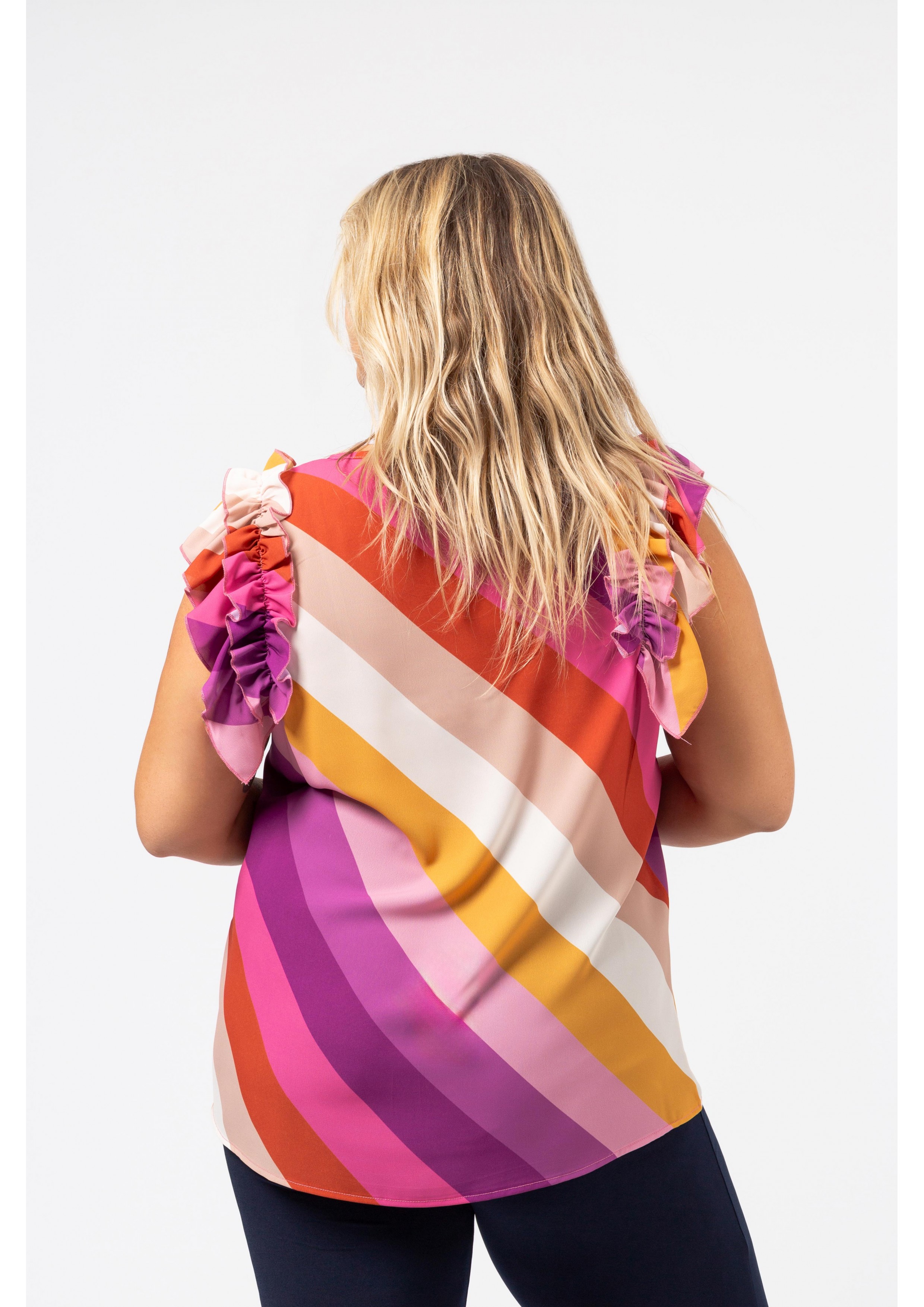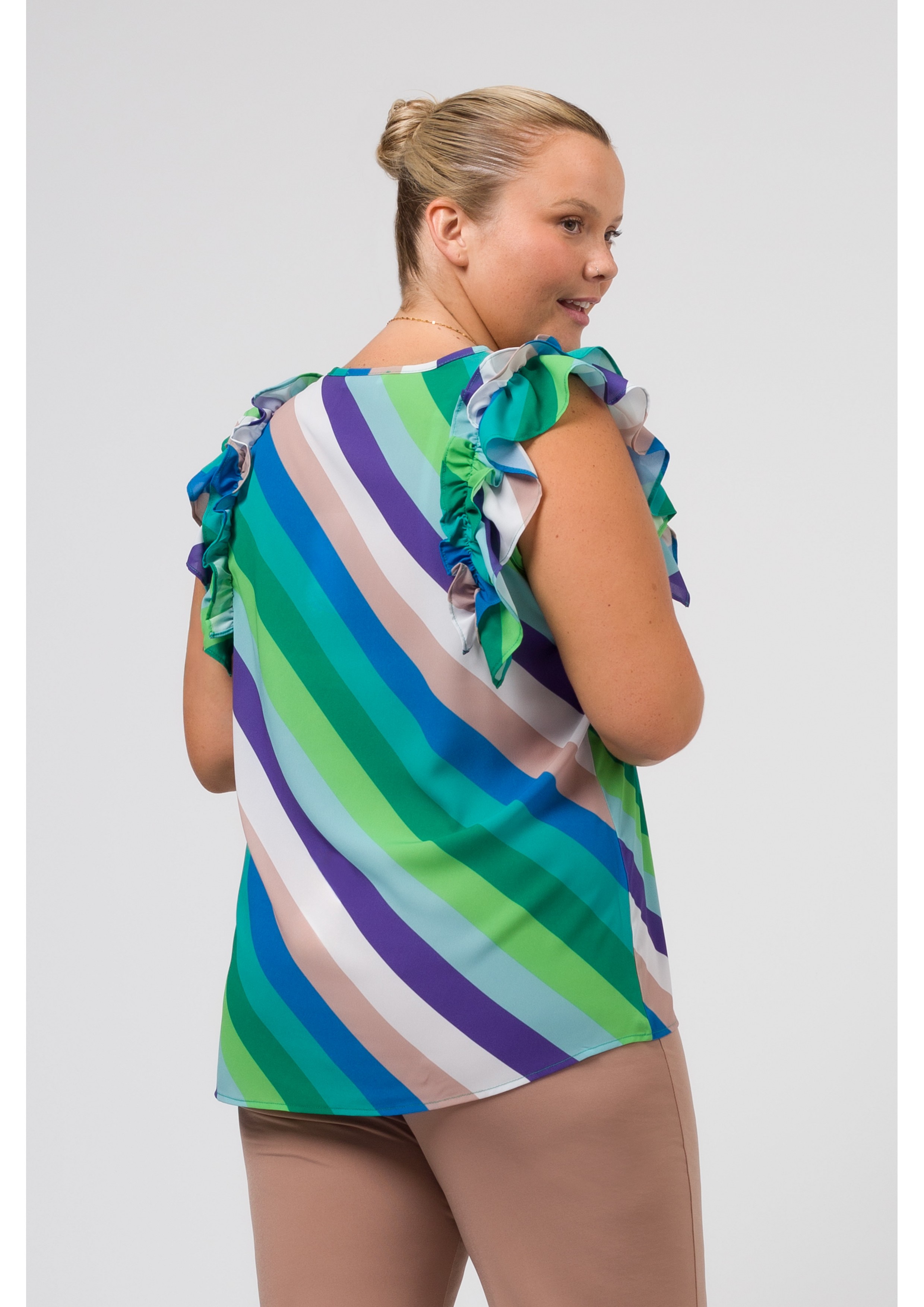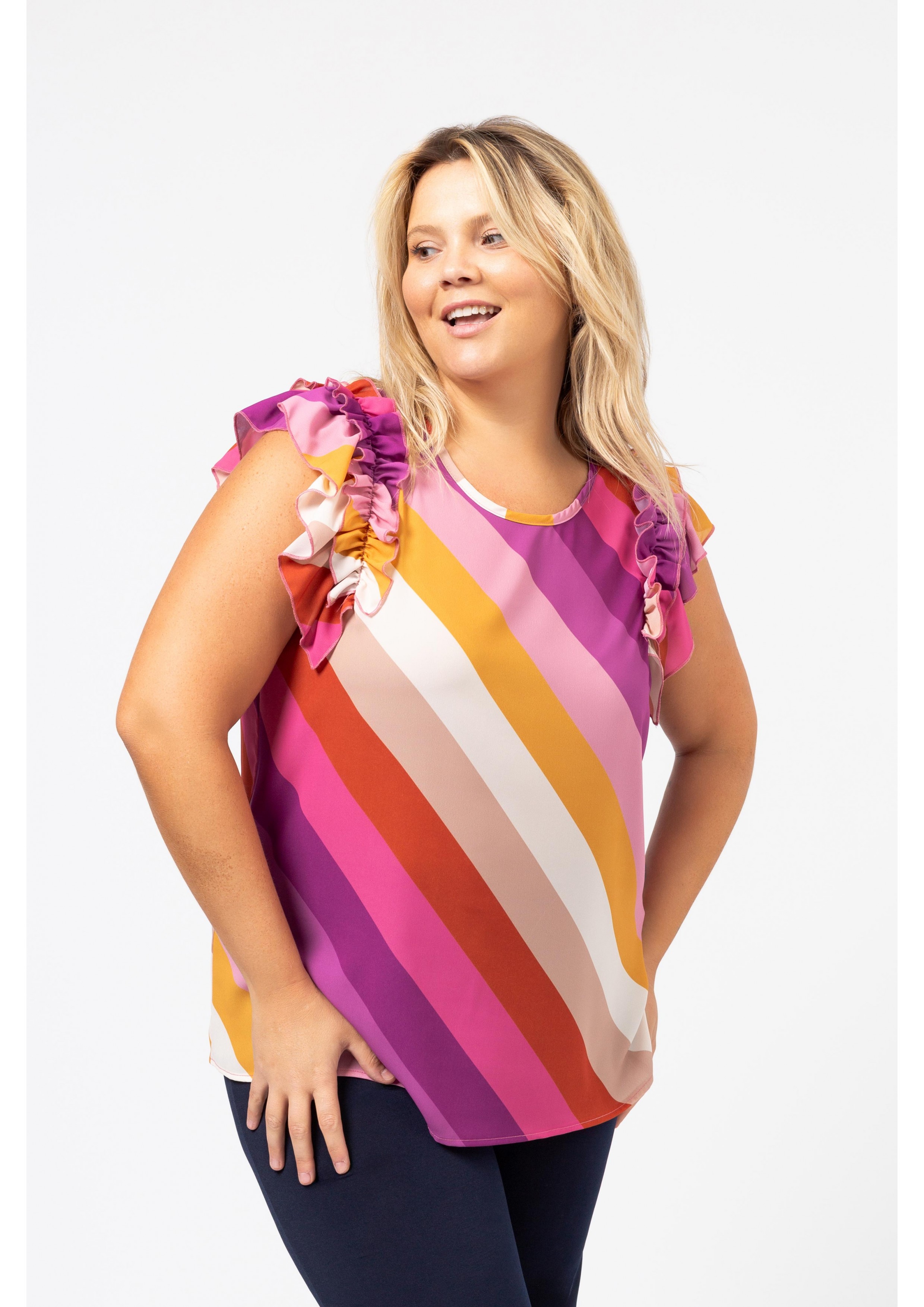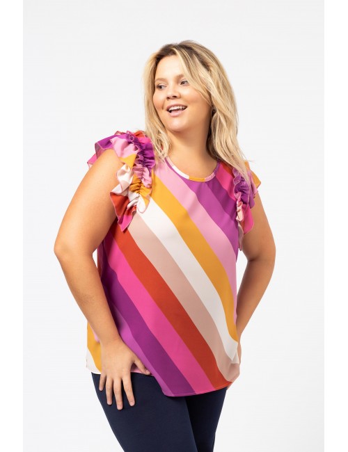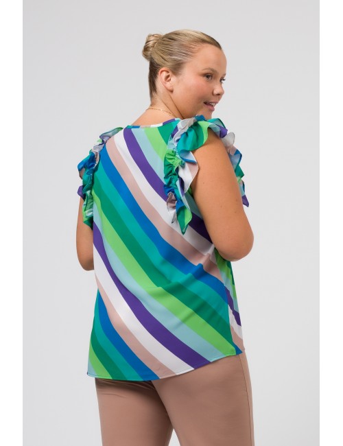 Printed fabric top, double ruffle on the shoulders, round neckline. Collection: Spring Summer Model: Height 1.70m and is wearing size 2XL.