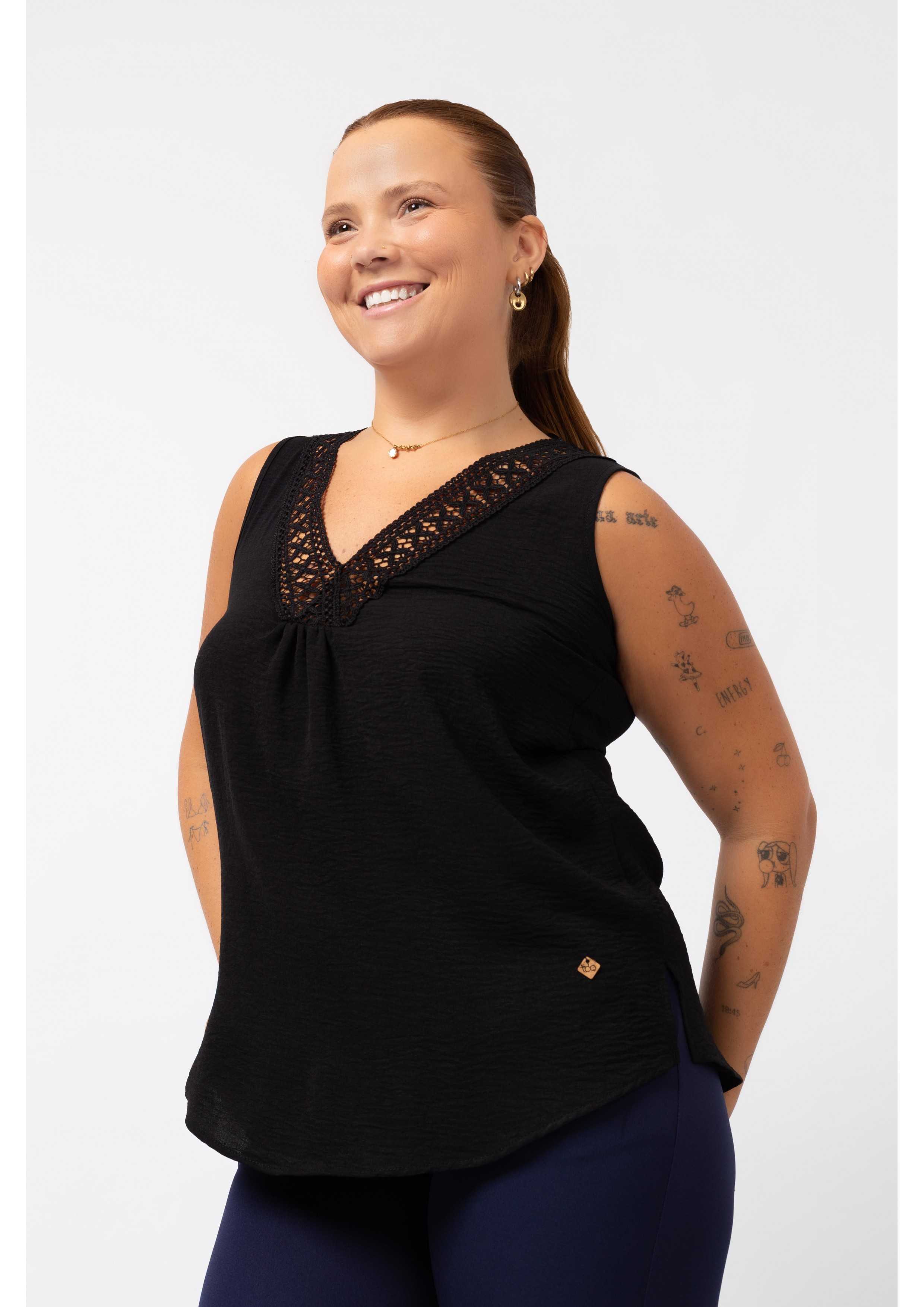 Plain fabric top, V-neck with lace application. Side slits. Collection: Spring Summer Available in Plus Sizes Own design and manufacturing product. We are a clothing brand with over 50 years of experience Model: Height 1.70m and wearing size XL. Composition: 100% Polyester
