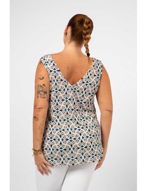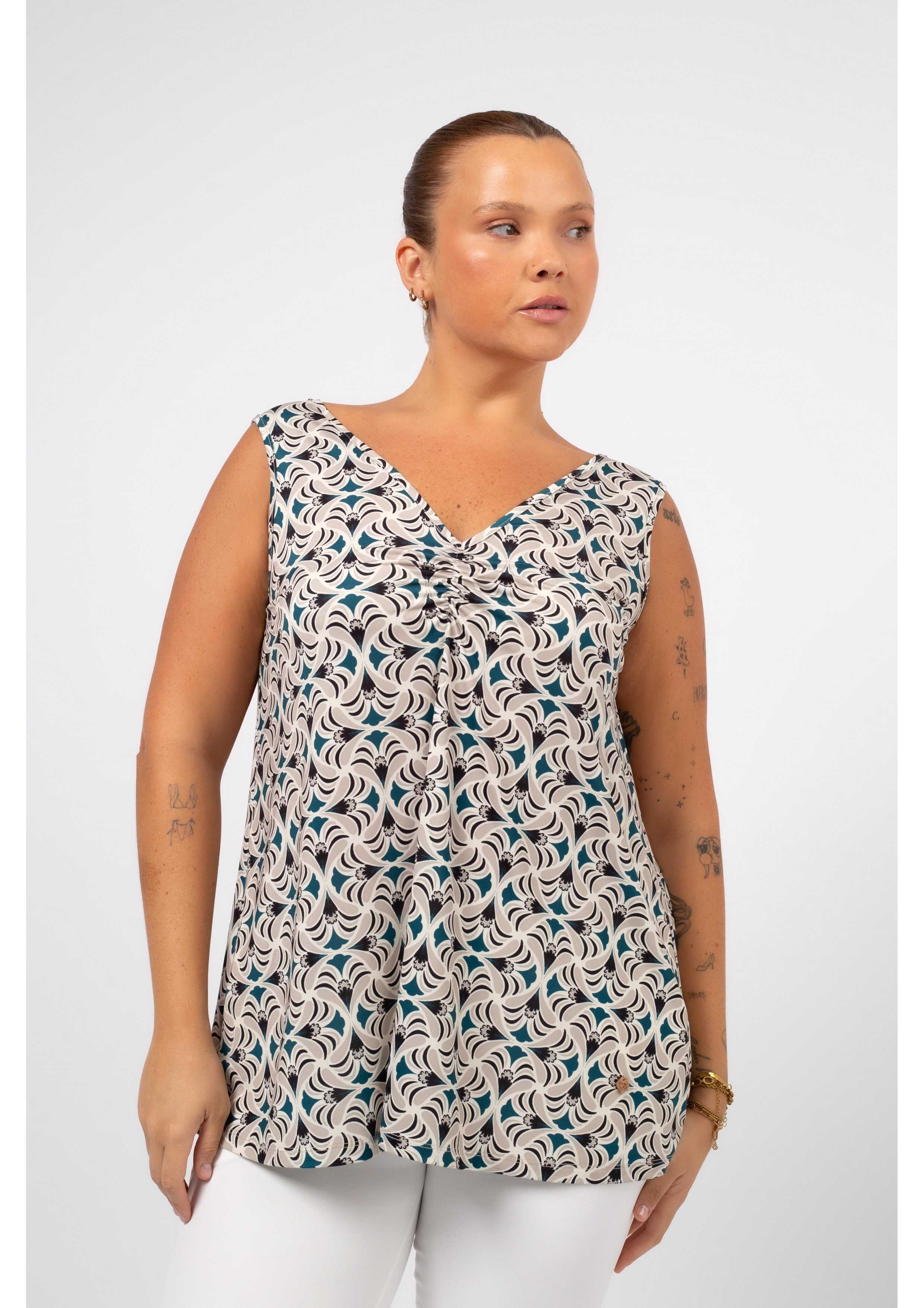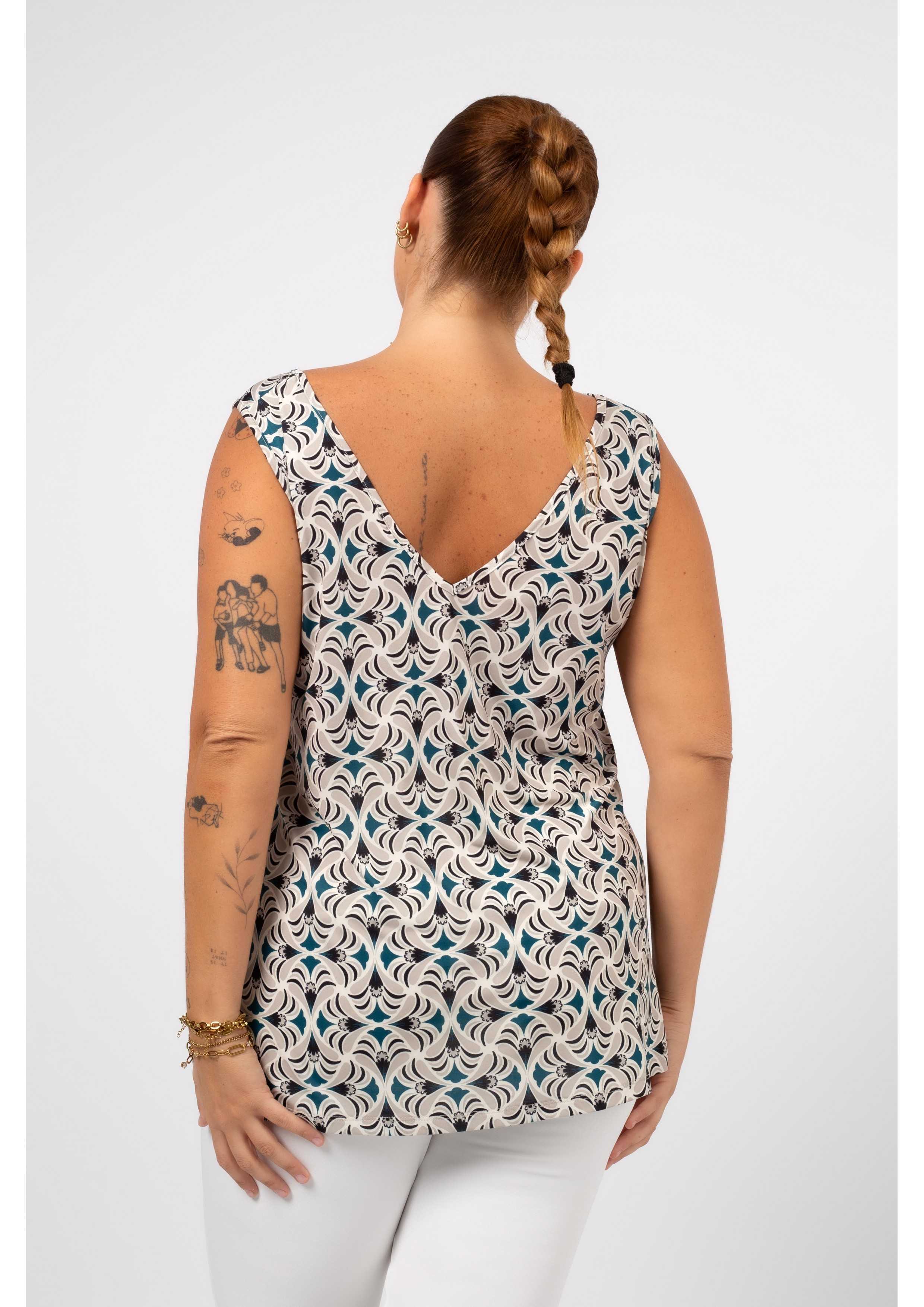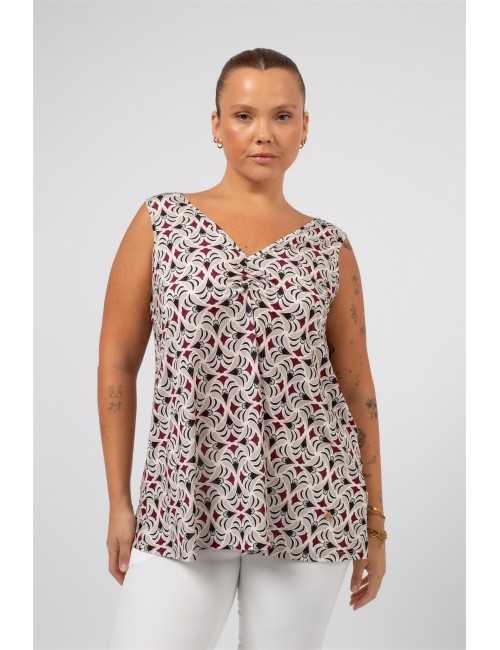 Printed knit top, V-neck front and back, with a small ruffle and elastic at the front neckline. Collection: Spring Summer Available in Plus Sizes Product designed and manufactured by us. We are a clothing brand with over 50 years of experience Model: Height 1.70m and wearing size L. Composition: 94% Polyester 6% Elastane