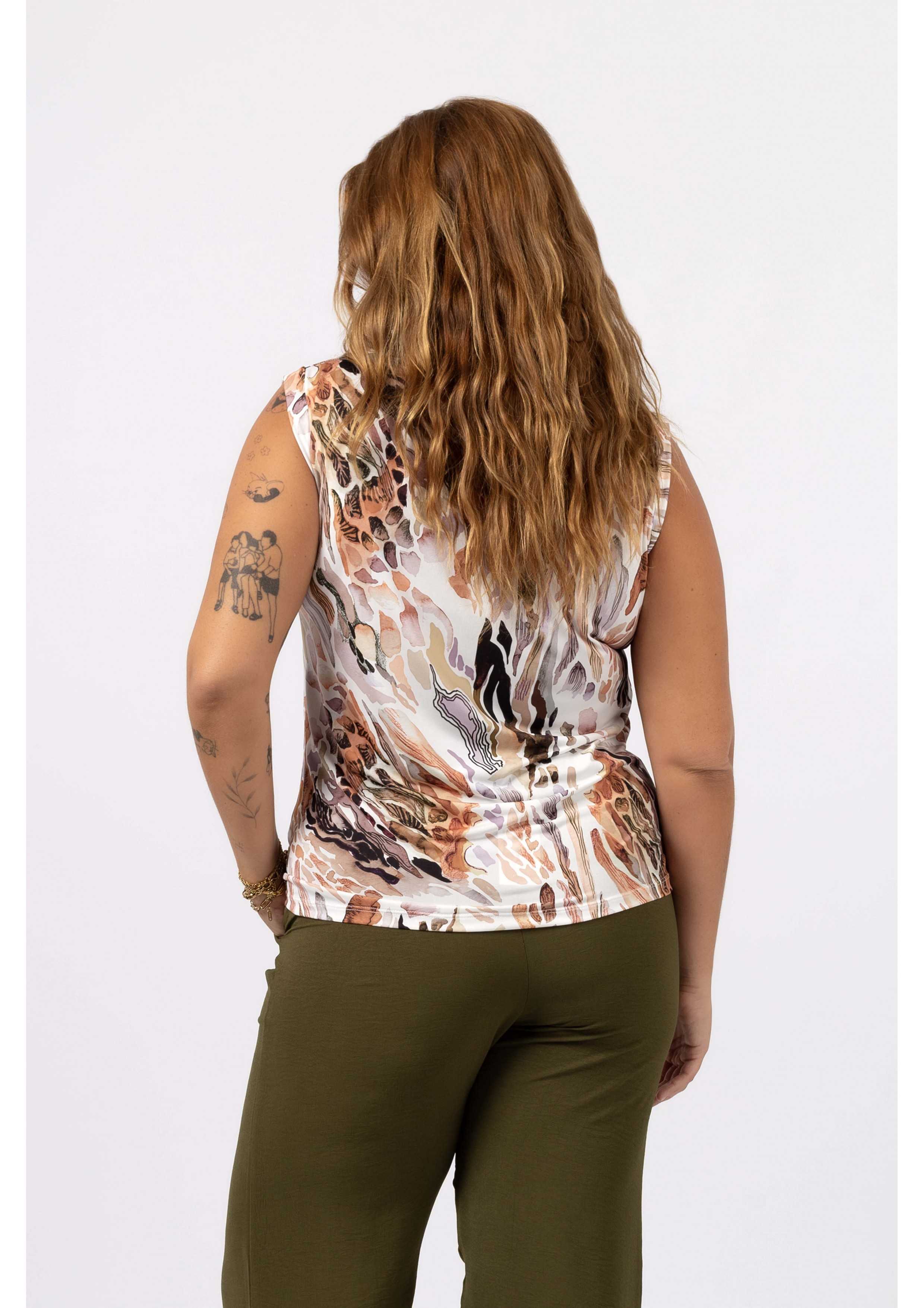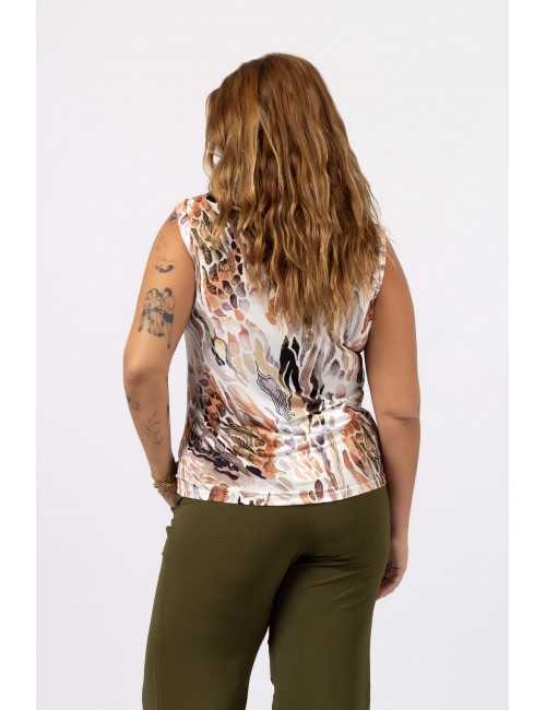 Printed knit top, round neckline, small folded and set-in sleeve. Collection: Spring Summer Available in Plus Sizes Own design and manufacturing product. We are a clothing brand with over 50 years of experience Model: Height 1.70m and wearing size XL. Composition: 94% Polyester 6% Elastane