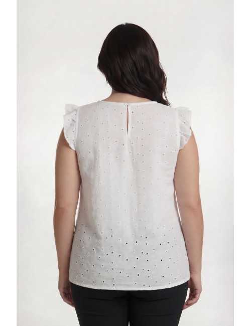 Top in embroidered English fabric, V-neck with inner facing, side slits, gathered ruffle on shoulders. Available in Plus Sizes Product of our own design and manufacture. We are a clothing manufacturing brand with over 50 years of experience Composition: |