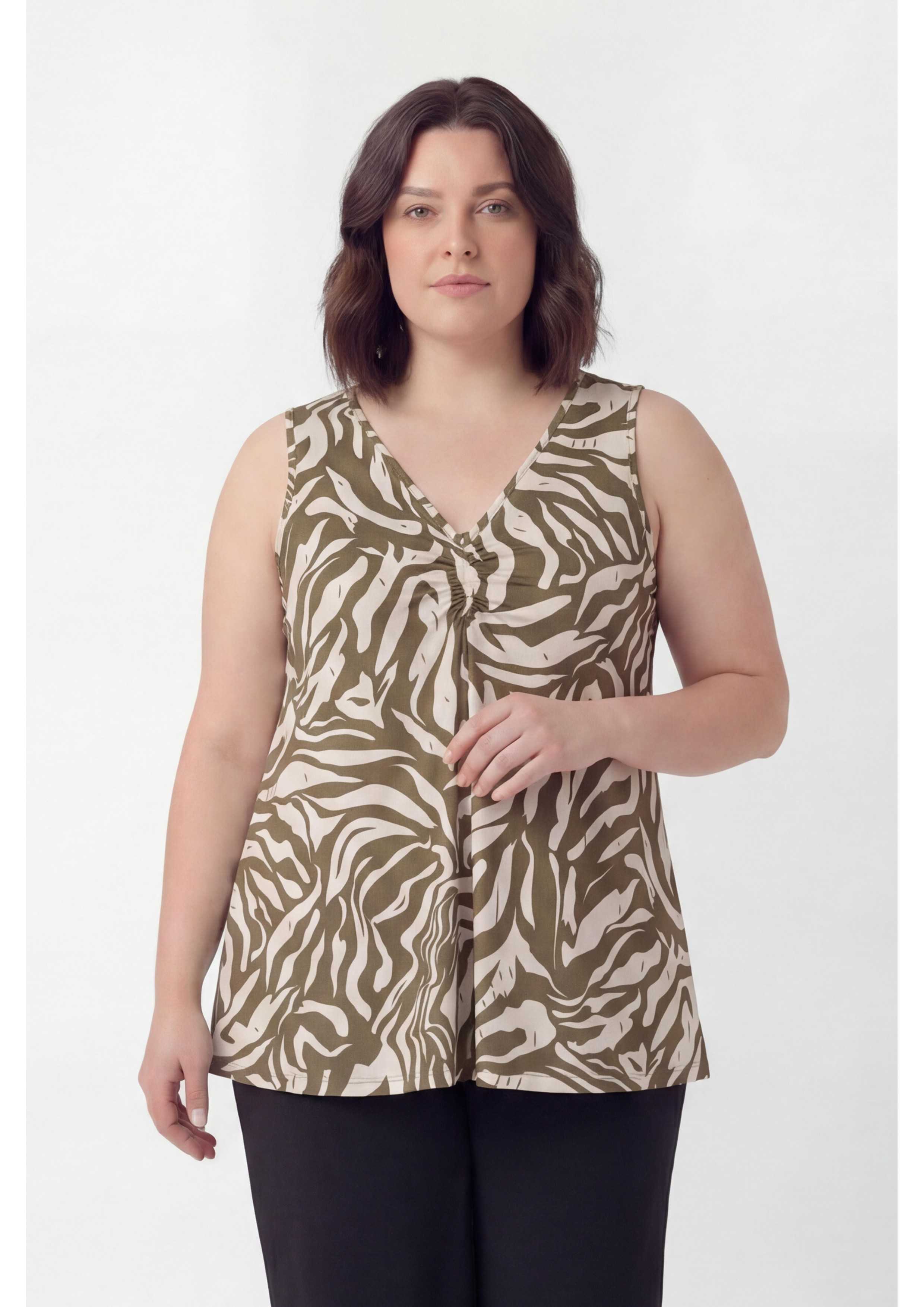 Printed knit top, V-neckline front and back, small silicone gather on the front neckline. Flared model. Available in Plus Sizes Product of our own design and manufacture. We are a clothing manufacturing brand with over 50 years of experience