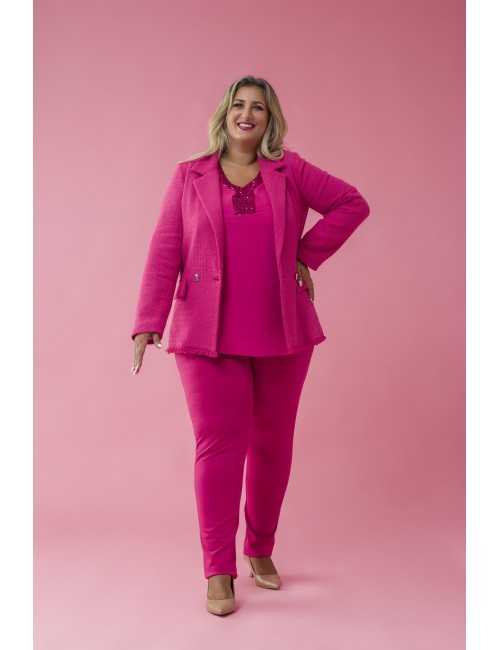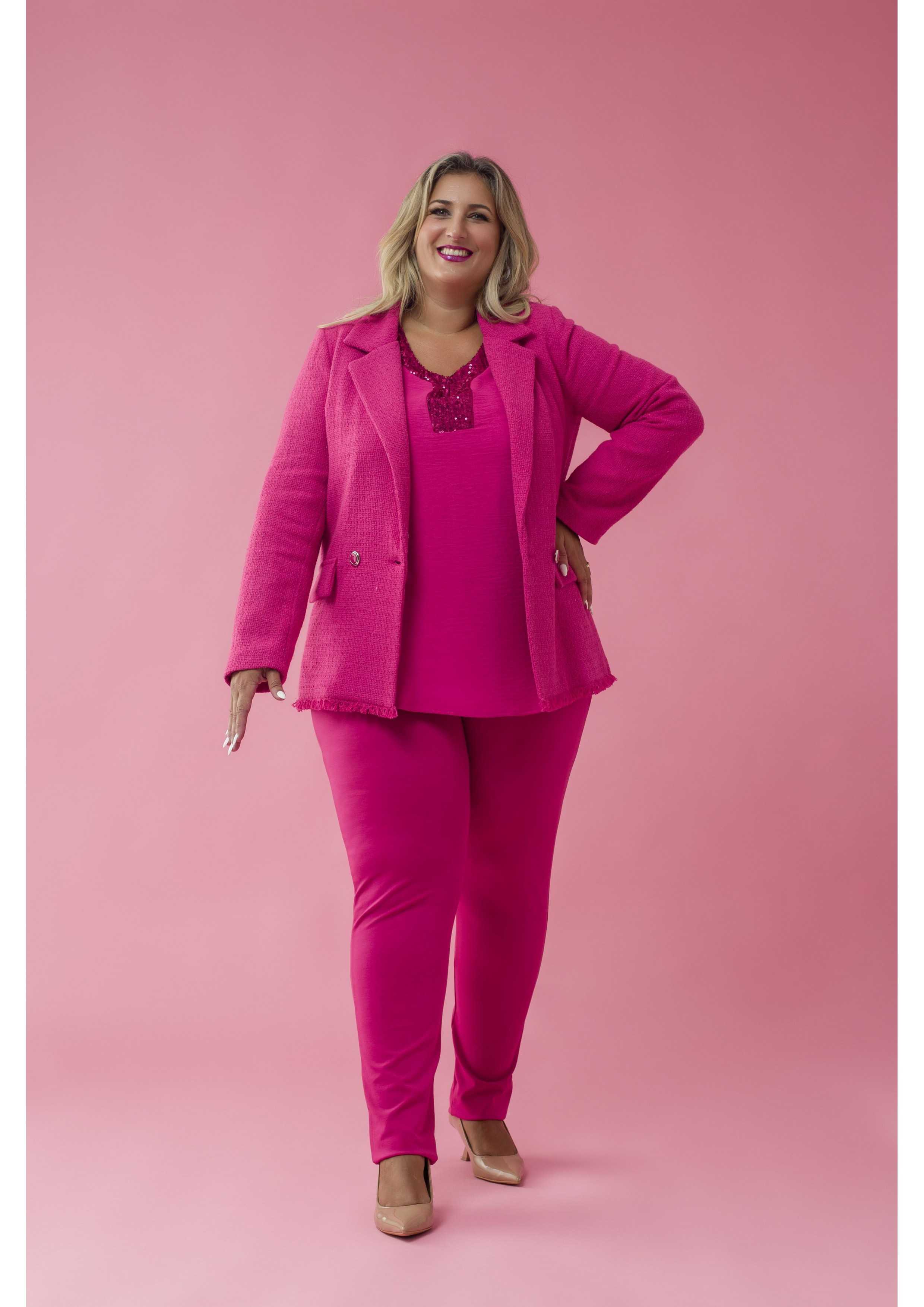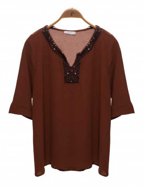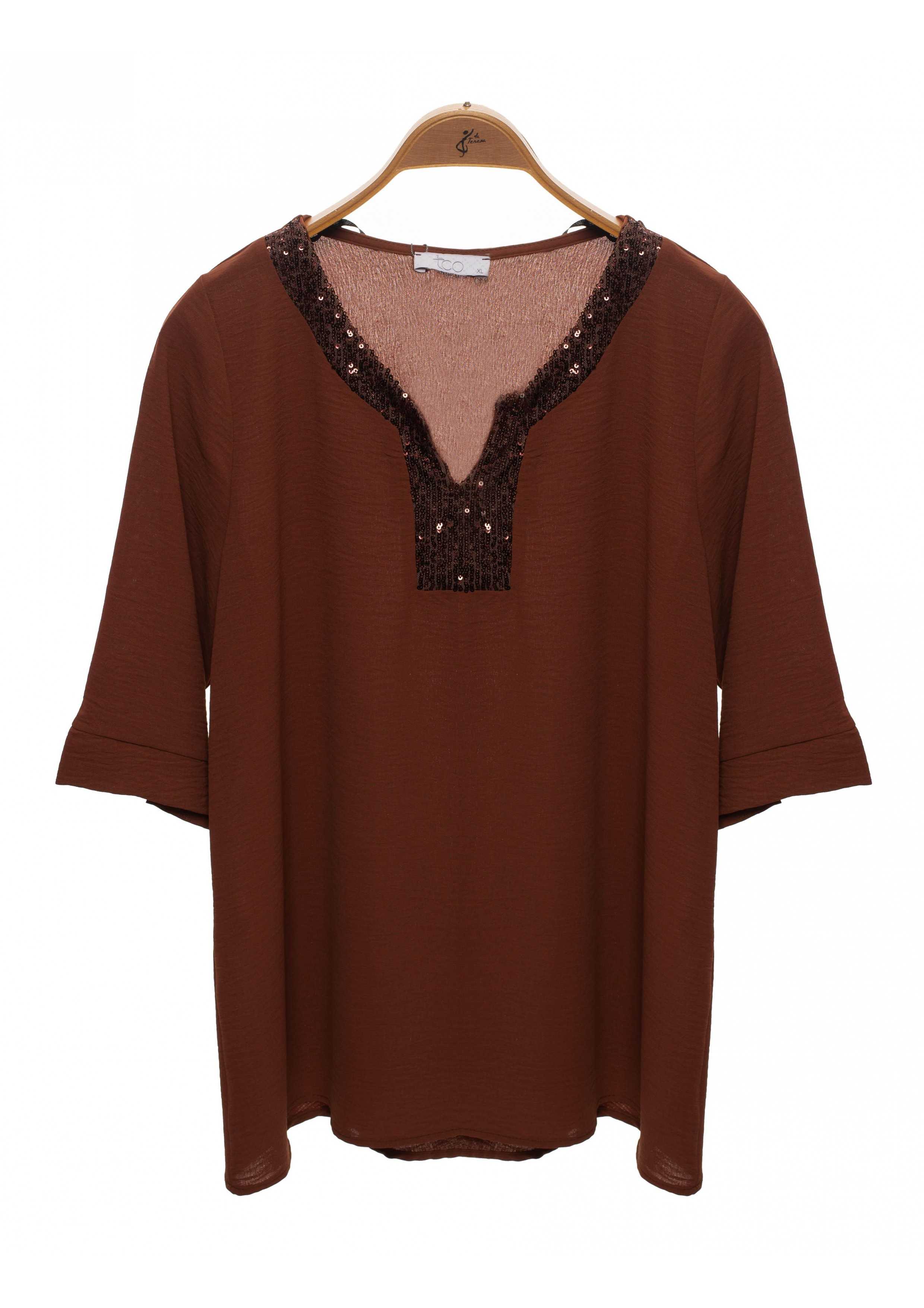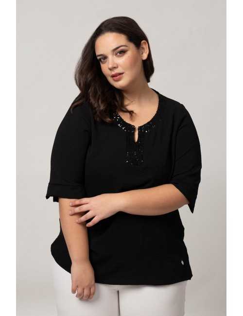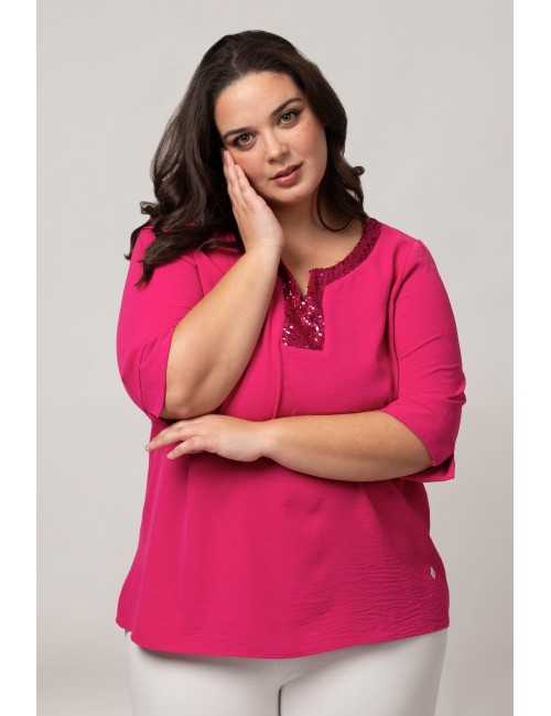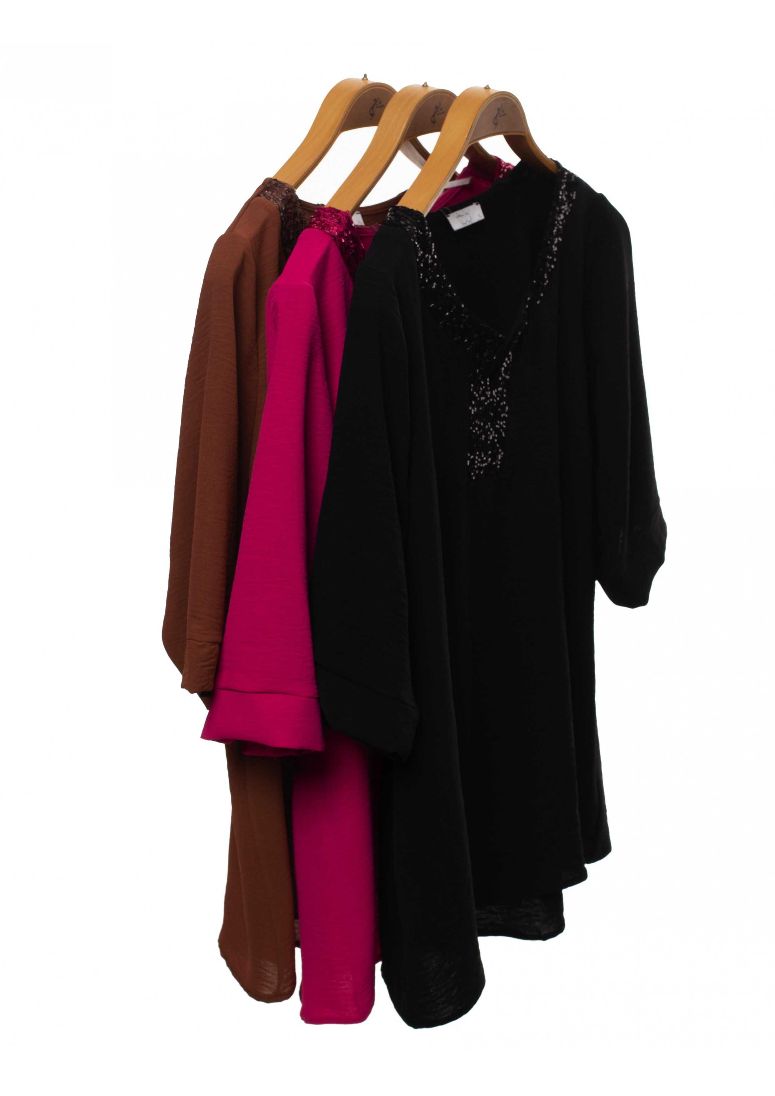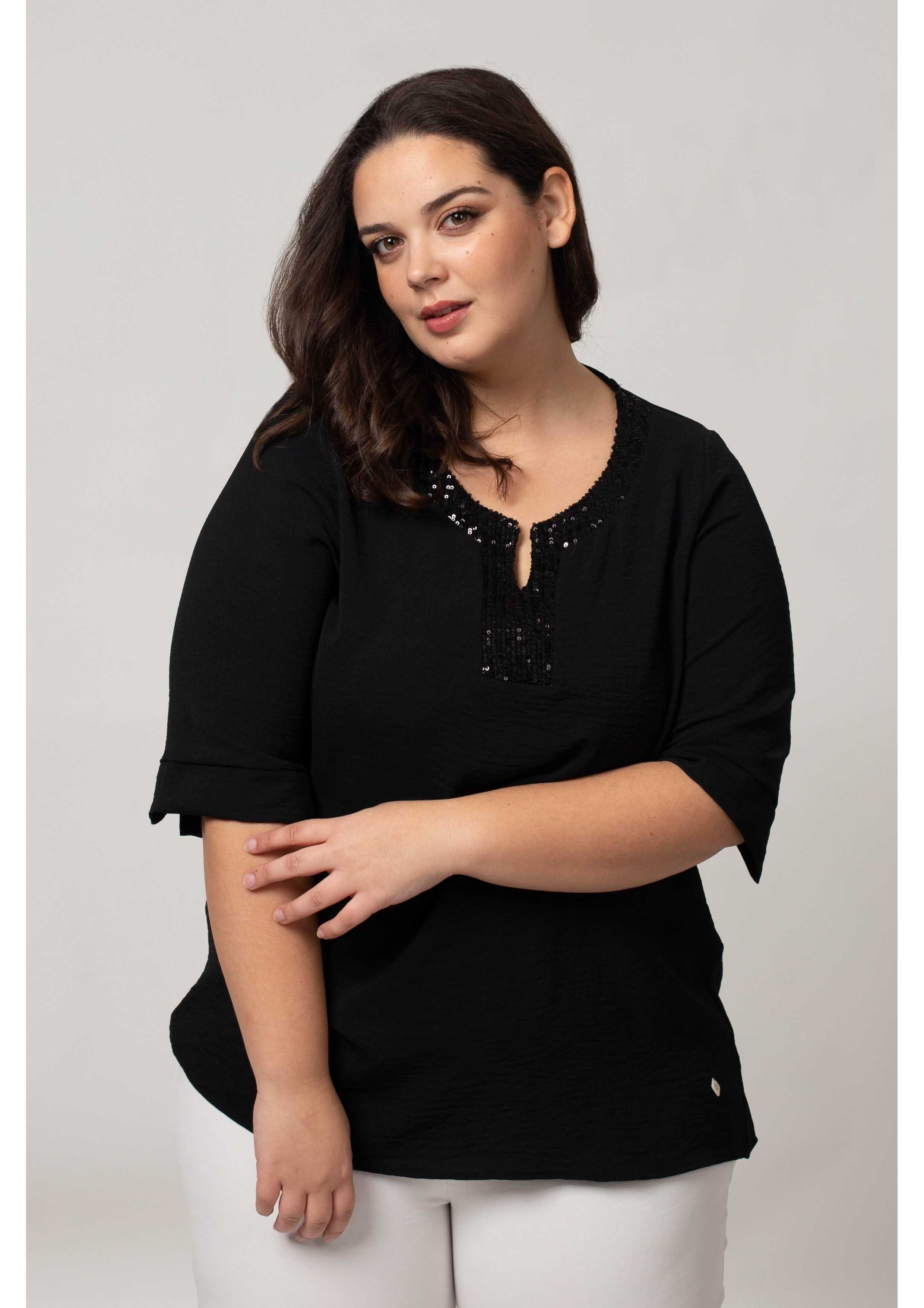 Tunic in 3/4 sleeve fabric with cuffs. Slightly open neckline with sequins. Collection: Spring Summer Available in Plus Sizes Own design and manufacturing product. We are a clothing manufacturing brand with over 50 years of experience. Composition: 100% Polyester / Sequins: 93% Polyester 7% Elastane
